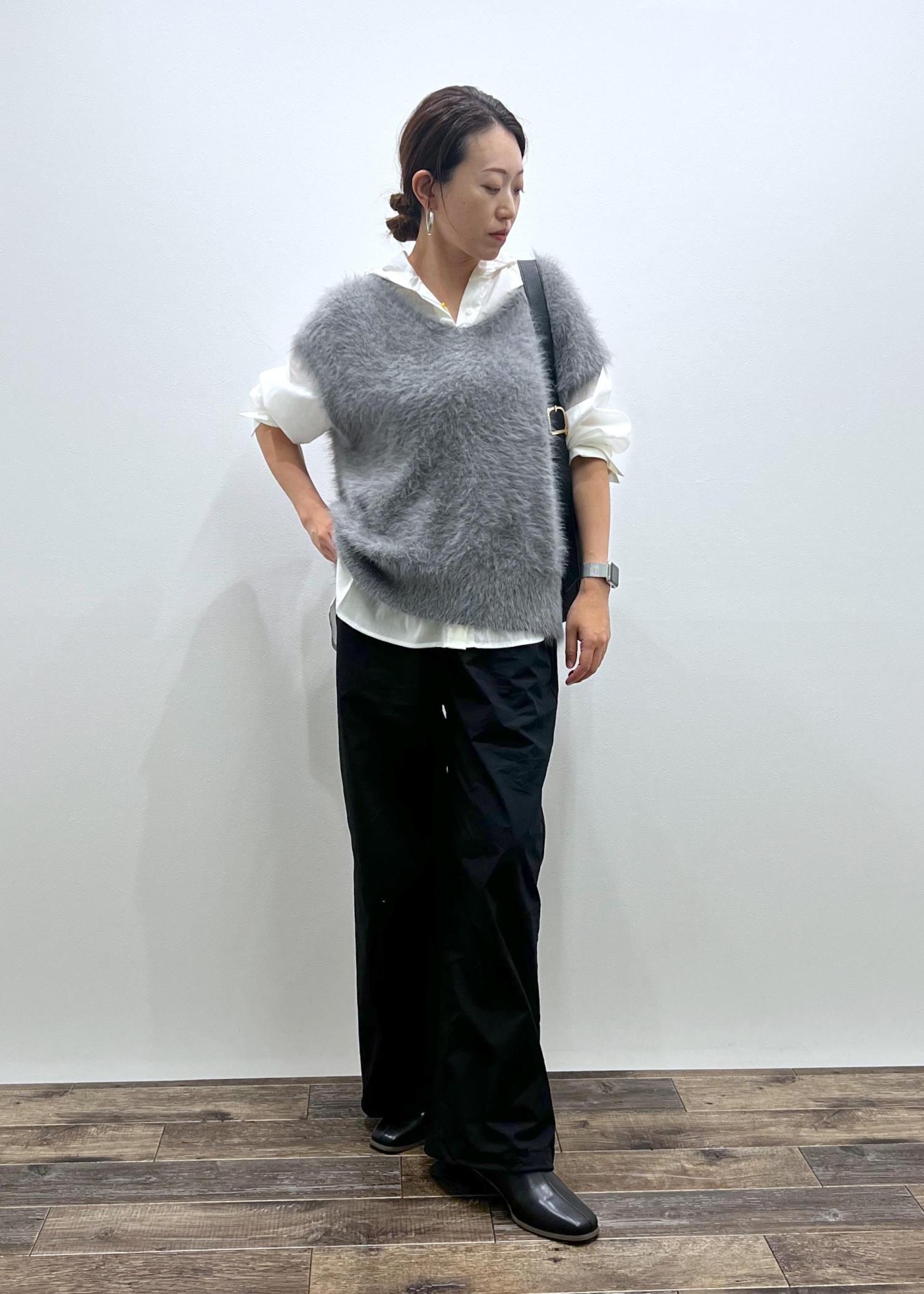 オススメのシャギーニットとシャツのレイヤードスタイルです。異素材の組み合わせがポイントで、シャツもフード付きでデザイン性があるのもオススメポイントです。
