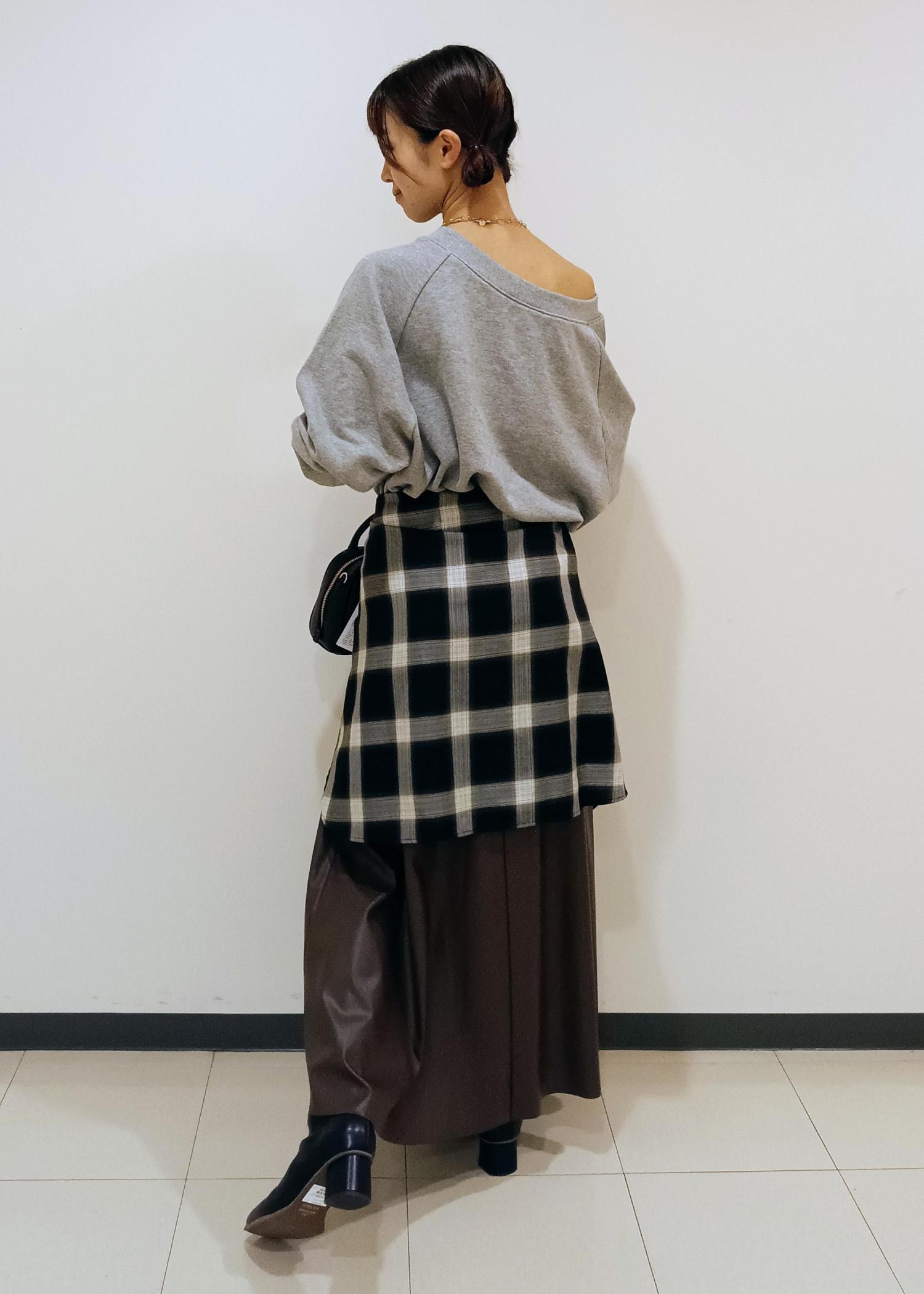 カジュアルなスウェットにレザースカート合わせて女性らしい印象に。