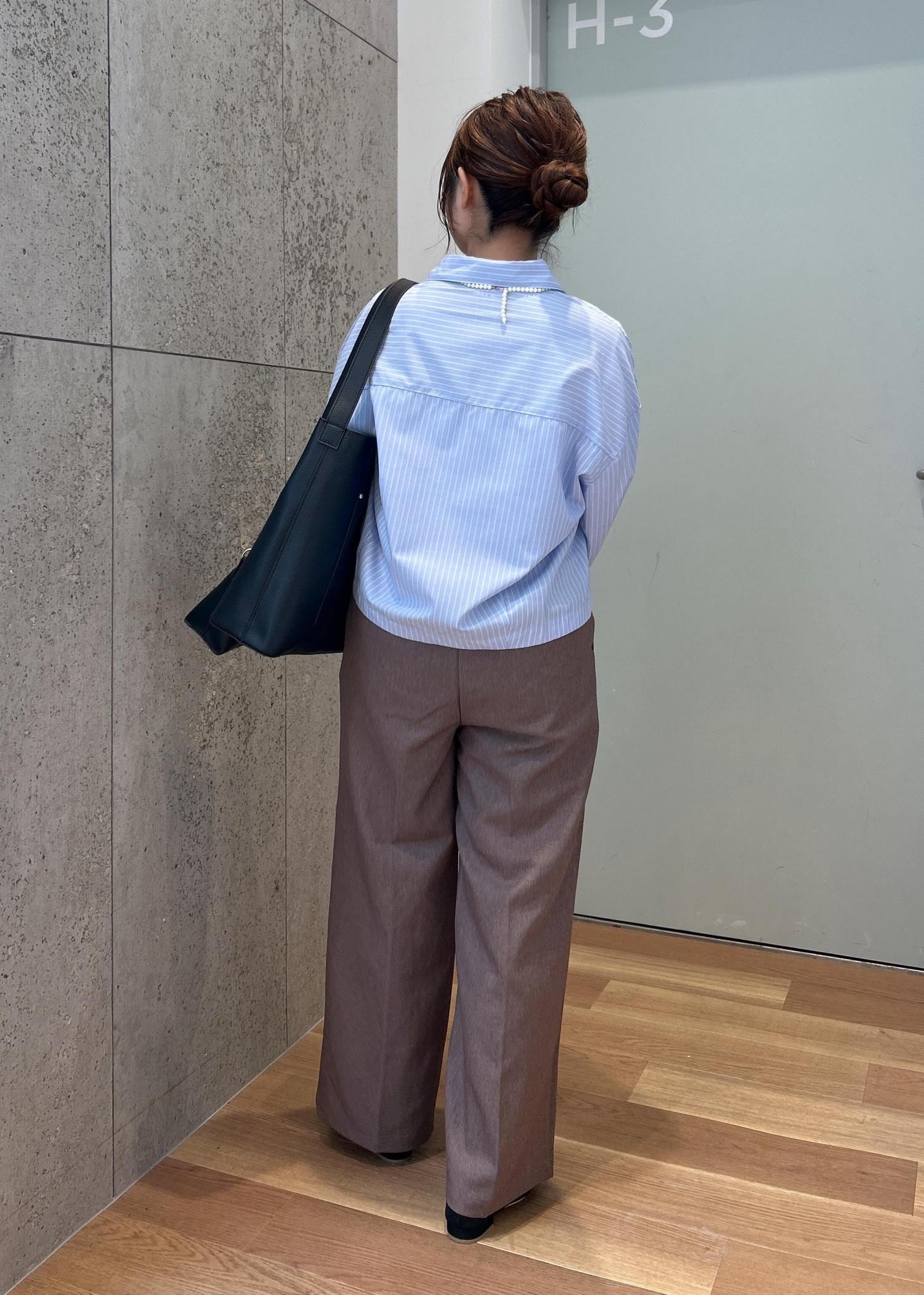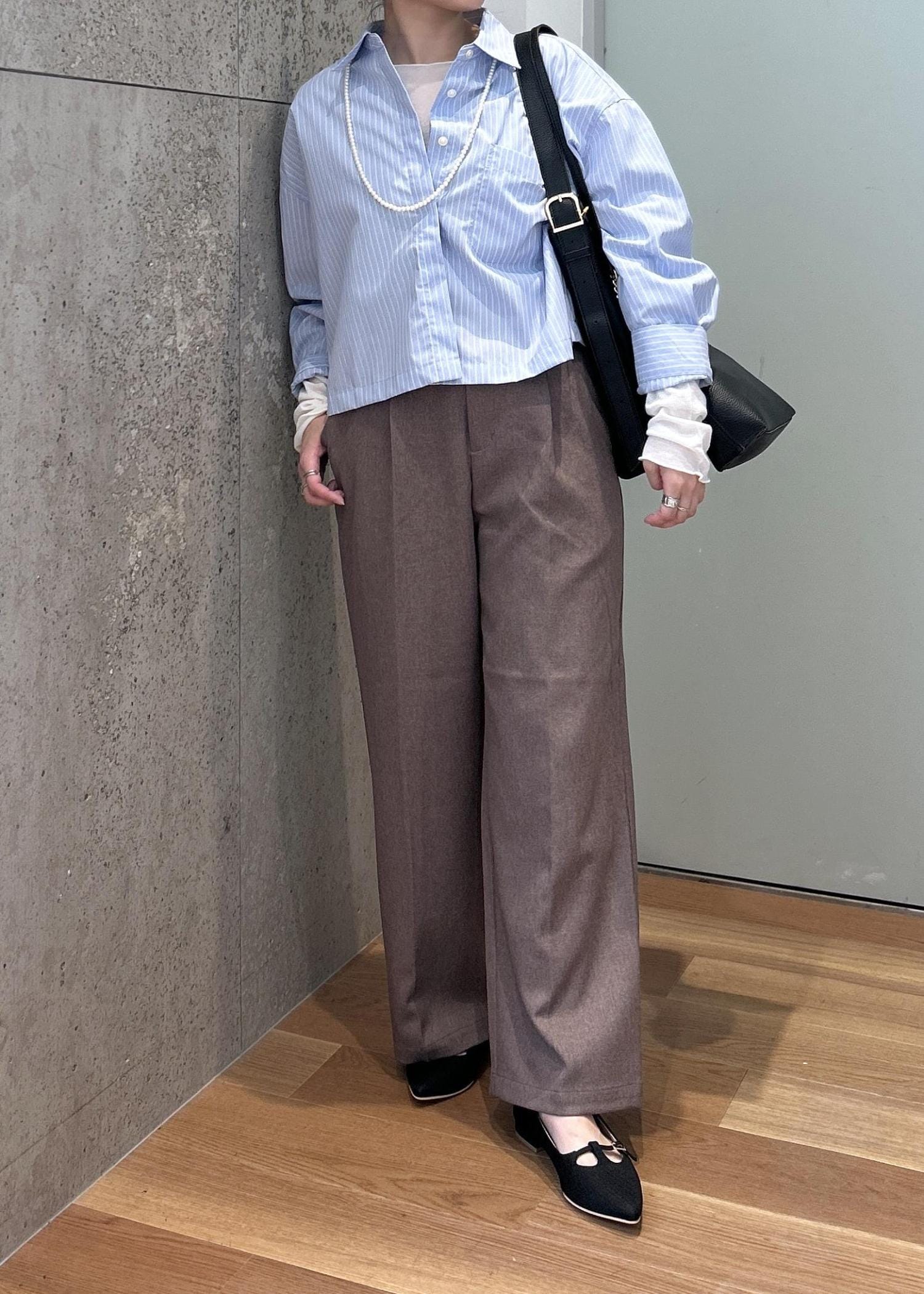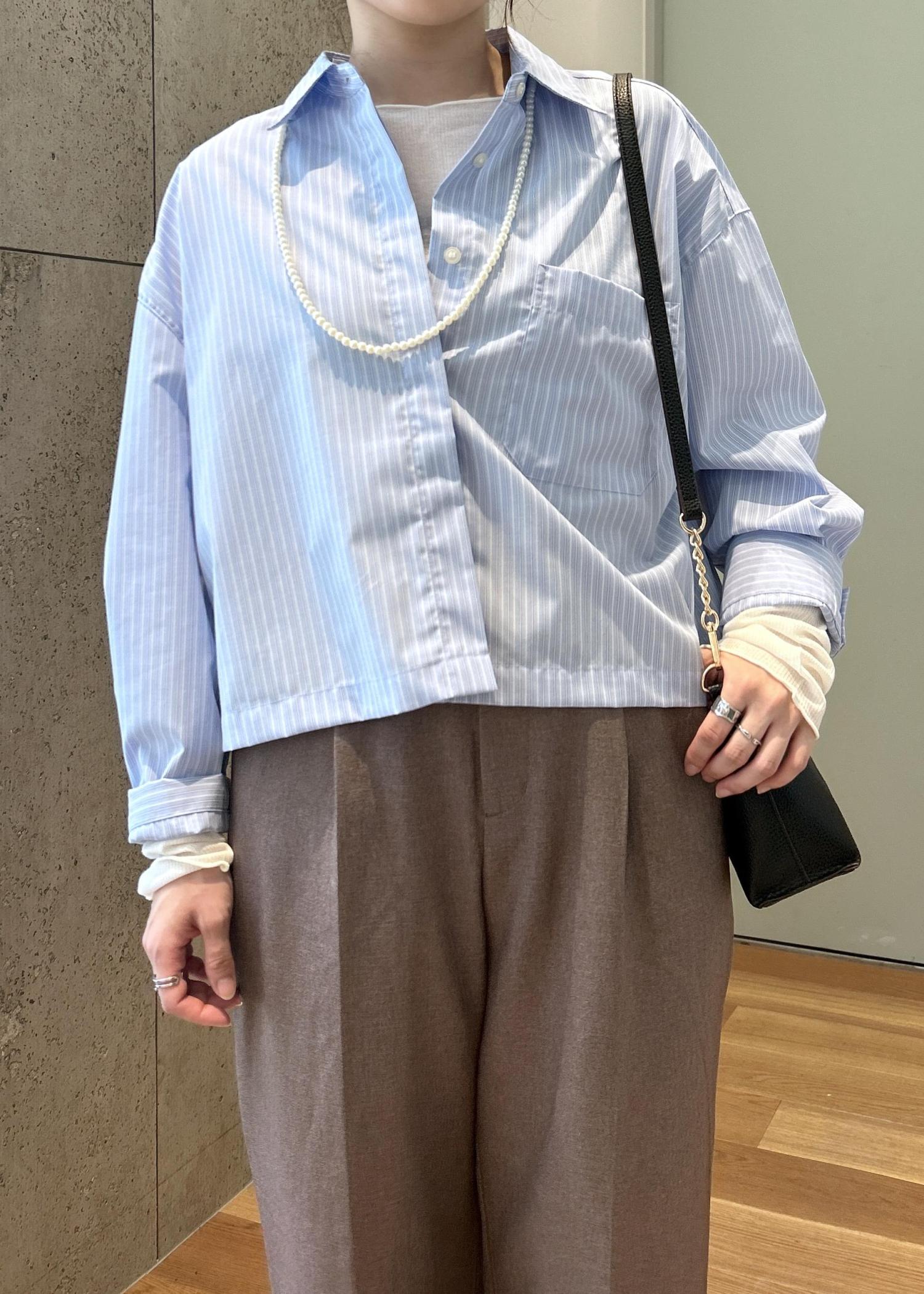 クロップド丈シャツにワイドパンツを合わせたキレイ目なコーディネートです!