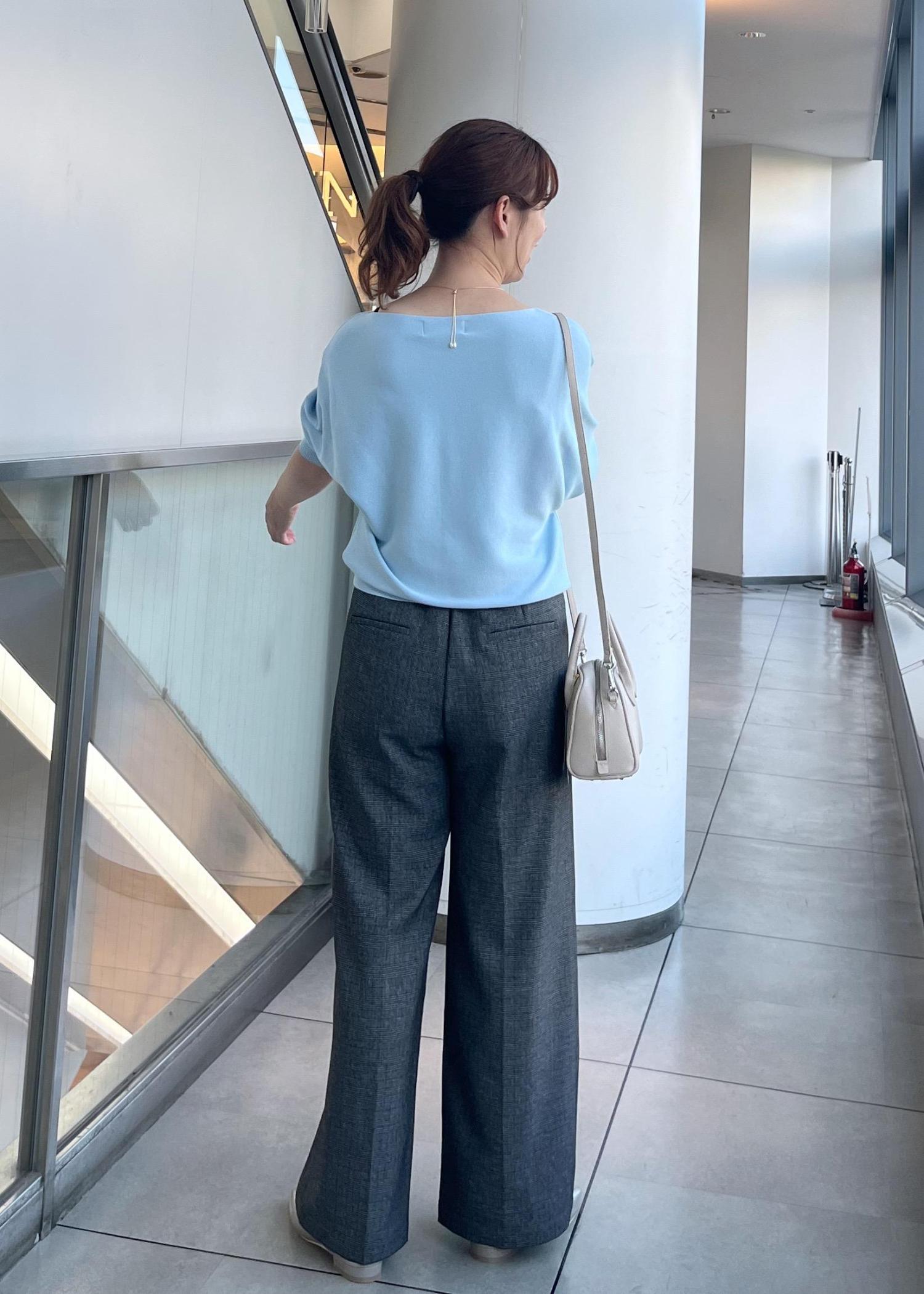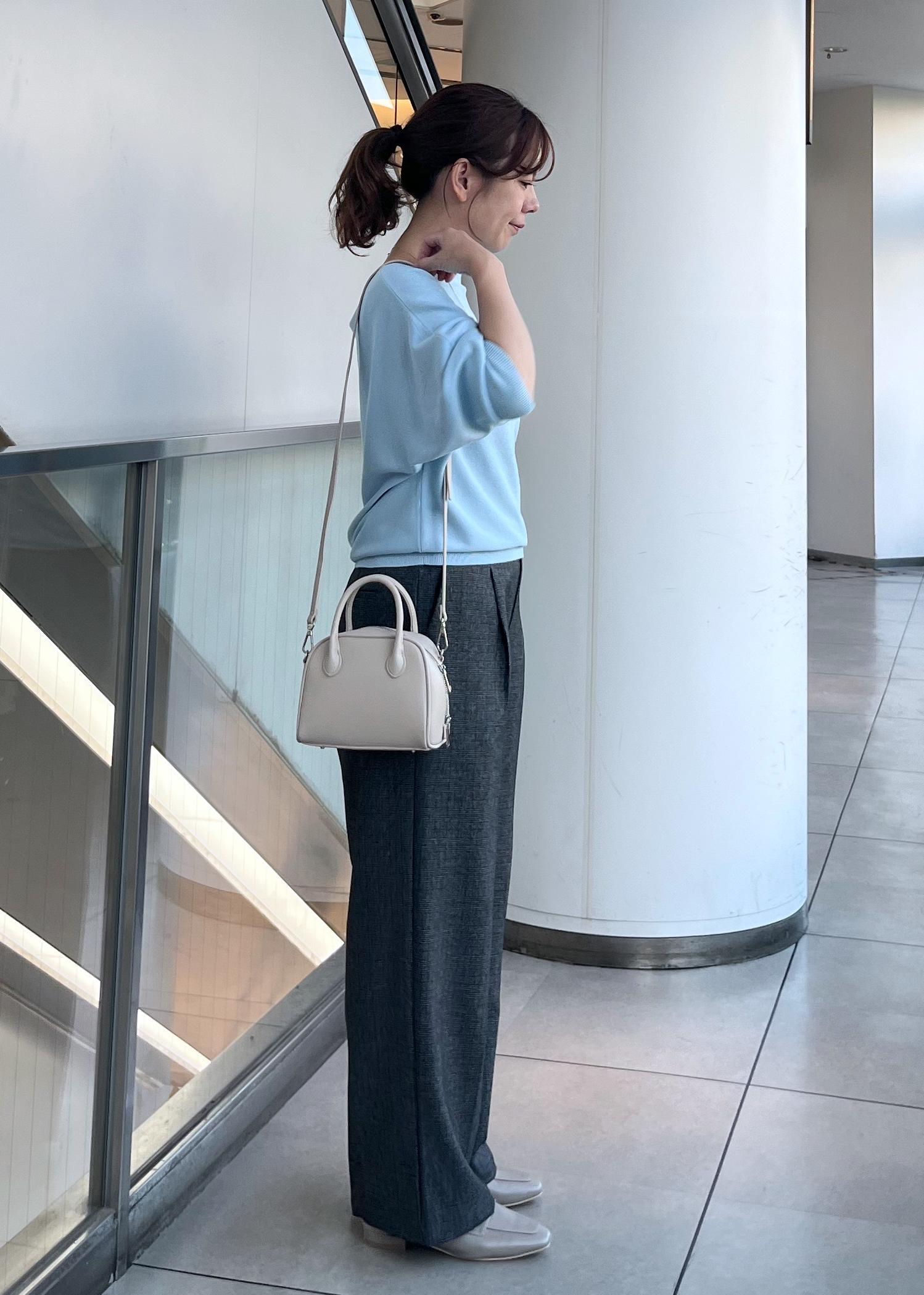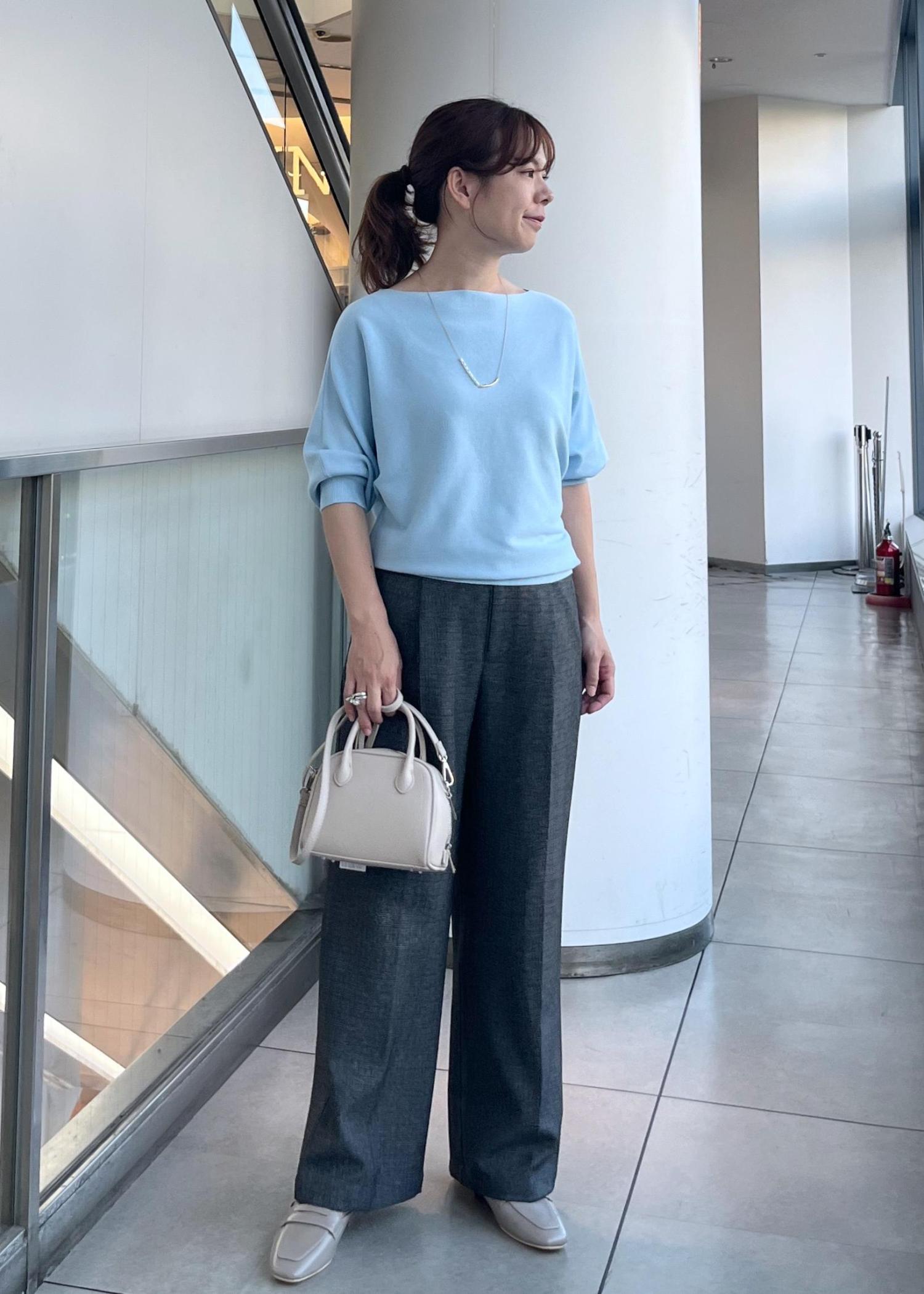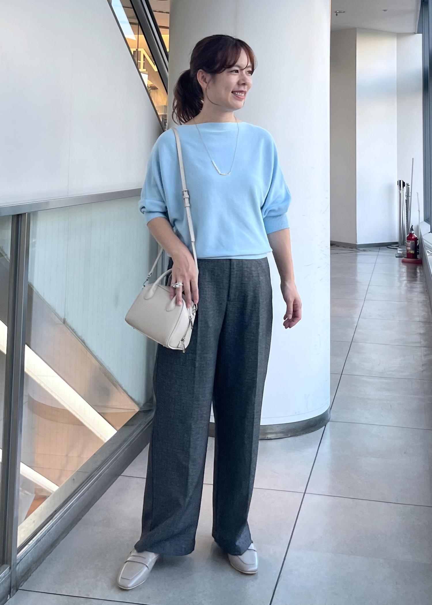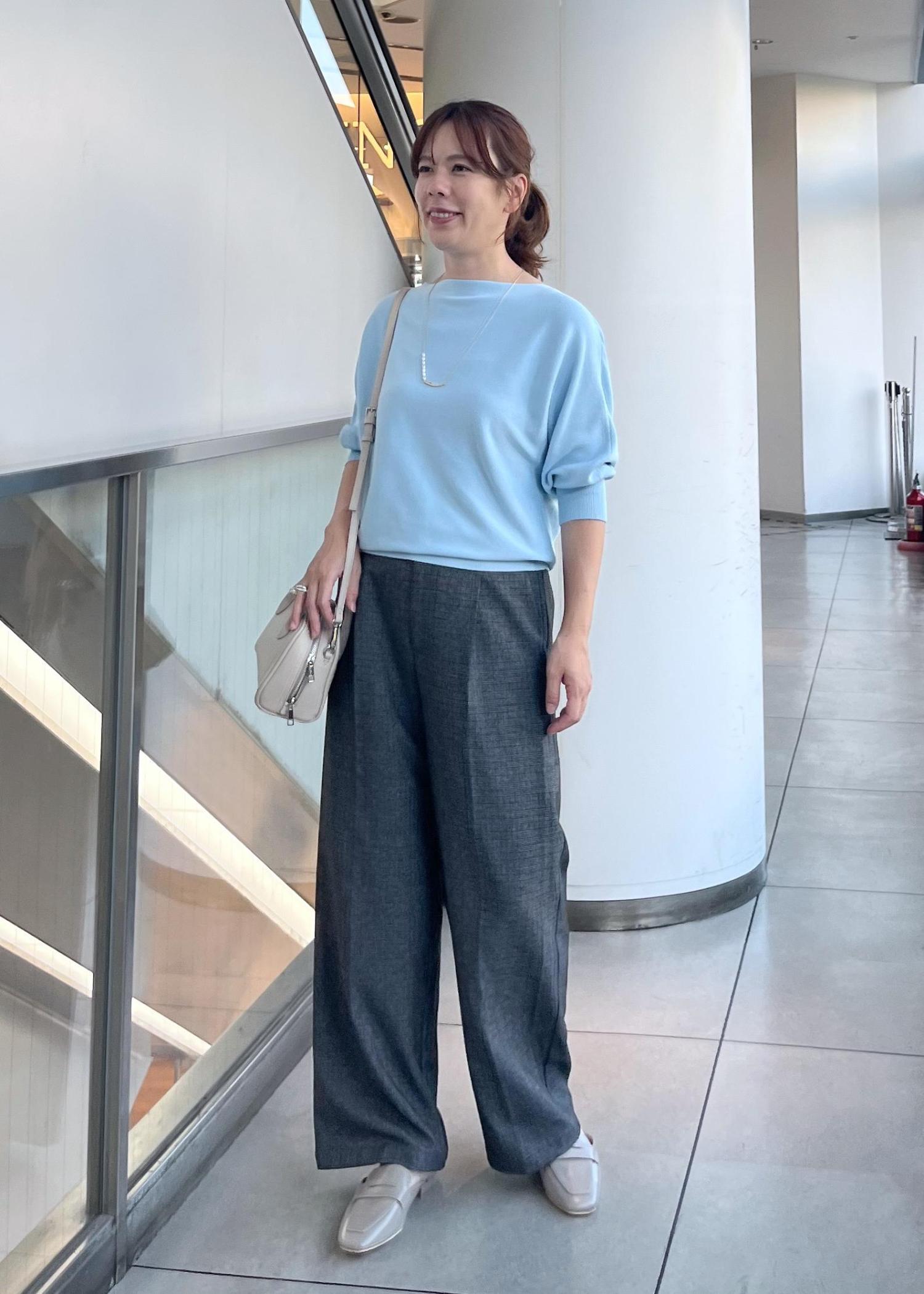 水色とグレーを合わせてすっきりした印象に。ニット、パンツどちらもすぐに取り入れやすい秋アイテムです。