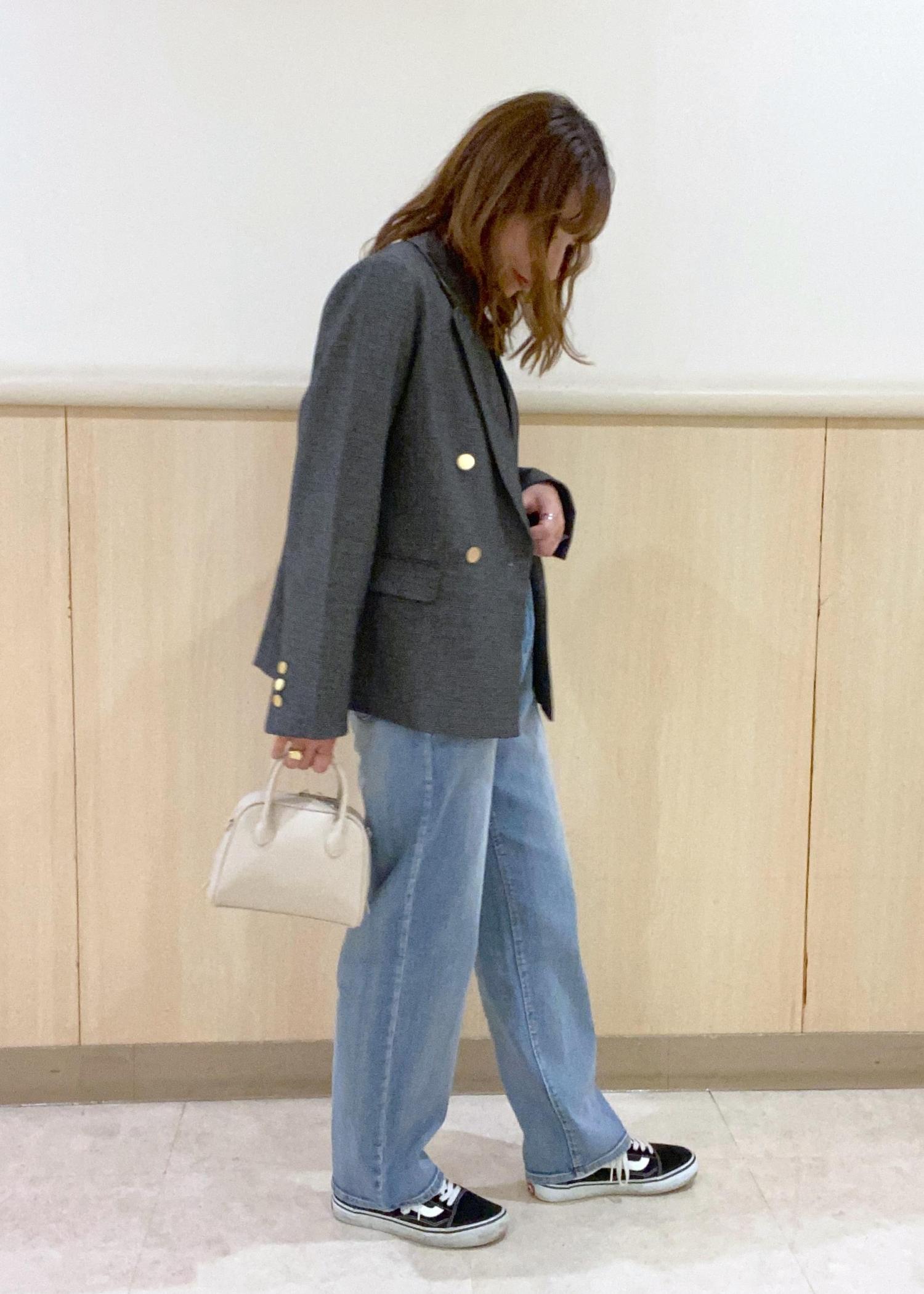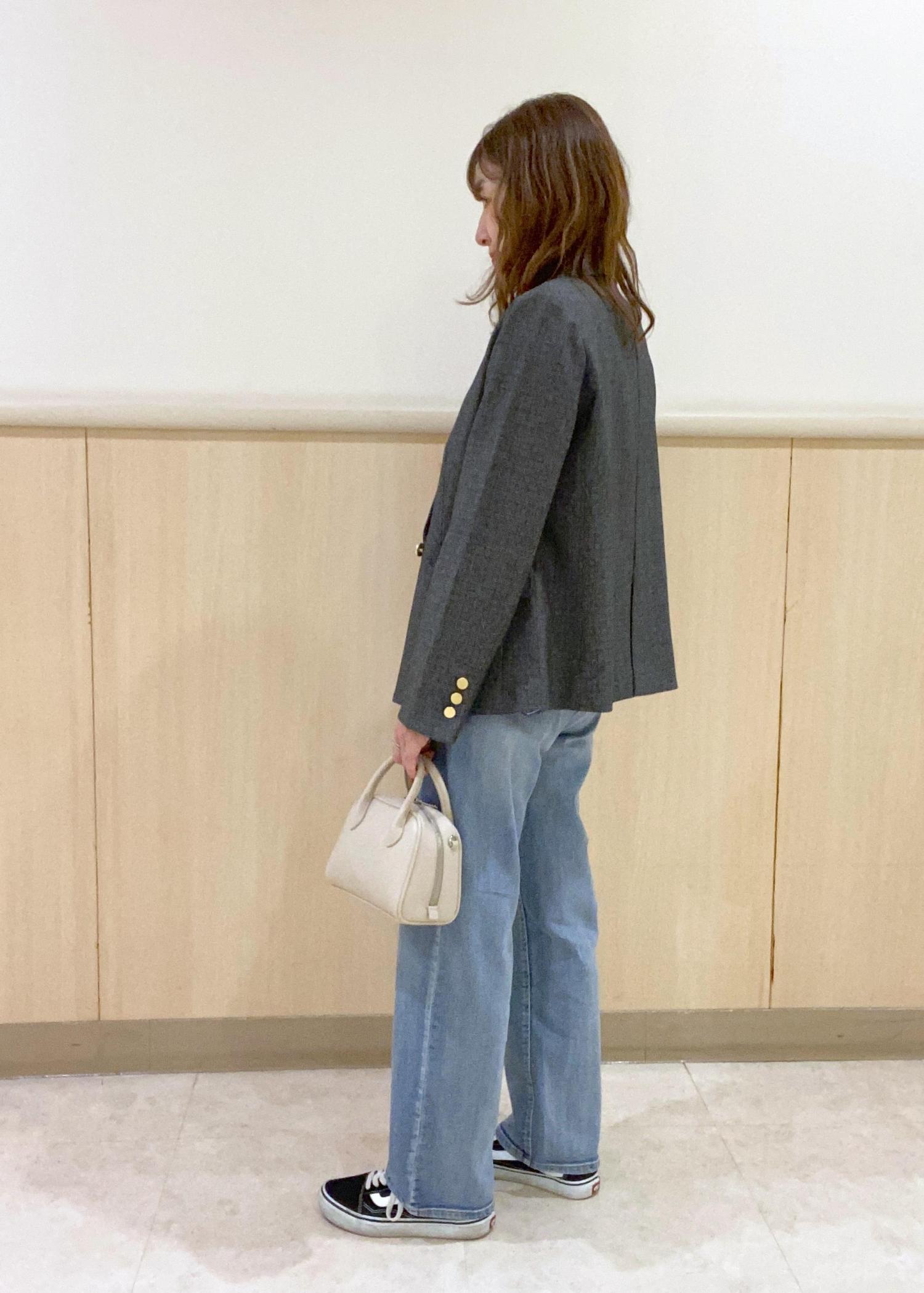 ON/OFF着用出来る金ボタンのダブルジャケットです。ゆとりのあるサイズ感なので、秋口の羽織りとしても活躍します。
