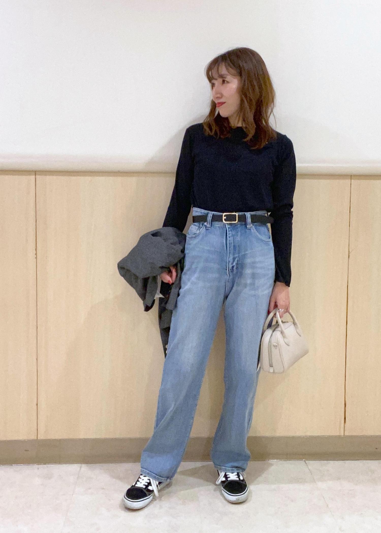 ウエスト内側に太めのゴムが入っているのでウエスト周りをスッキリと見せてくれます。ハイライズデニムなので、トップスをインしたスタイルもおすすめです。
