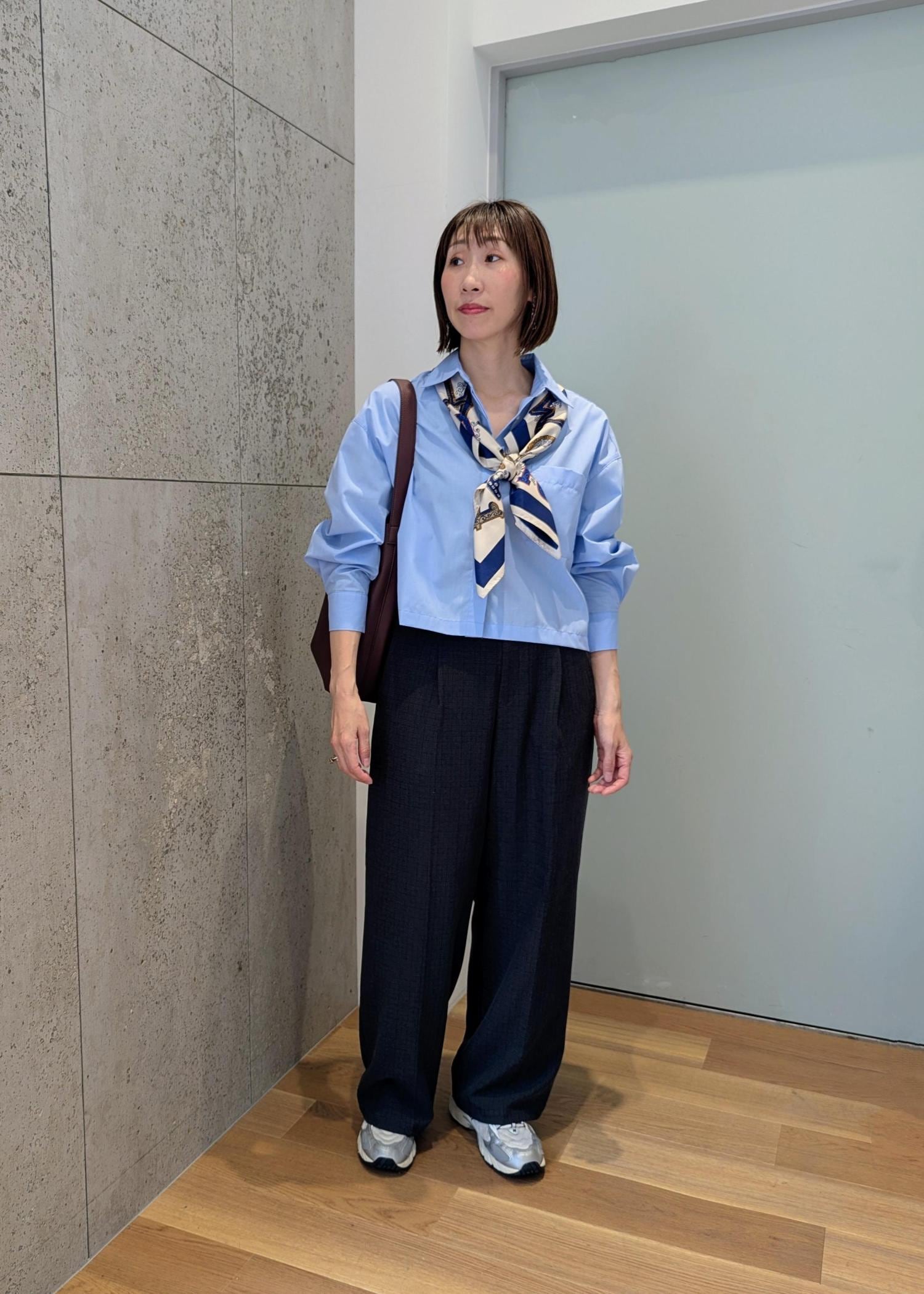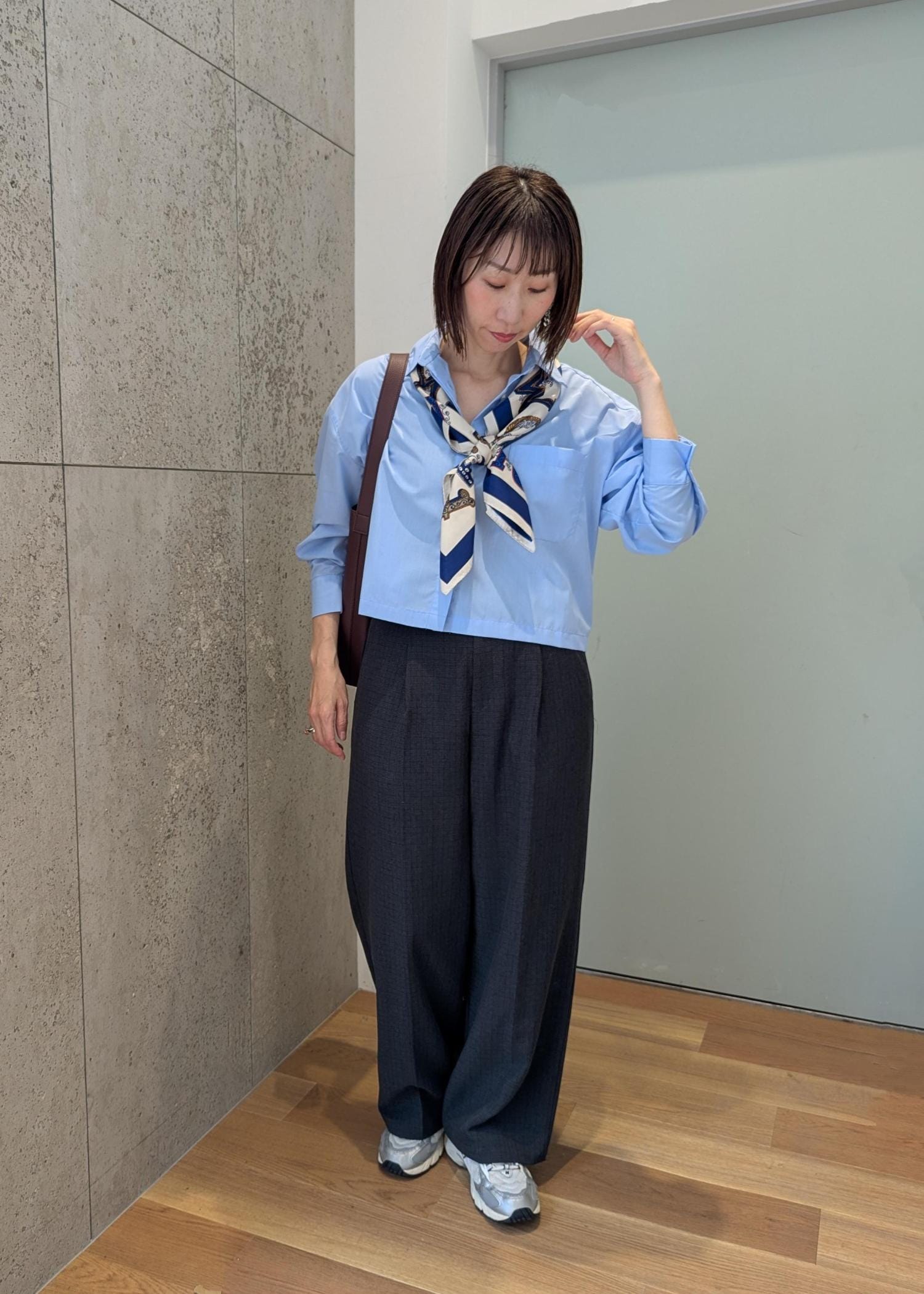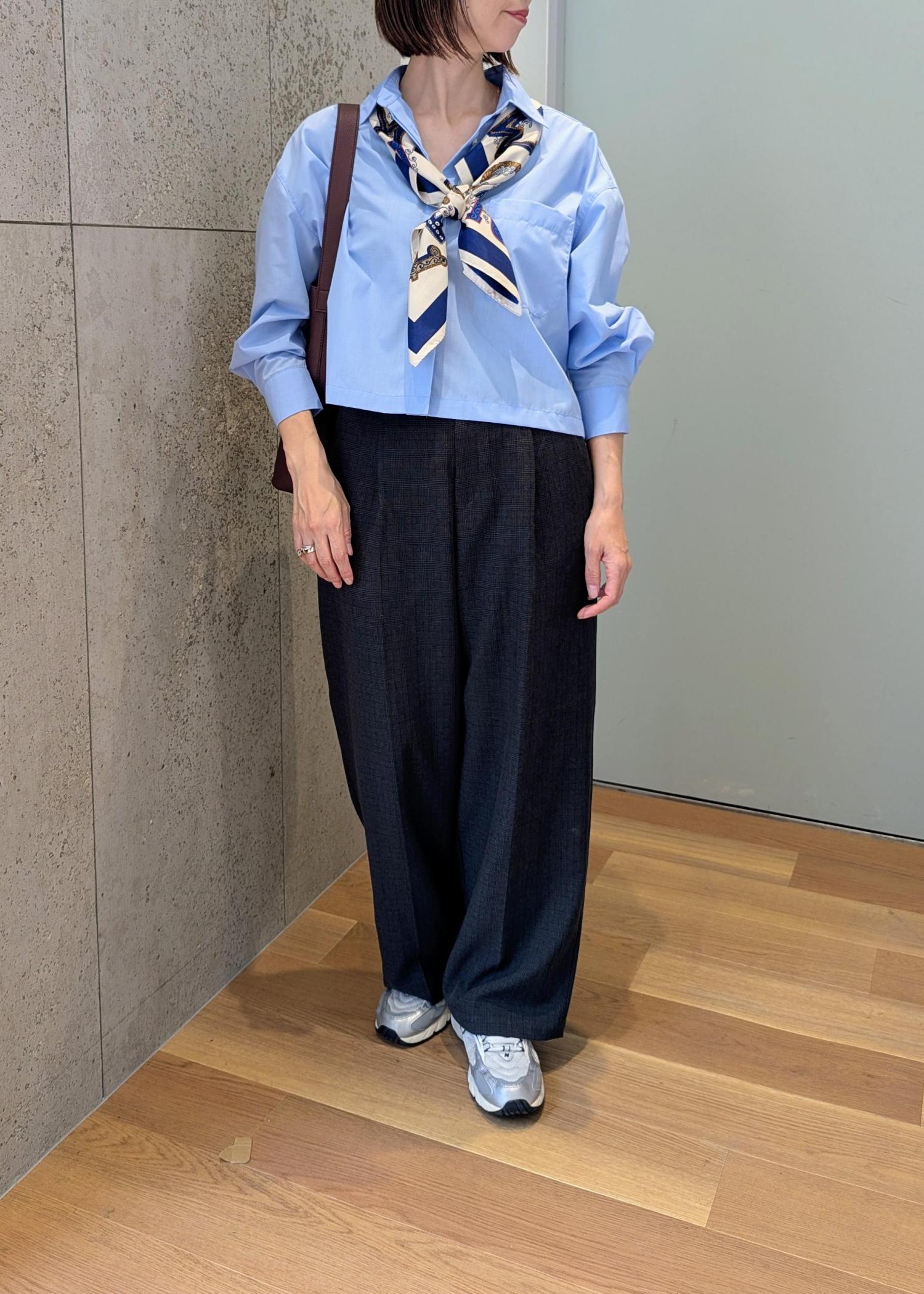 チェックパンツにクロップドシャツを合わせたシンプルコーデです。スカーフやバッグでキチンと感を出しつつスニーカーで外すのもオススメです。