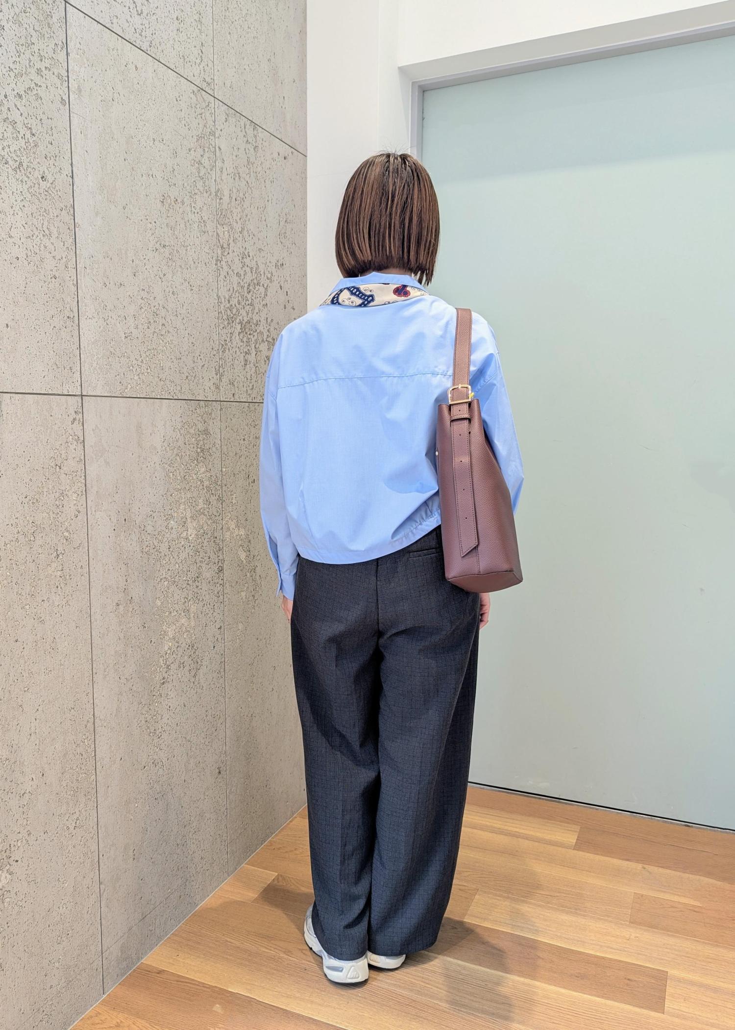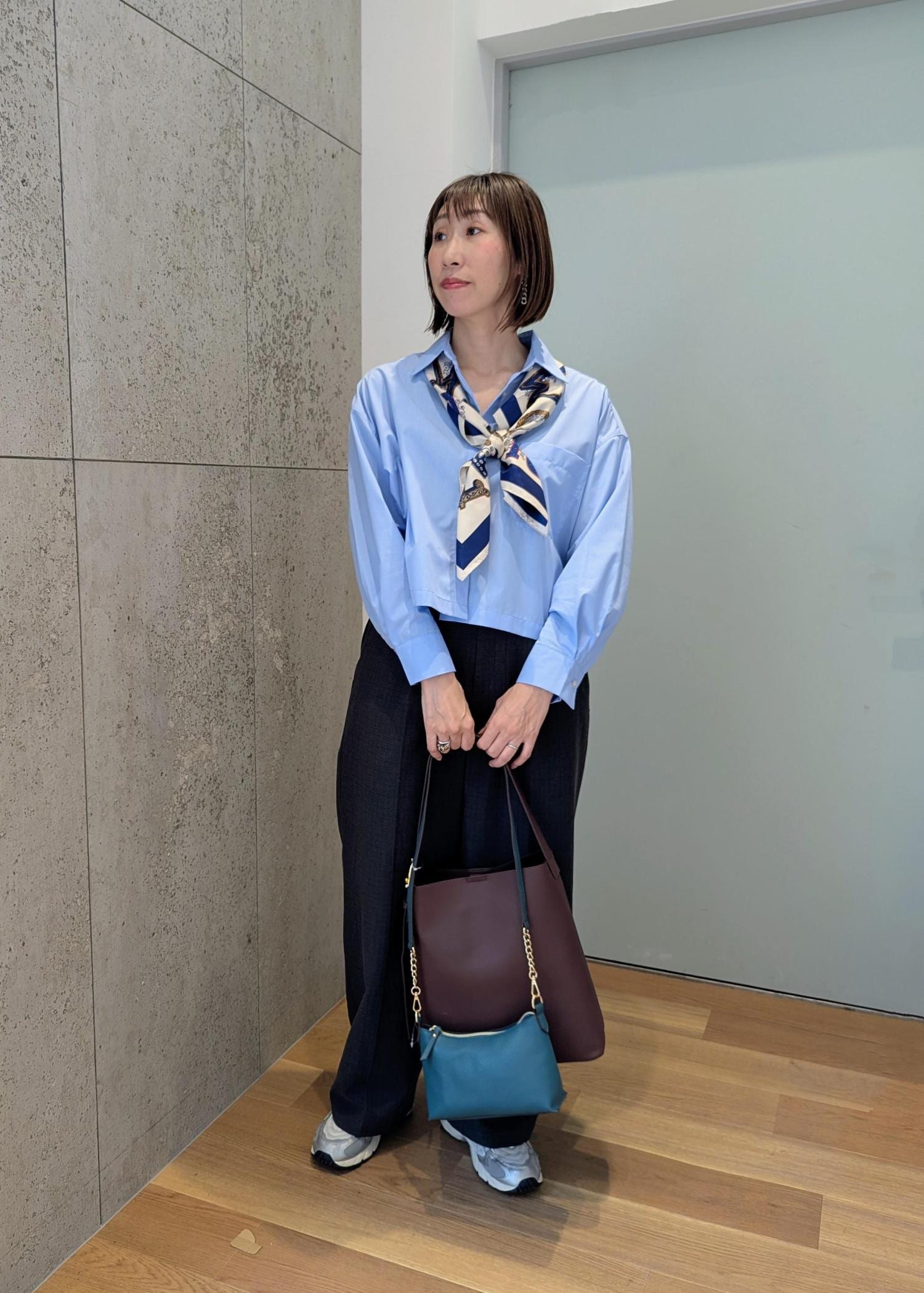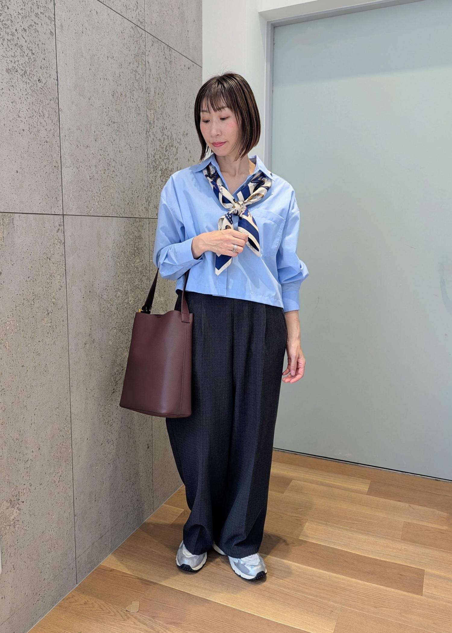 チェックパンツにクロップドシャツを合わせたシンプルコーデです。スカーフやバッグでキチンと感を出しつつスニーカーで外すのもオススメです。