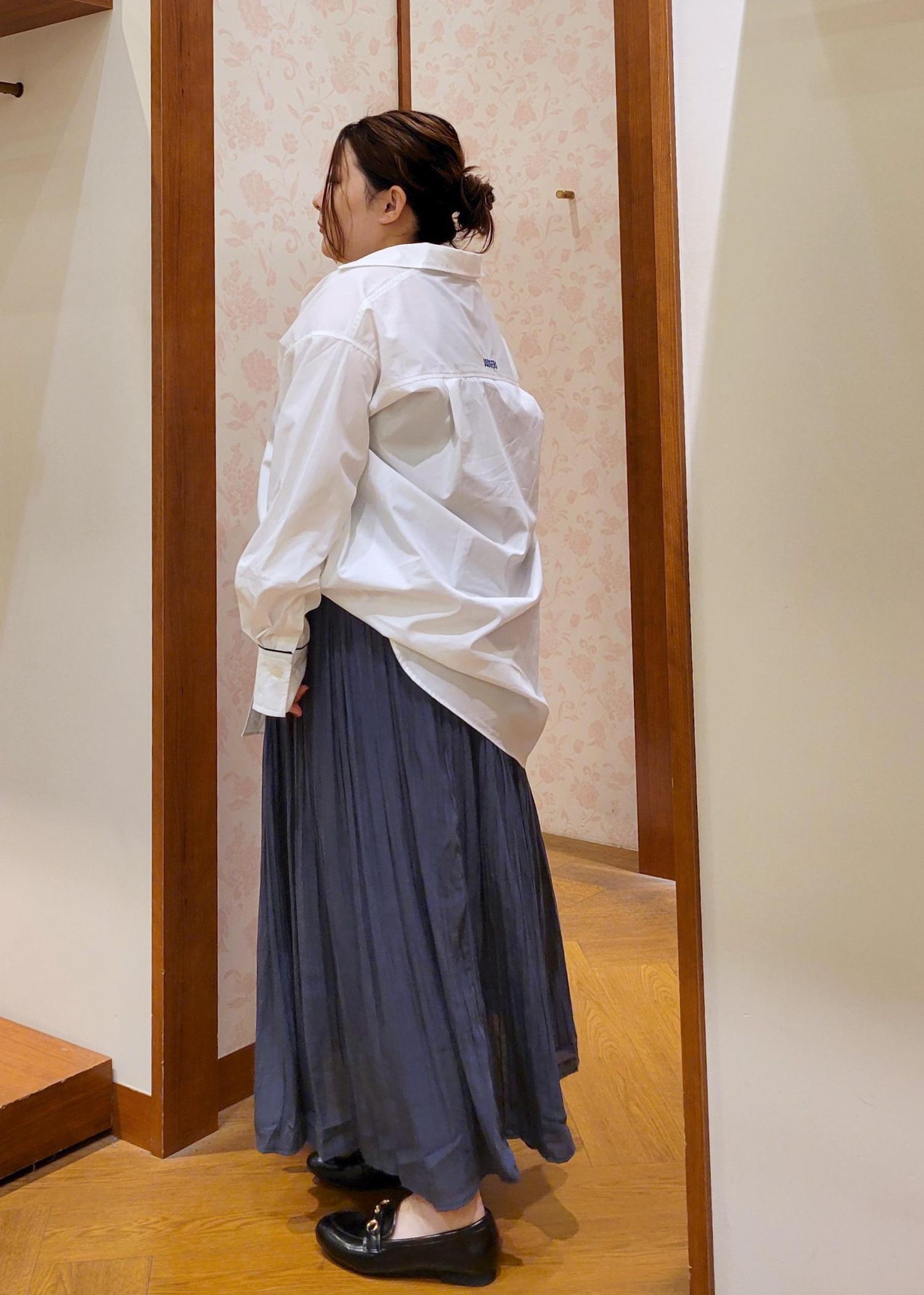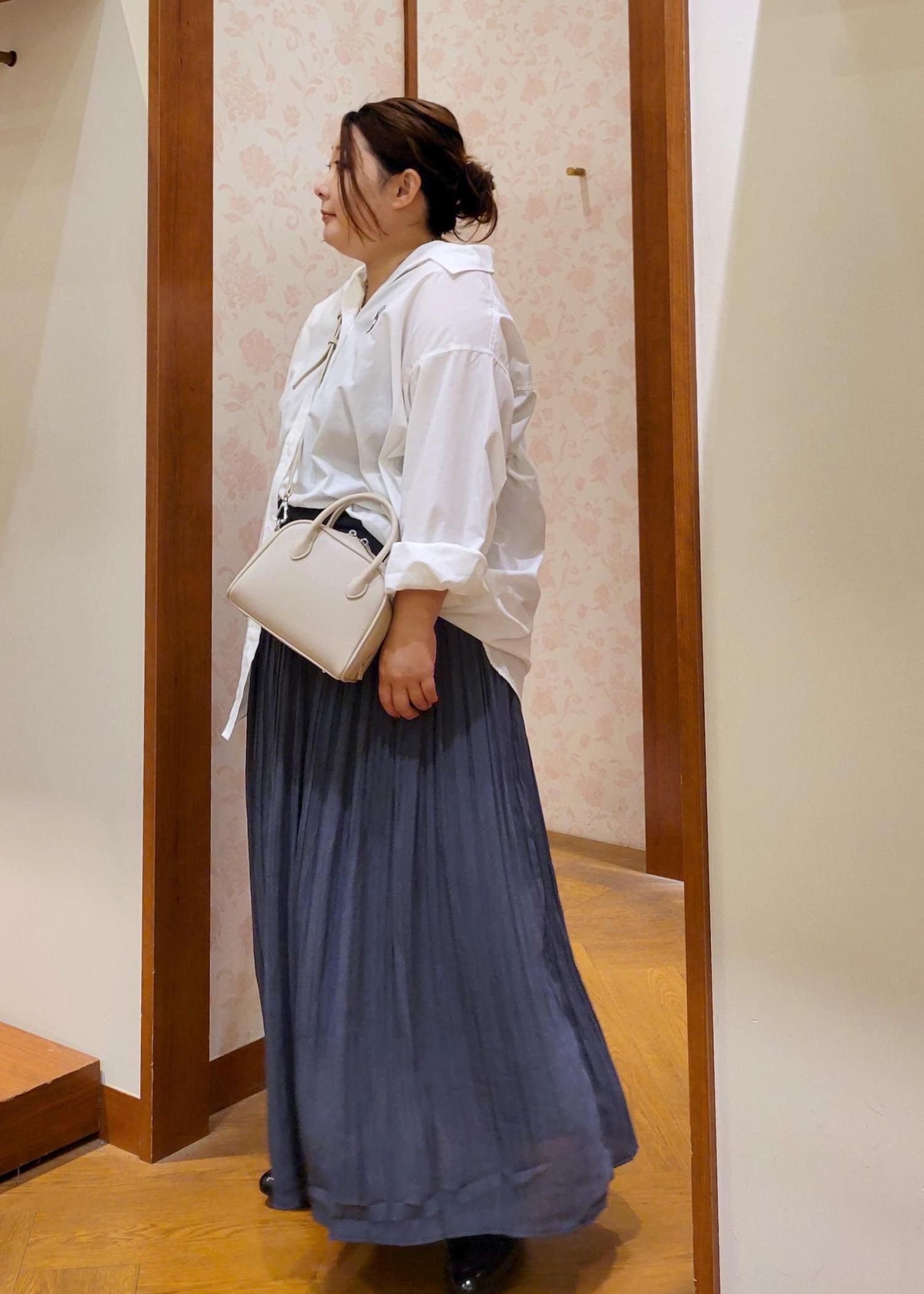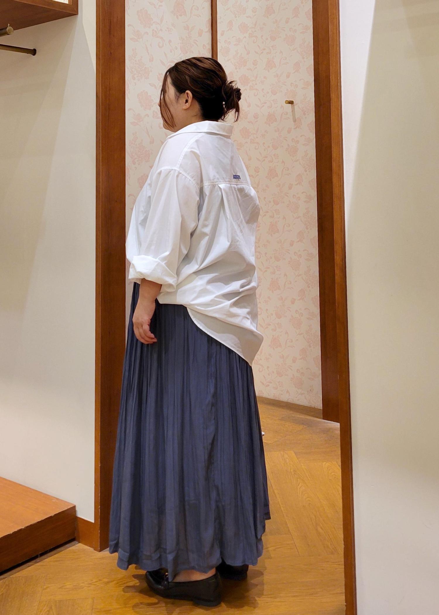 オーバーシャツをスカートで合わせた大人カジュアルコーデです。シャツの半分だけスカートにインスタイルにしたのがポイントです!