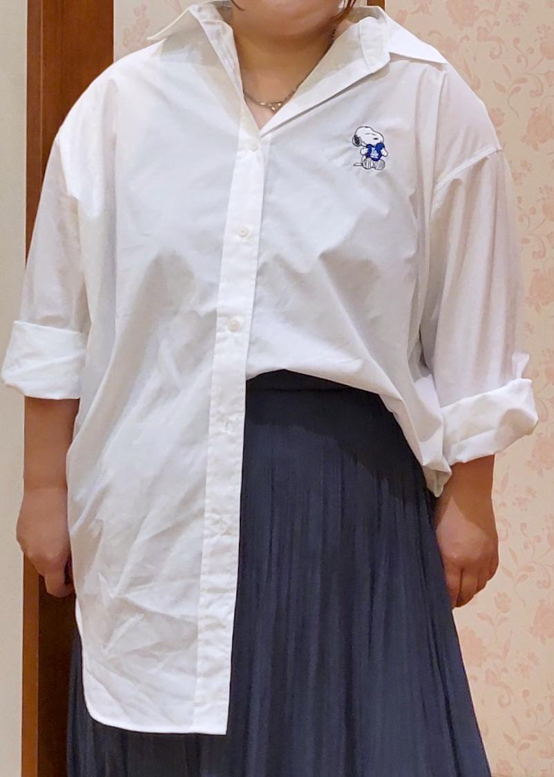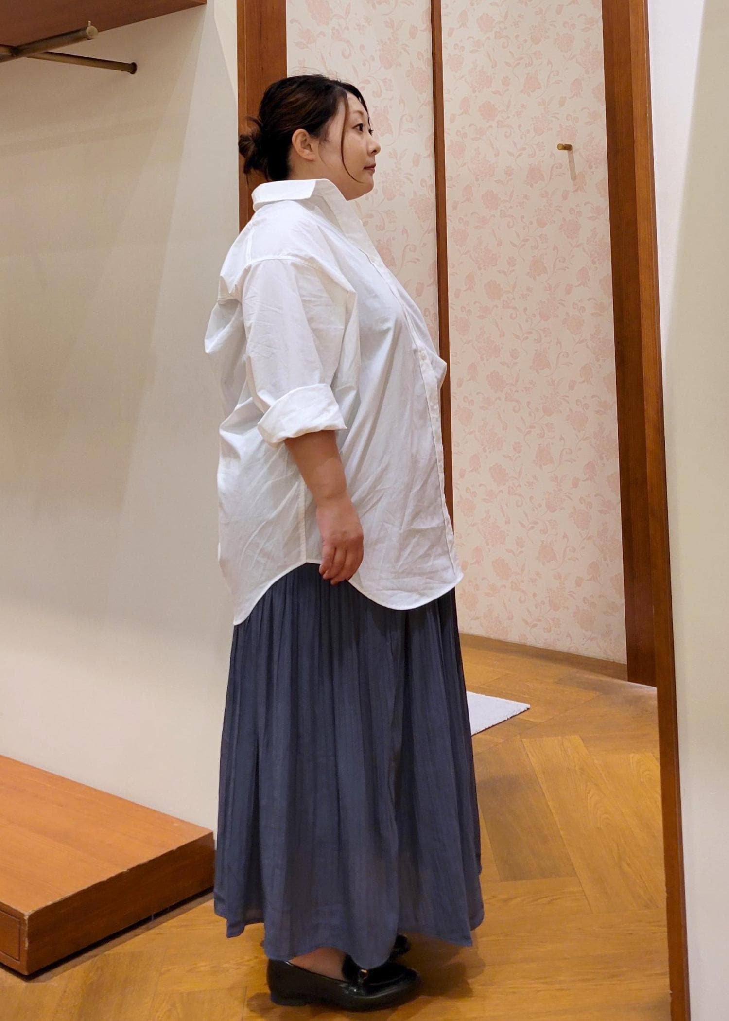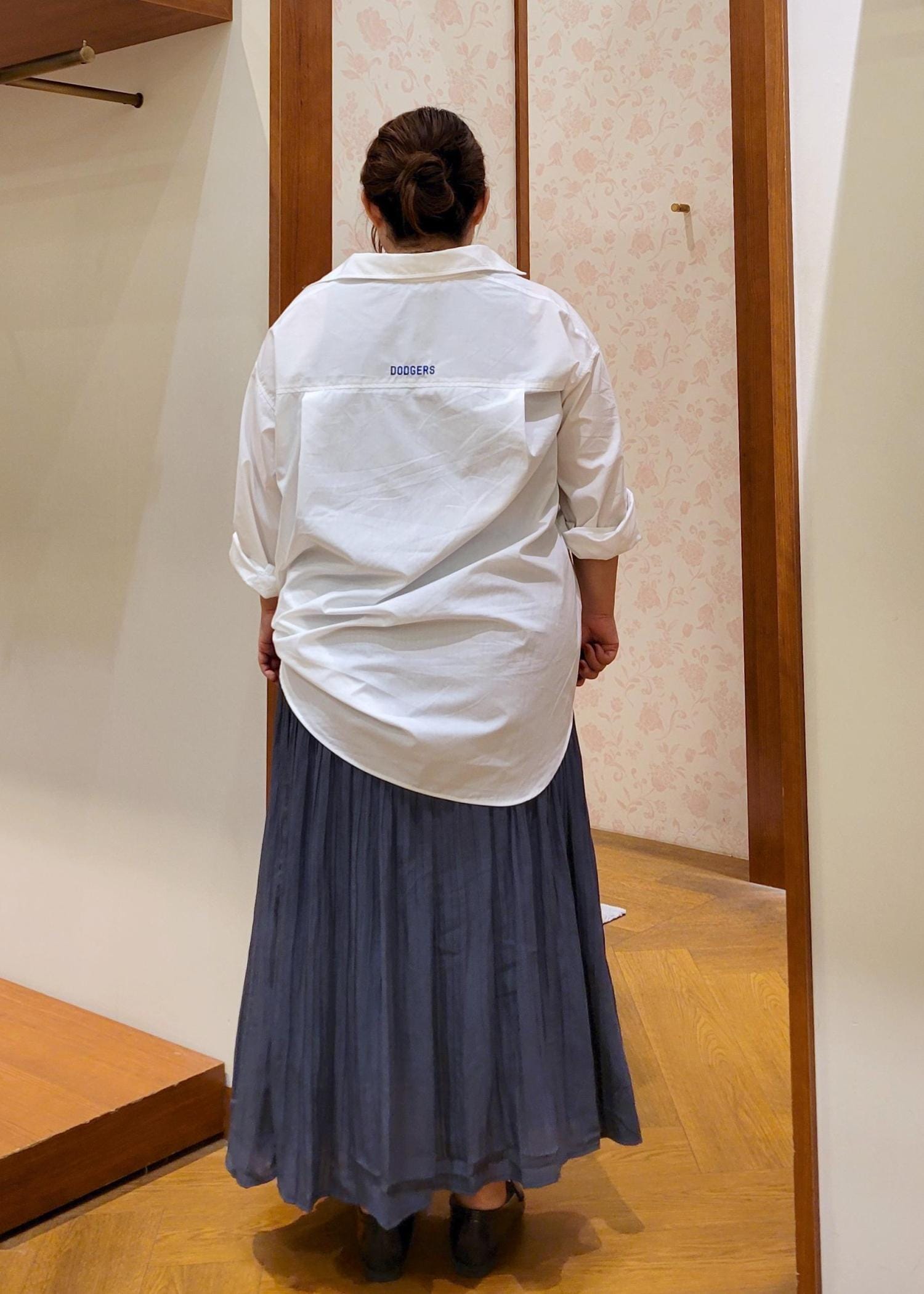 オーバーシャツをスカートで合わせた大人カジュアルコーデです。シャツの半分だけスカートにインスタイルにしたのがポイントです!