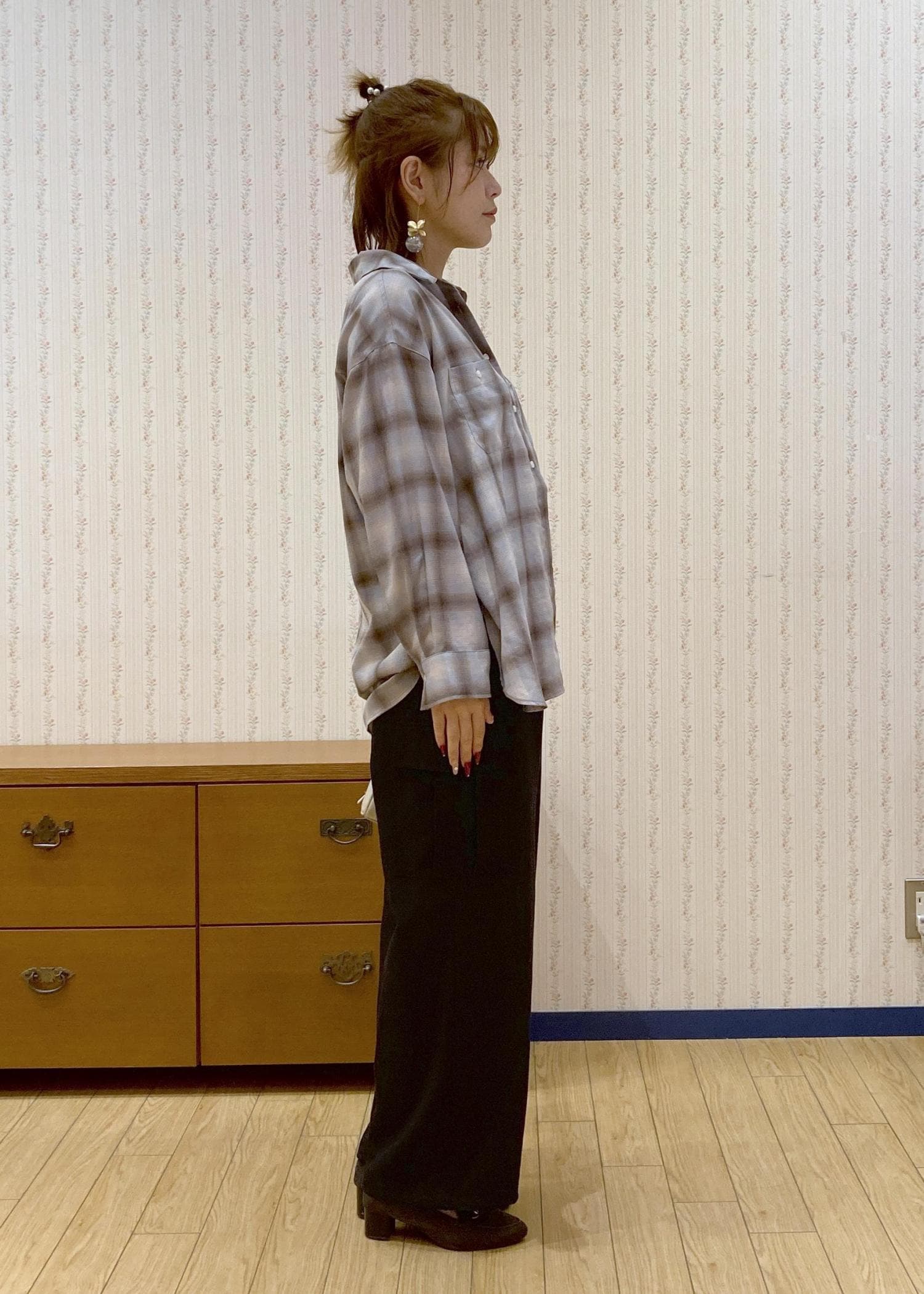 チェックシャツを片方だけウエストインして、抜け感をだしたカジュアルなコーディネートです。