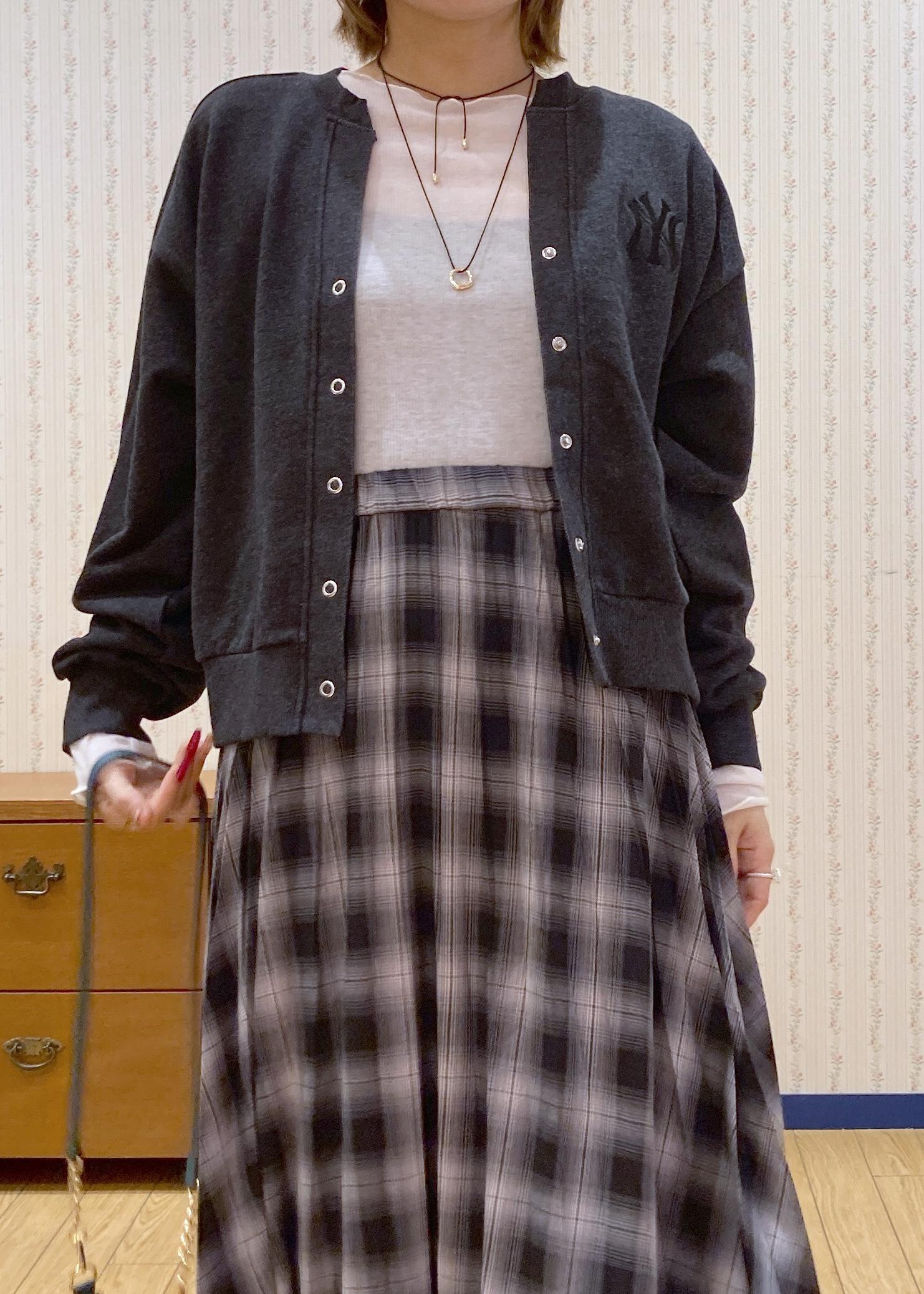 スウェットカーディガンのインナーにラメ感のあるシアートップスをあわせて袖から出るようにレイヤードしたのがポイントです!
