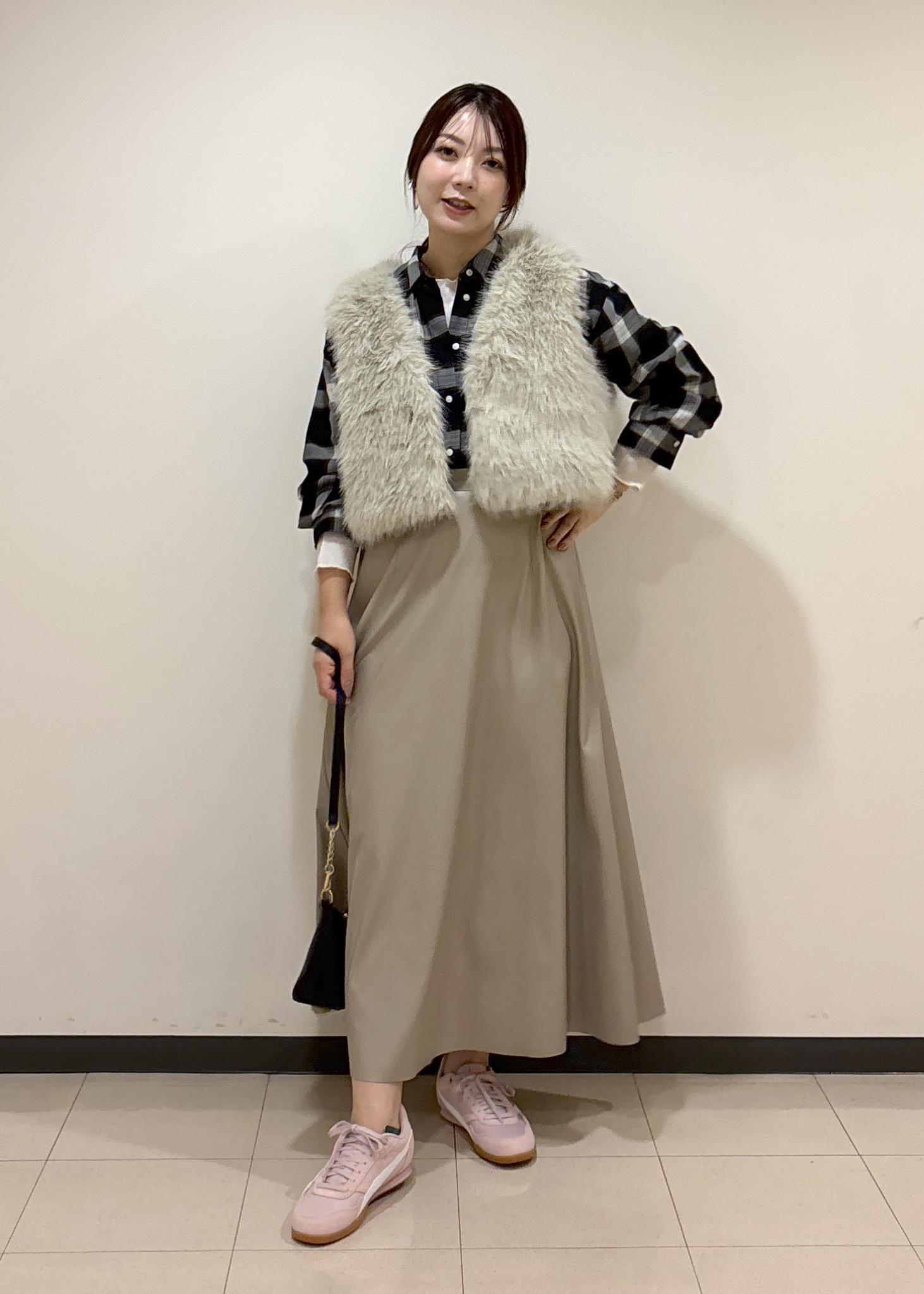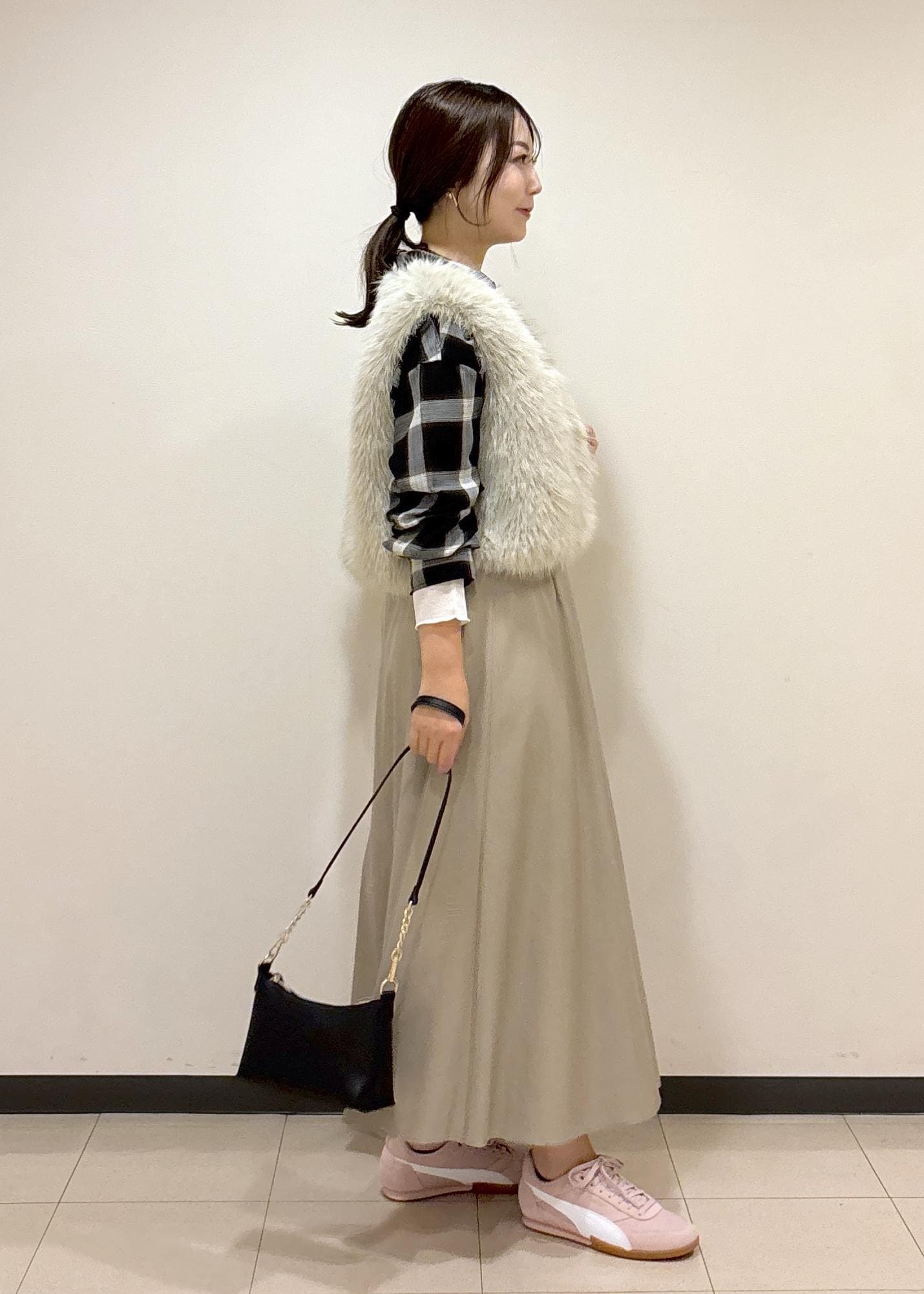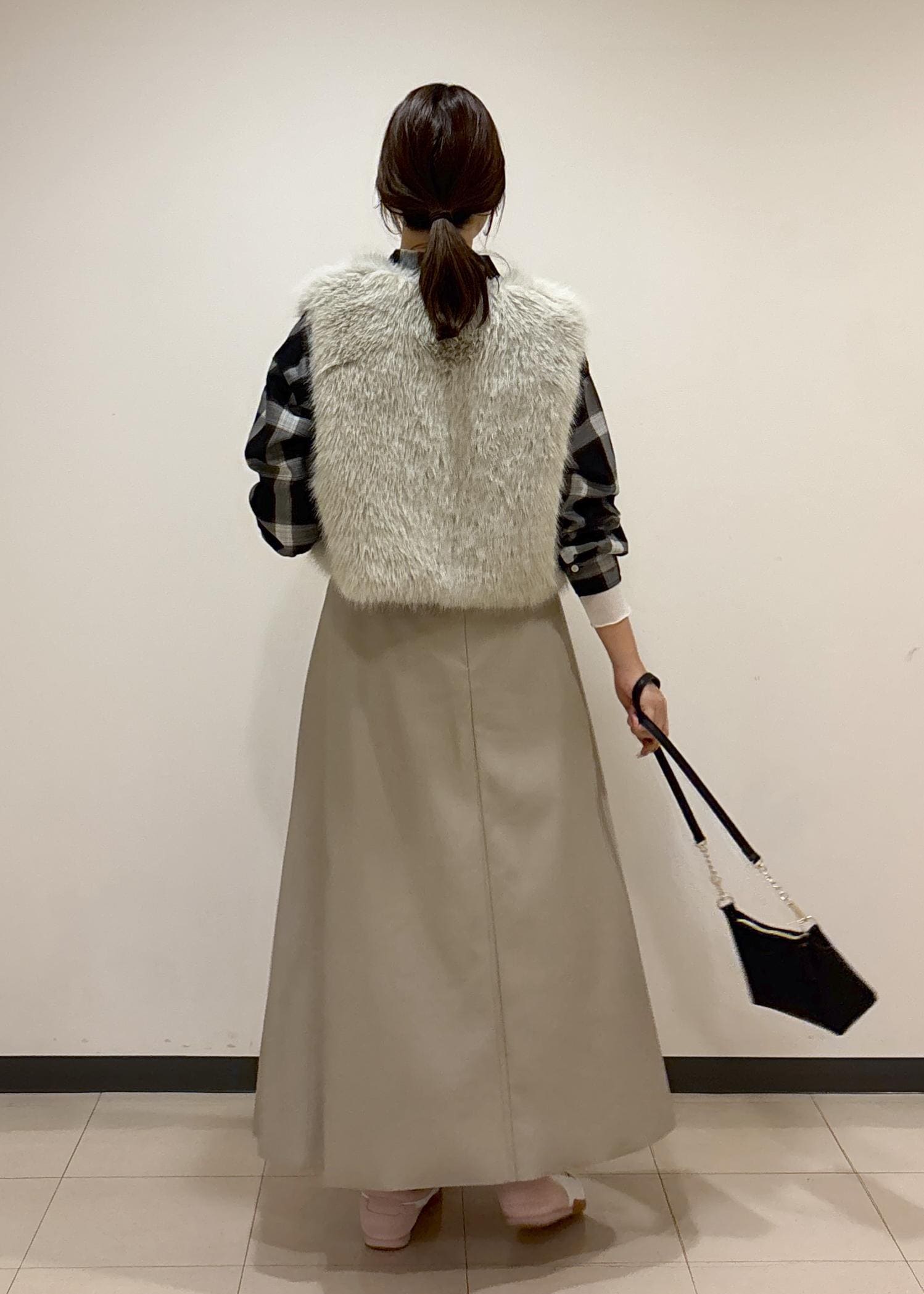 チェックシャツ、ファーベスト、レザースカートと秋らしいアイテムを使ったコーデ。