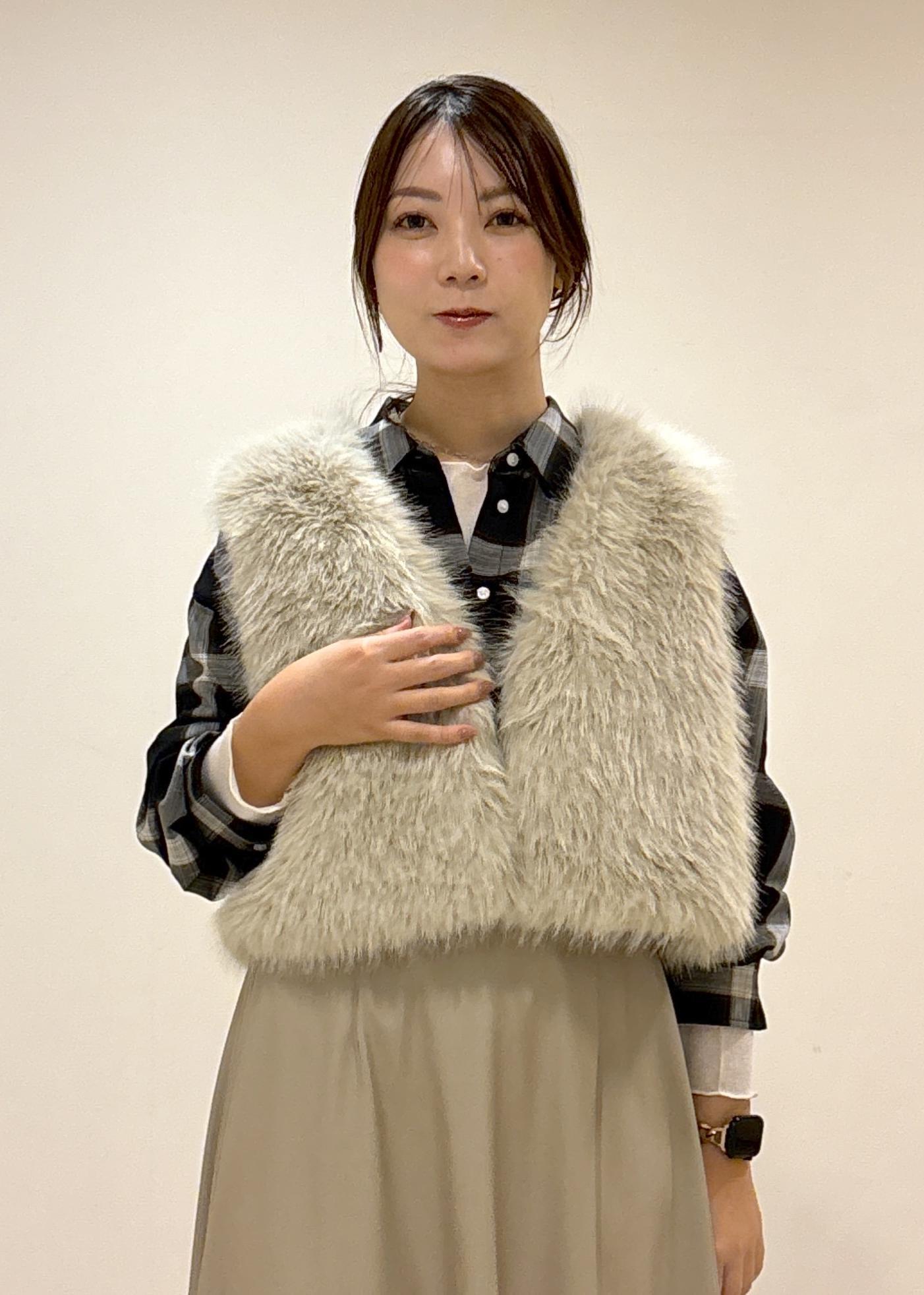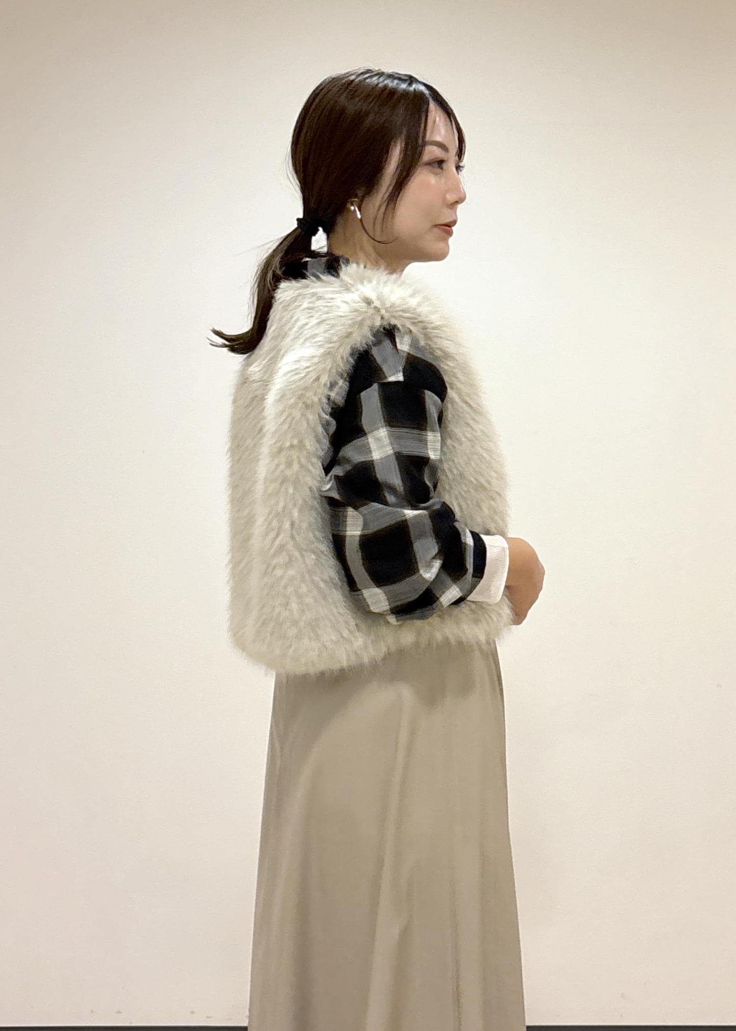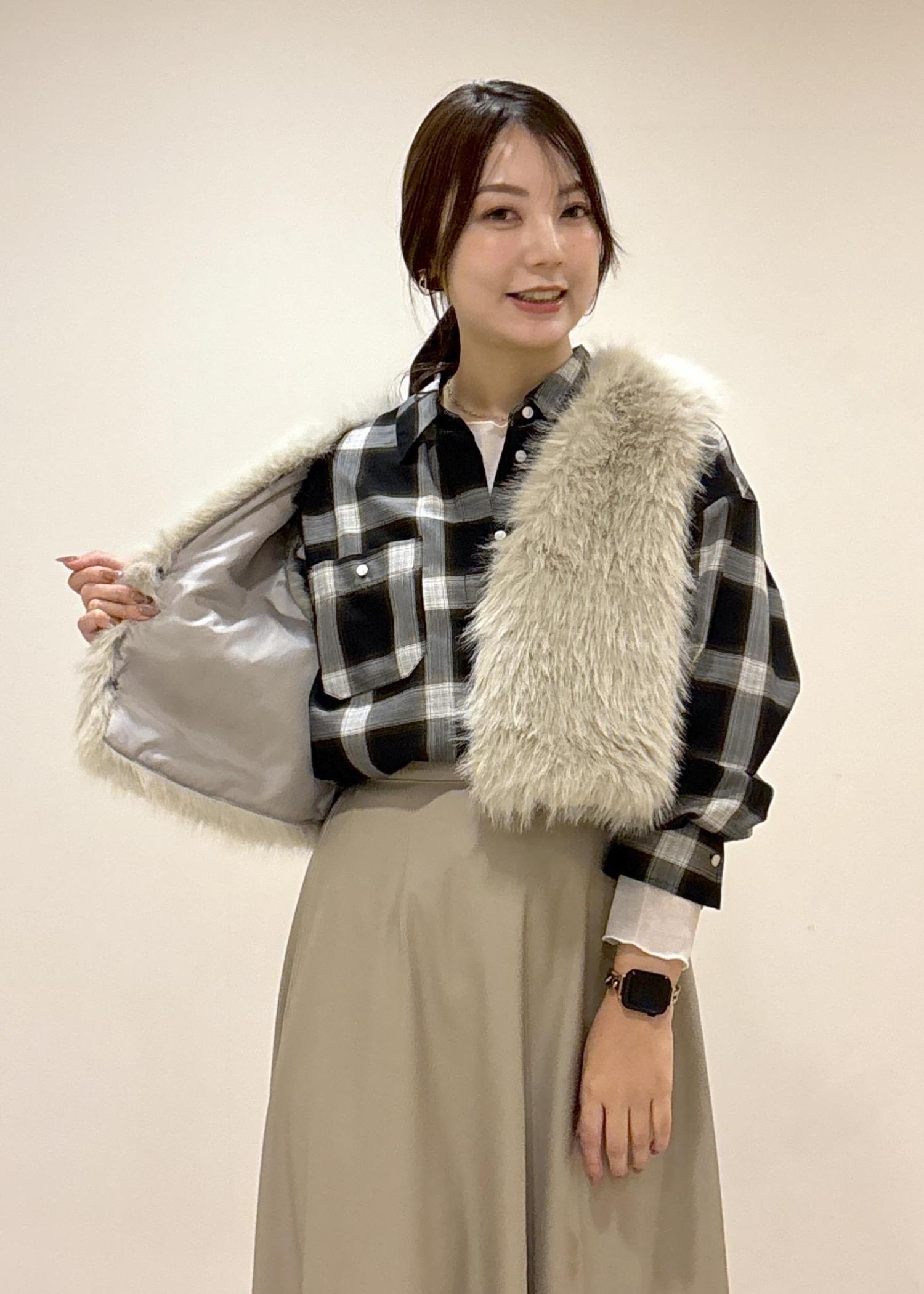チェックシャツ、ファーベスト、レザースカートと秋らしいアイテムを使ったコーデ。