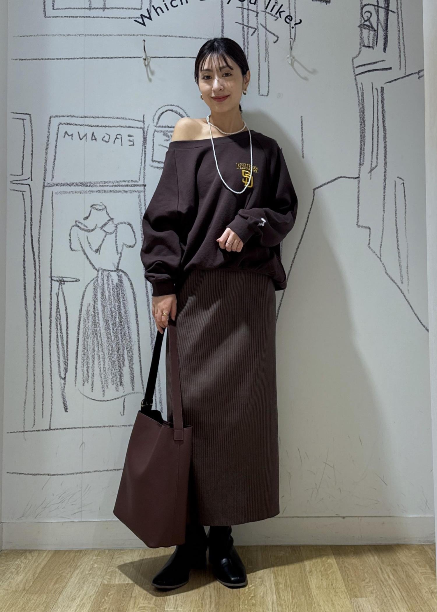 コットン素材なので柔らかくコシのある生地です。身幅はシャツなどをレイヤード出来るサイズ感ですが着てみると割とコンパクトに見える印象です。裾、袖先はリブが効いているのでくしゅっとさせたり着丈バランスの微調整が可能。ヘルシーに着たい方は片側をオフショルにして着ることも出来ます♪