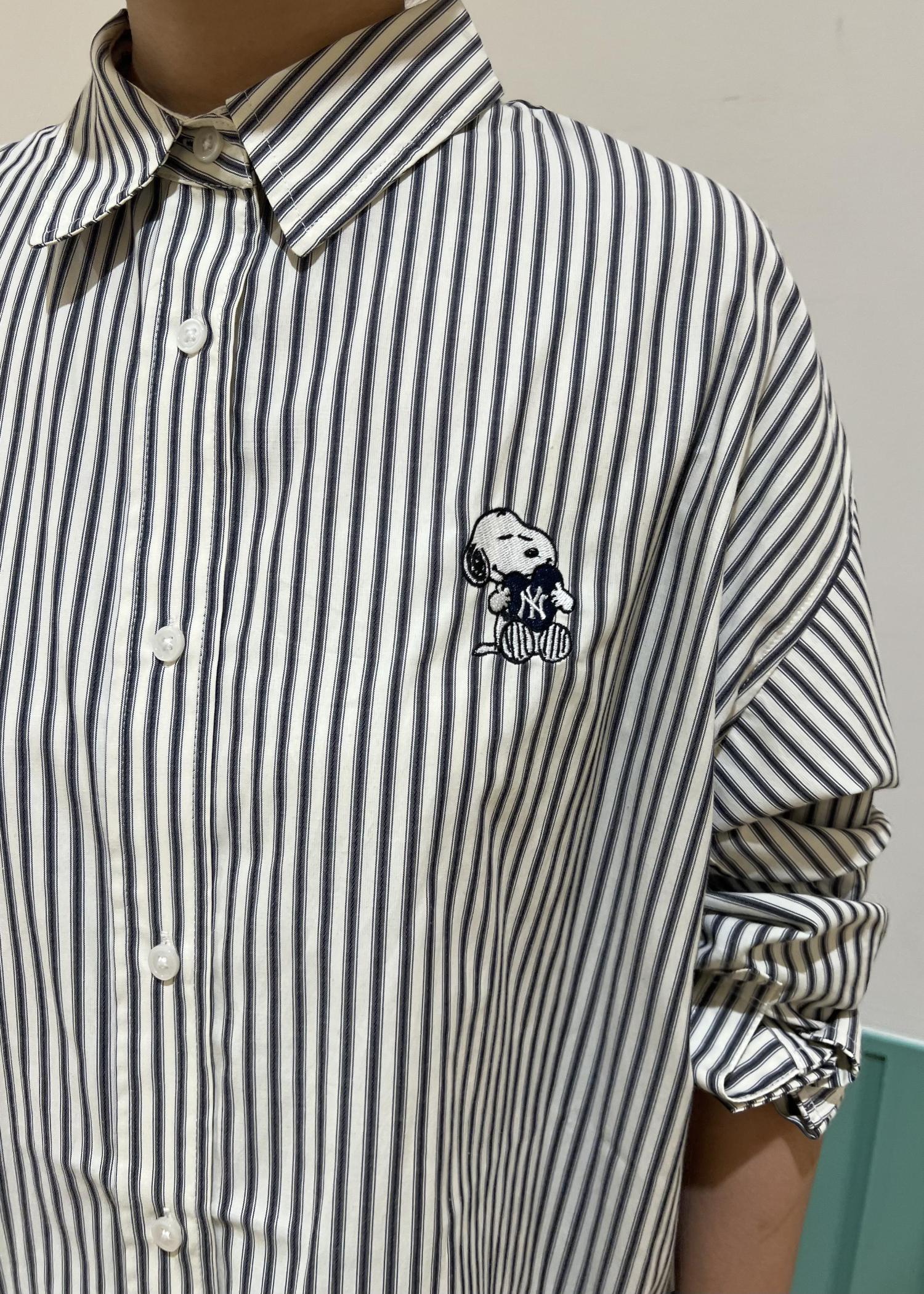 ゆるっと長めのシャツの着丈を活かしたスタイリング。
