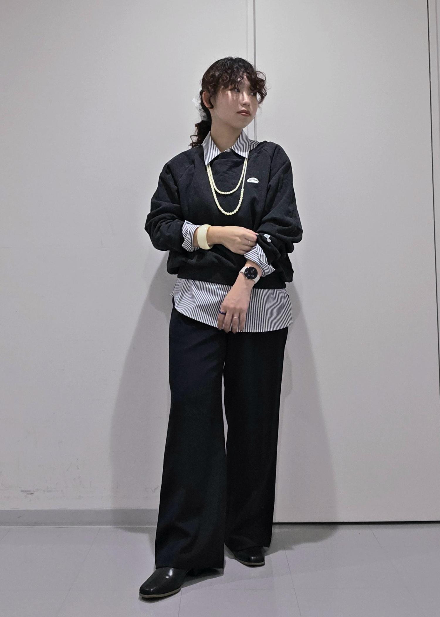 首元の開きが気になる方はシャツやタートルネックを合わせても◎ -