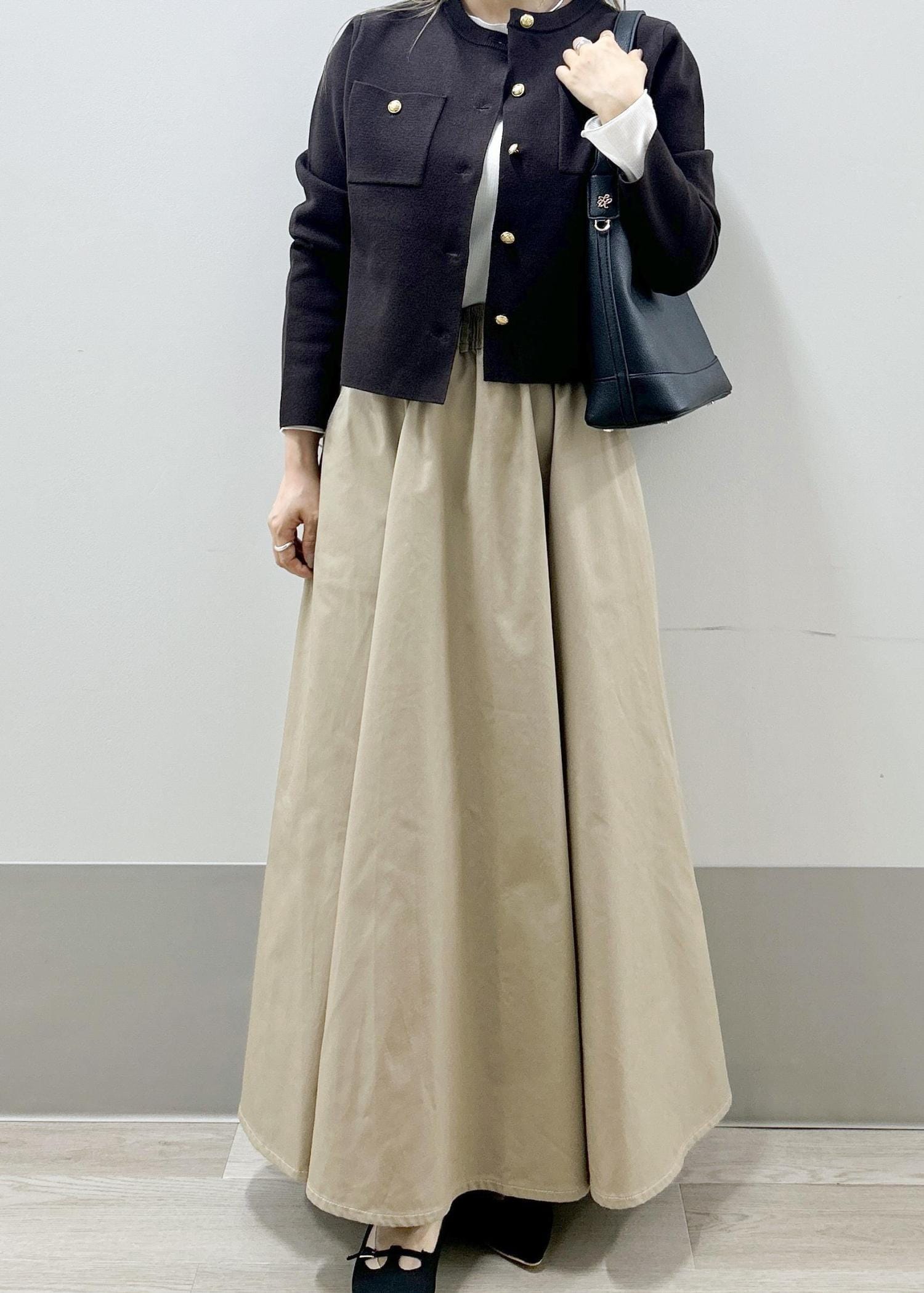 キレイなカーディガンとカジュアルライクなスカート合わせたスタイリングです。