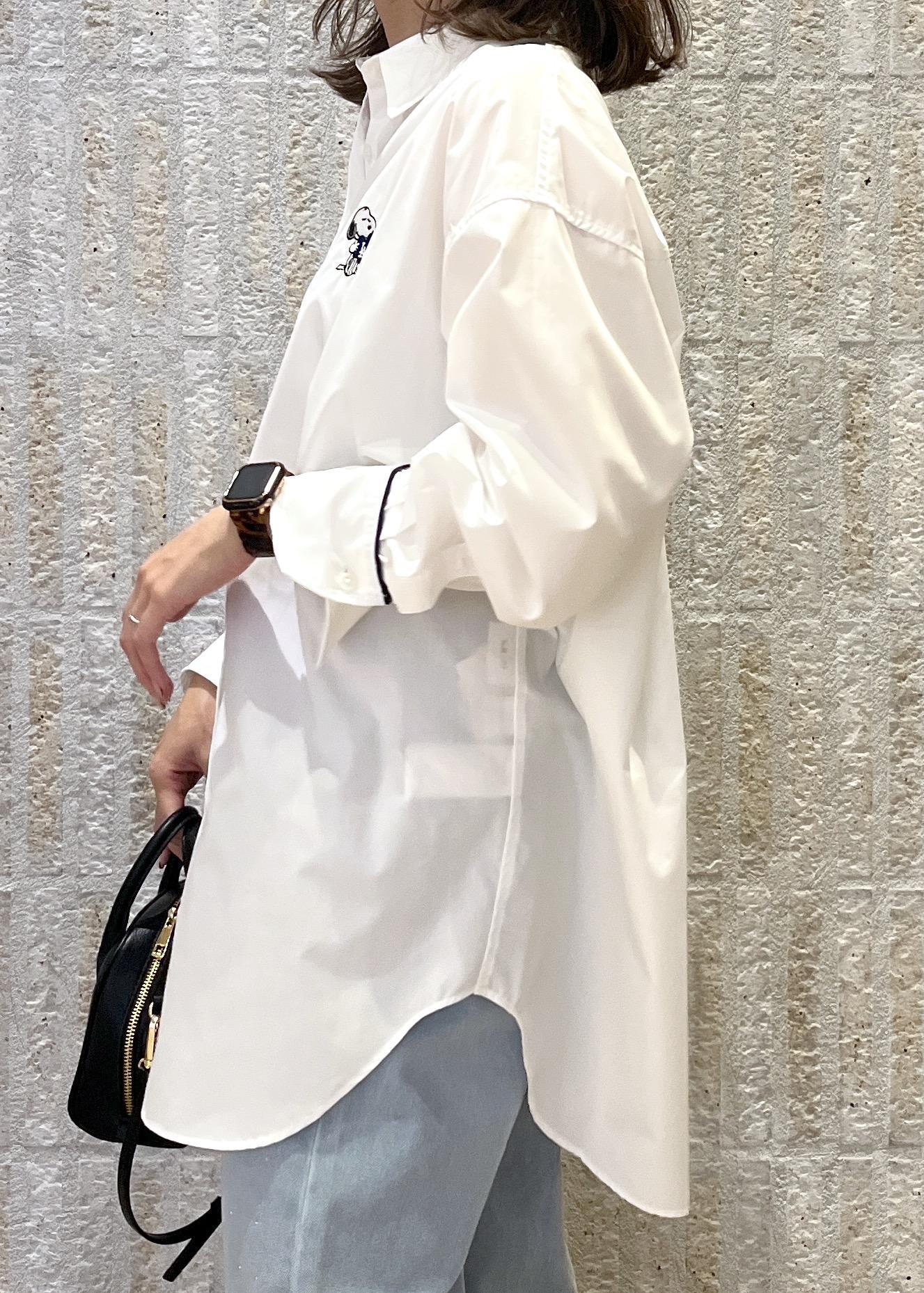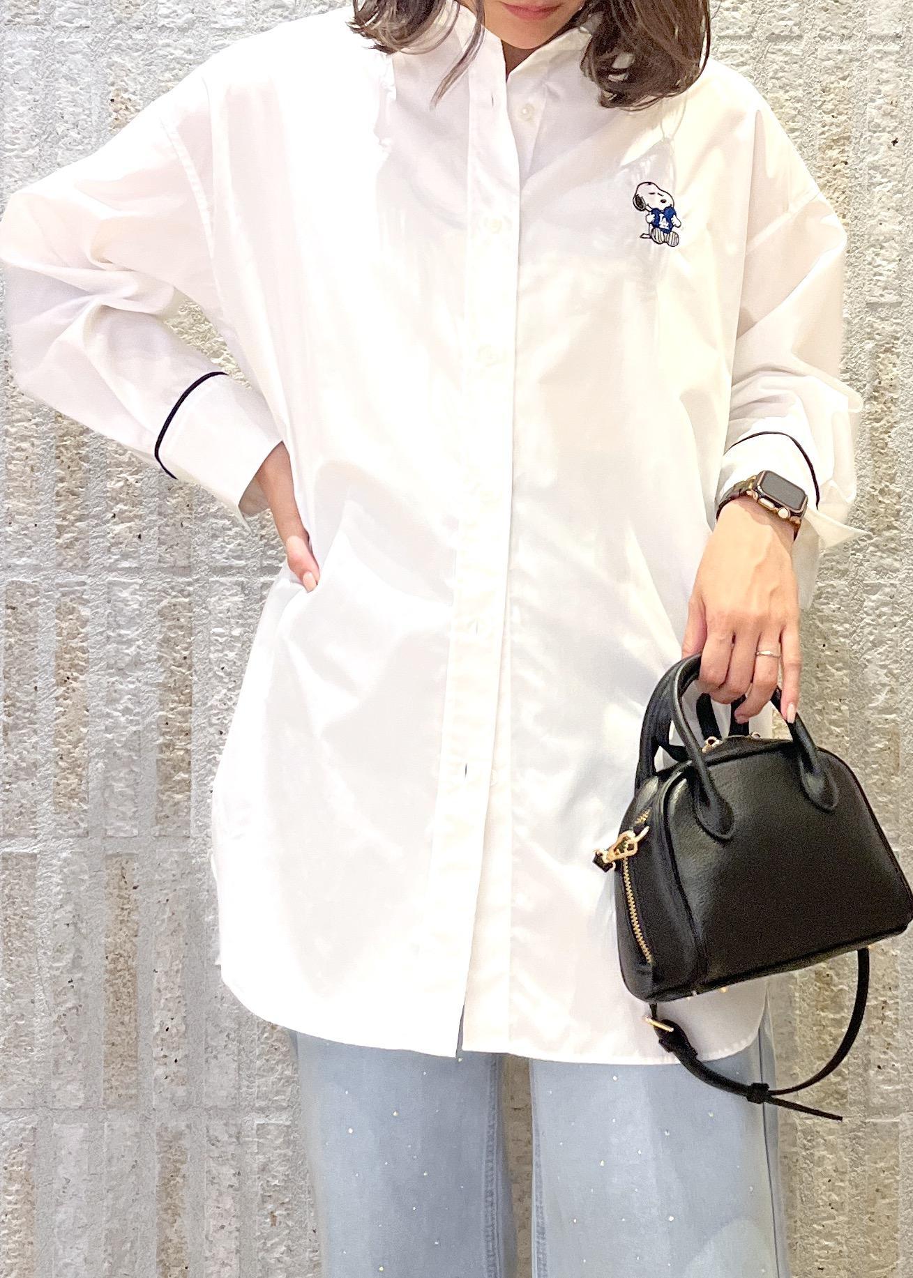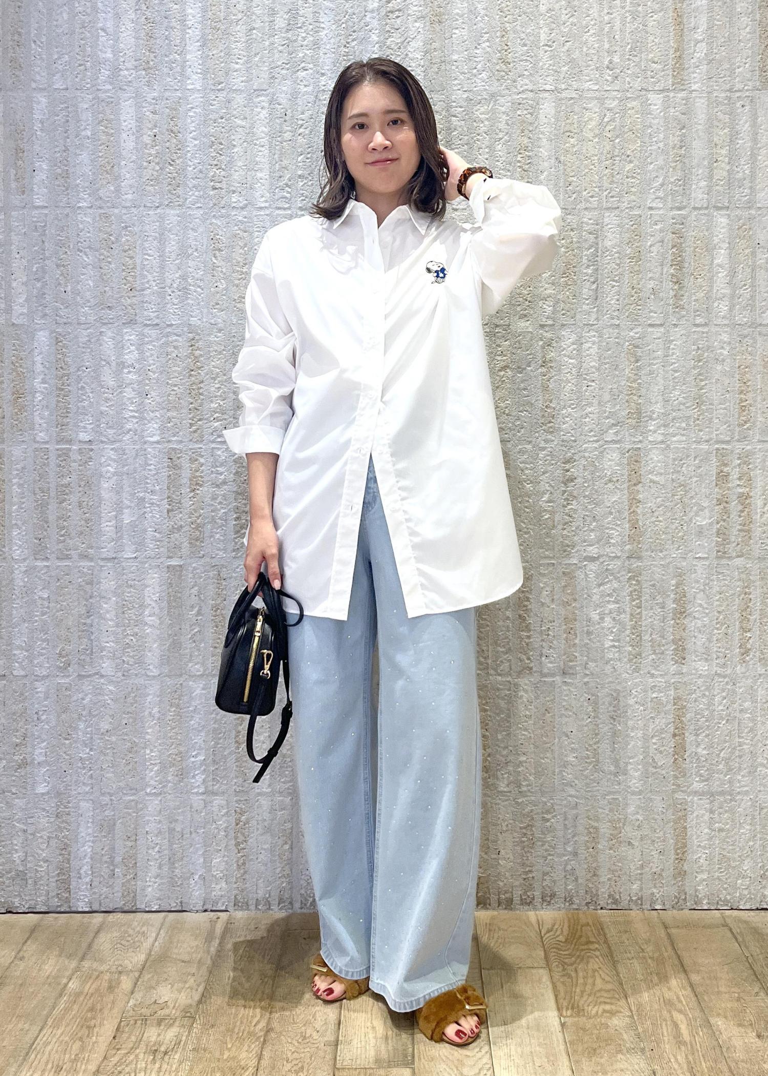 胸元にあるワンポイントのスヌーピーの刺繍が目を引くデザイン。シャツは無地でシンプルなのでパンツはビジューデニムで華やかに。