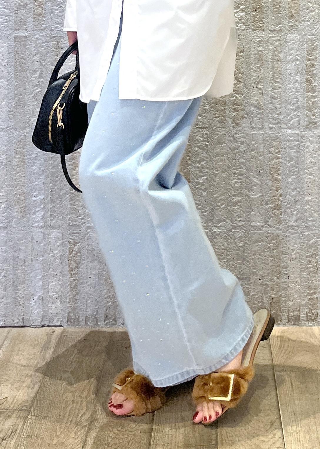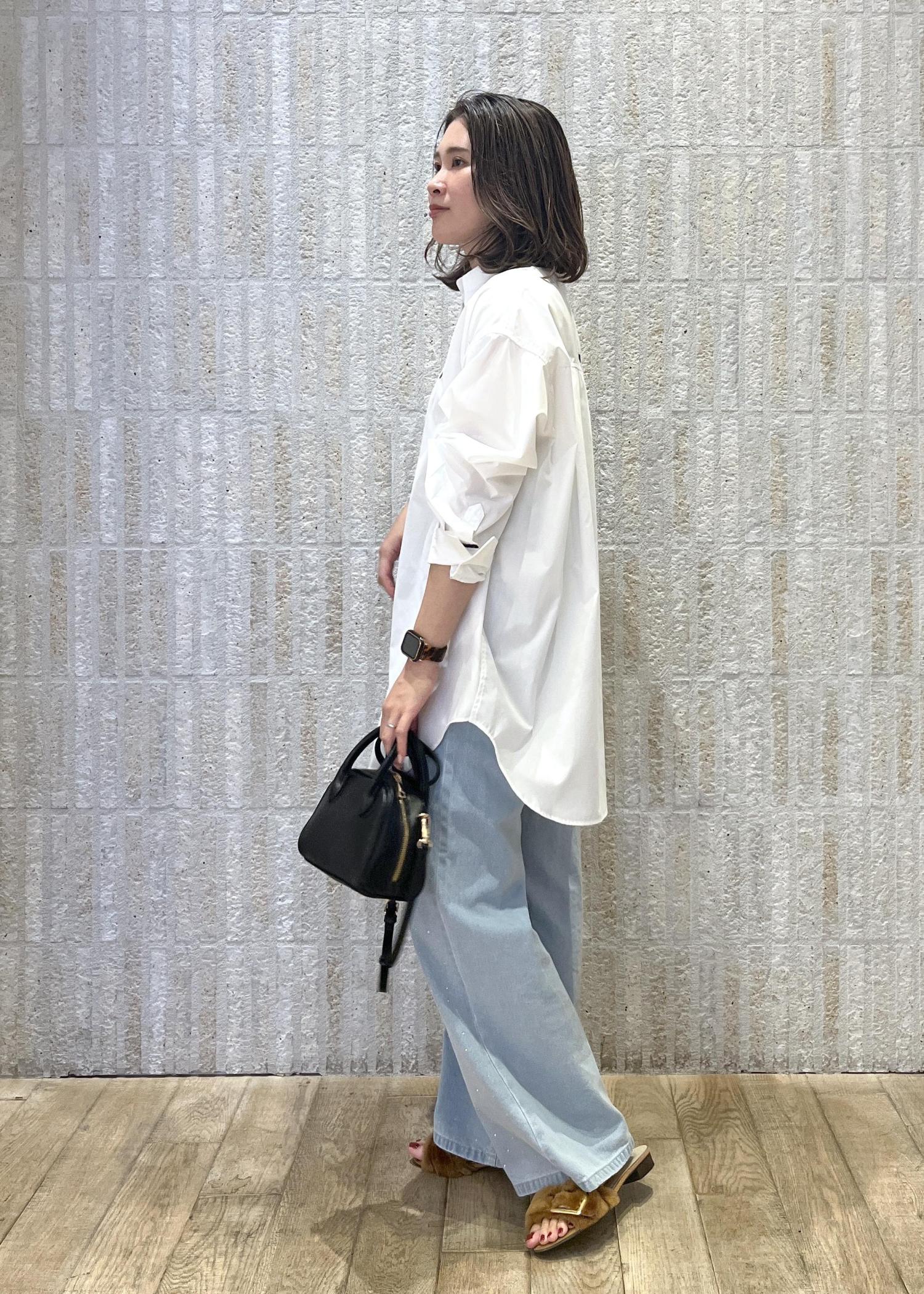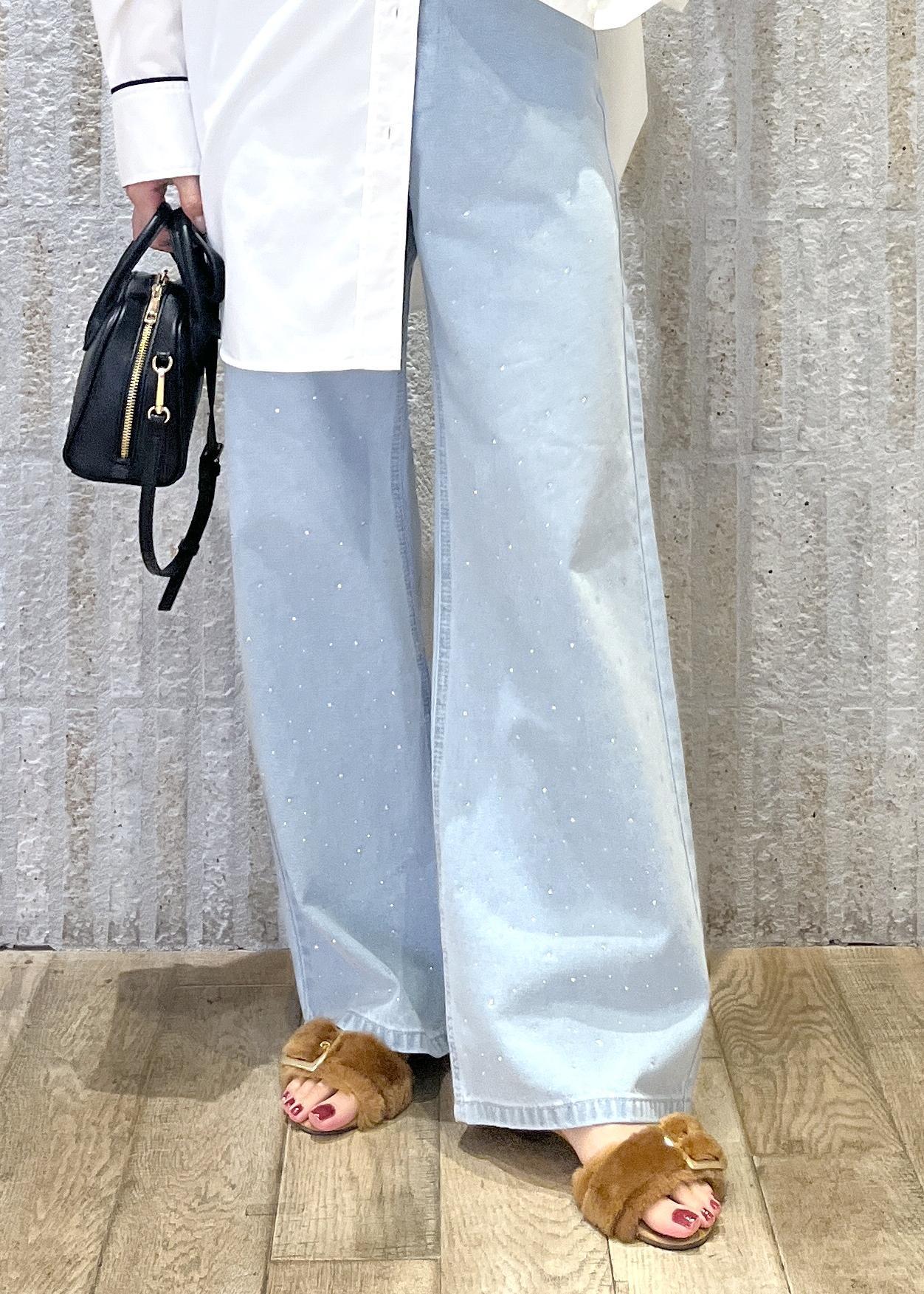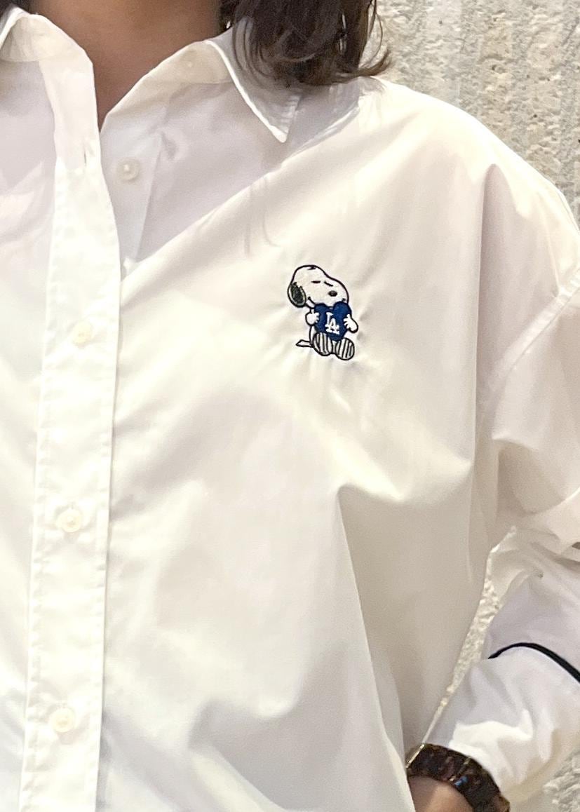 胸元にあるワンポイントのスヌーピーの刺繍が目を引くデザイン。シャツは無地でシンプルなのでパンツはビジューデニムで華やかに。