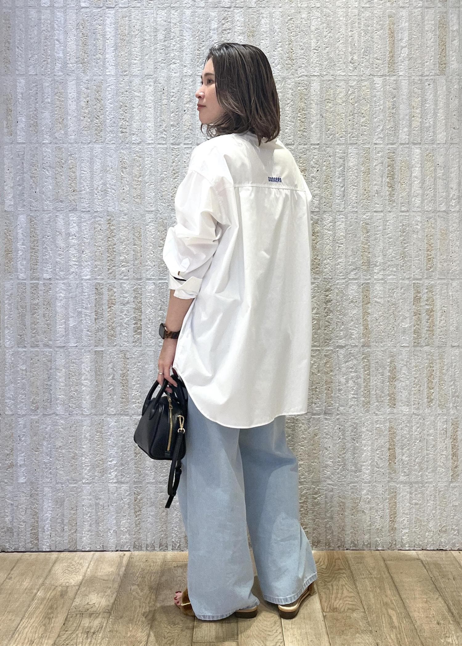 MLB×PEANUTS Collectionのシャツをデニムパンツで合わせたシンプルスタイリングです。