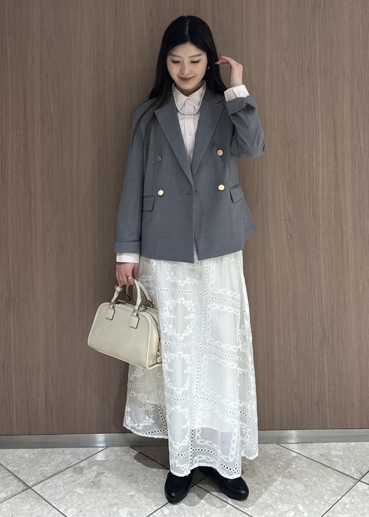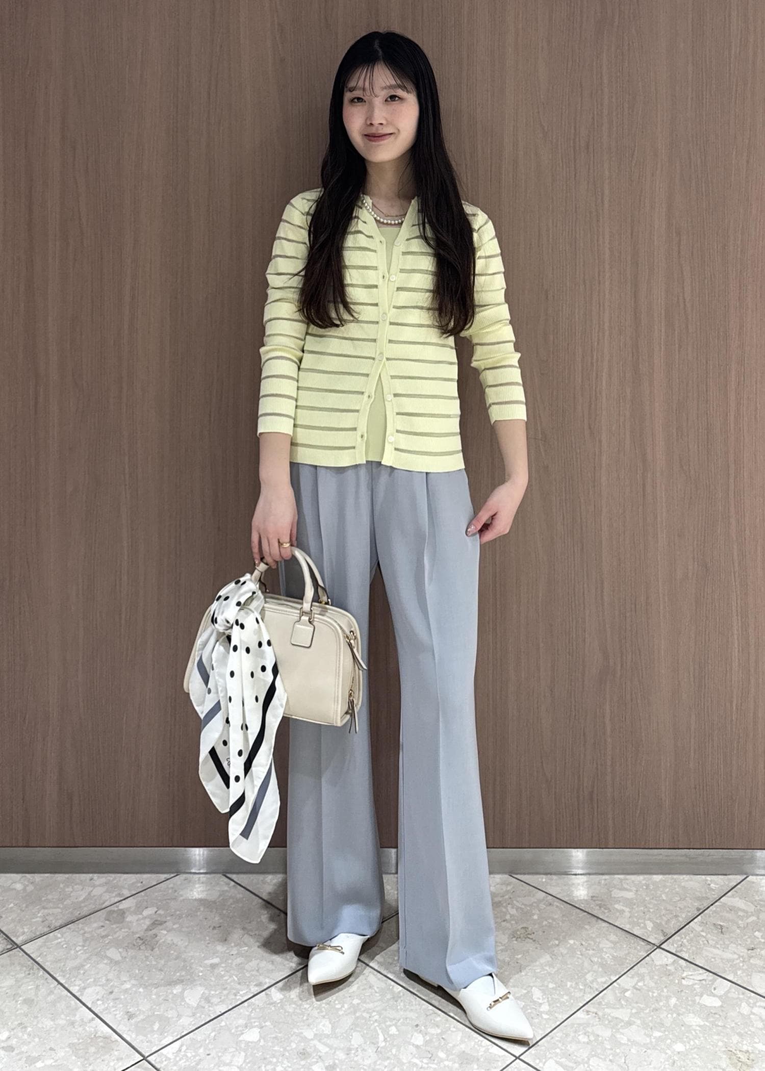 肩掛けしているカーディガンですが、Vネックになっているので、首元を綺麗に見せてくれます!羽織としてもこのようなアレンジとしてもお使いいただけます!