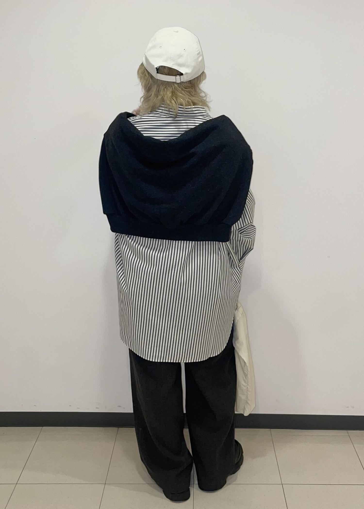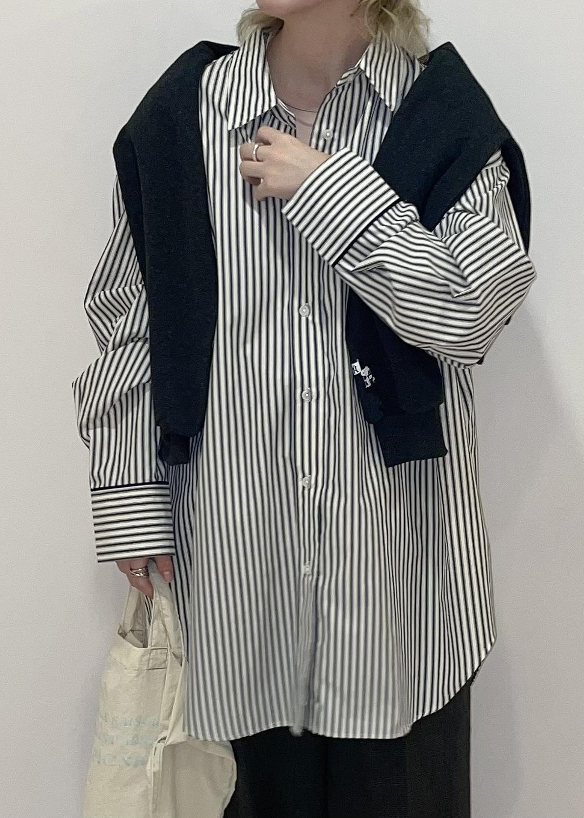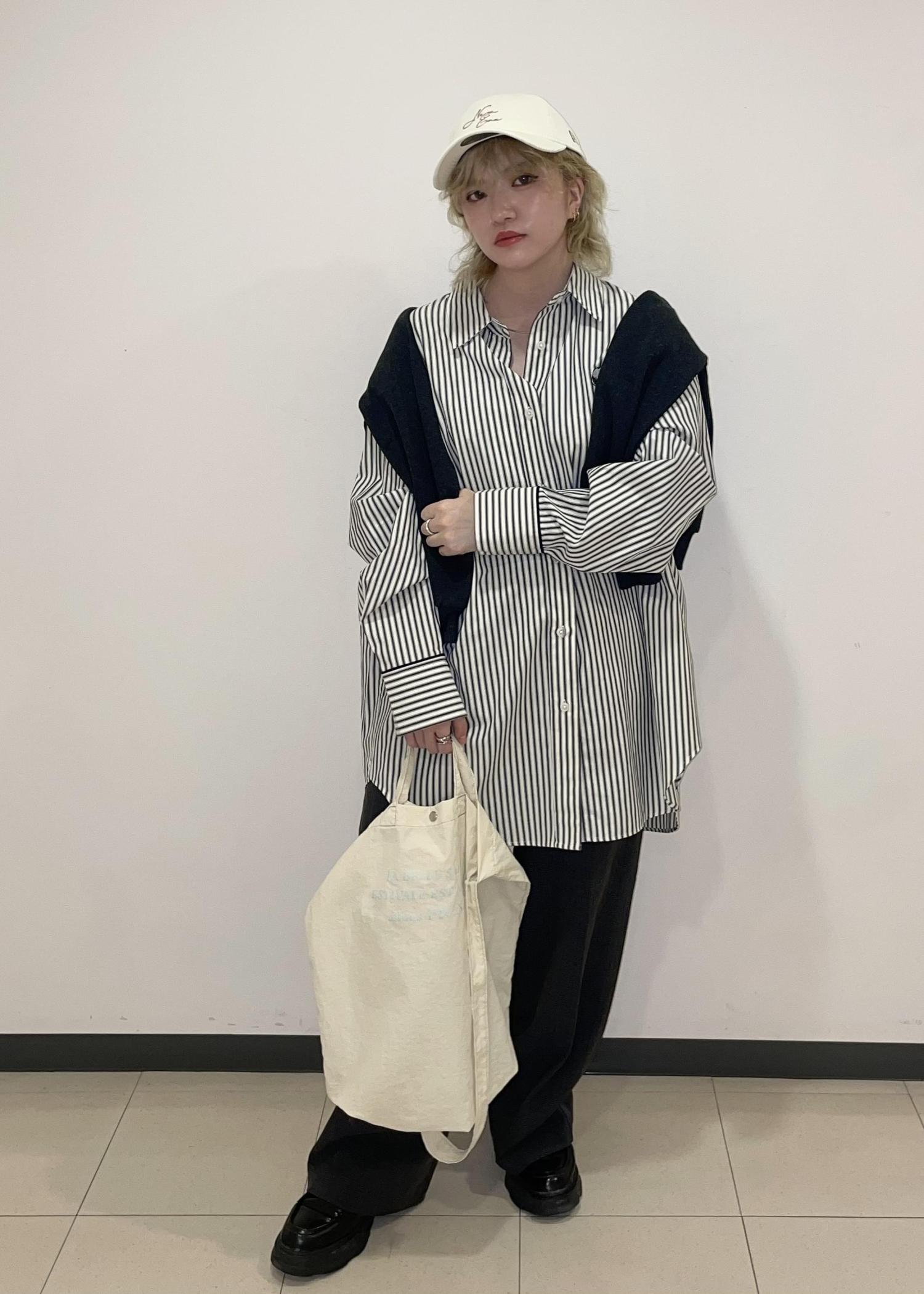 低身長の方でも丈の長いボトムや、目線が上にいくようなコーデにすることでロングシャツでも着られている感が解消できます。