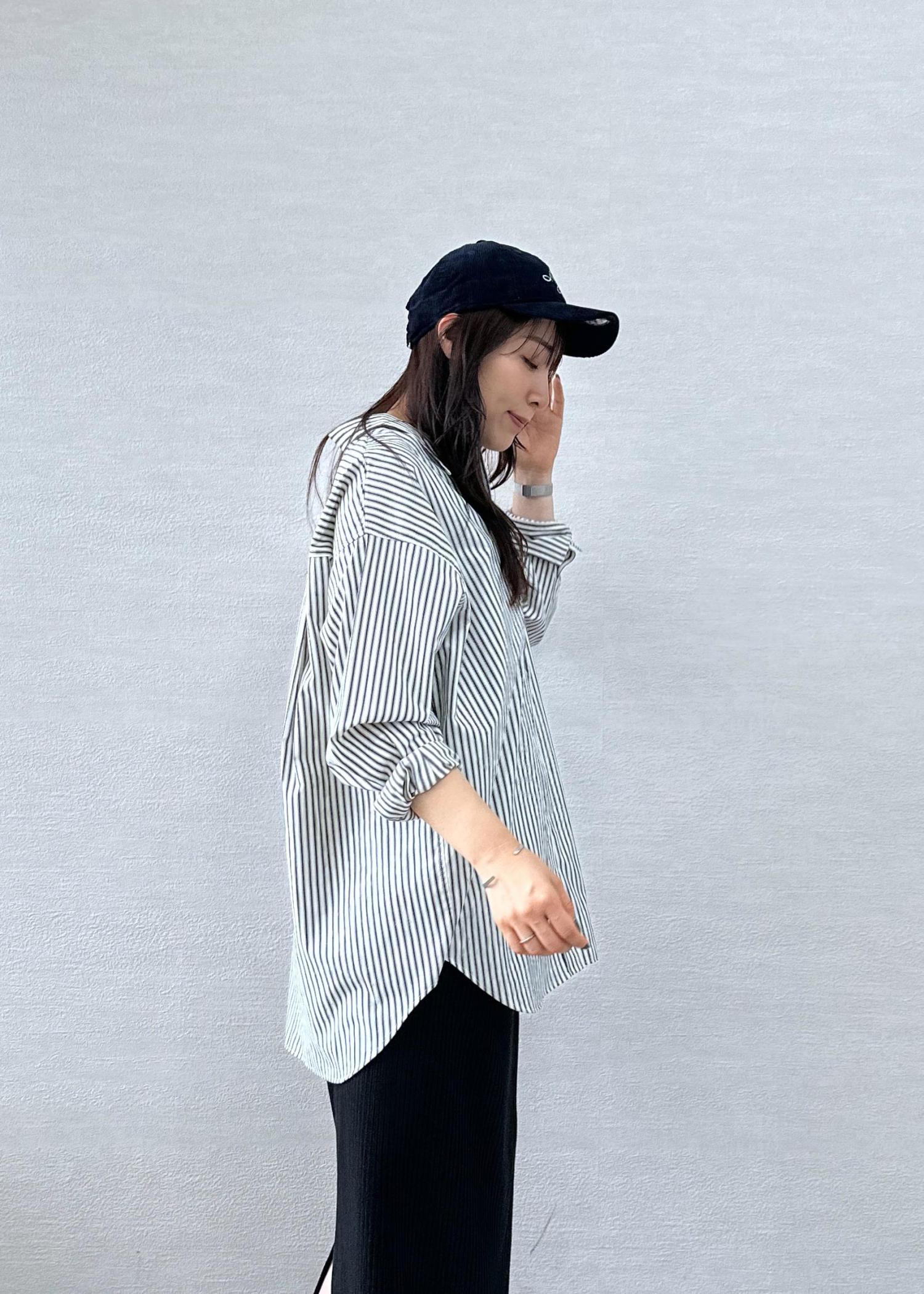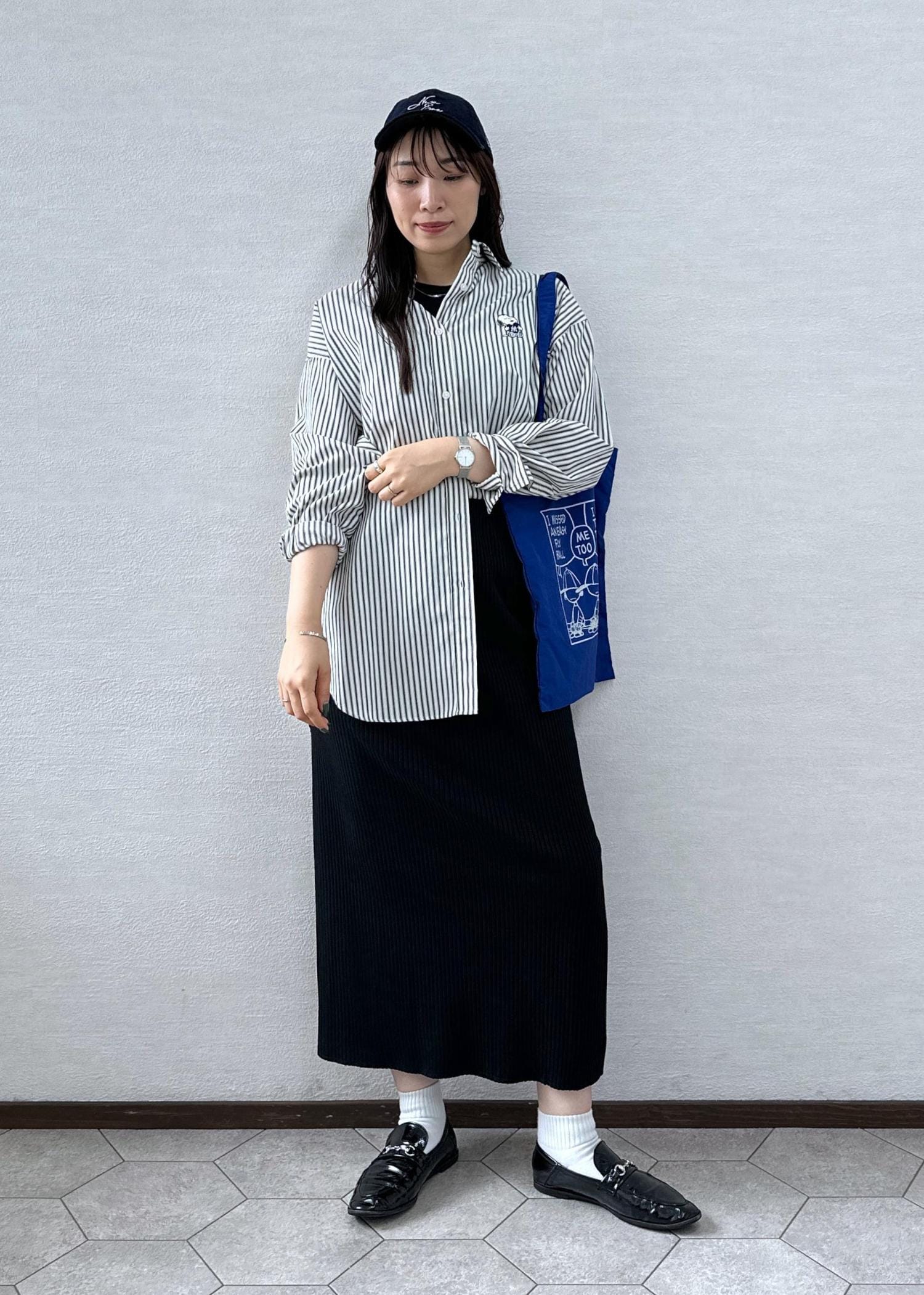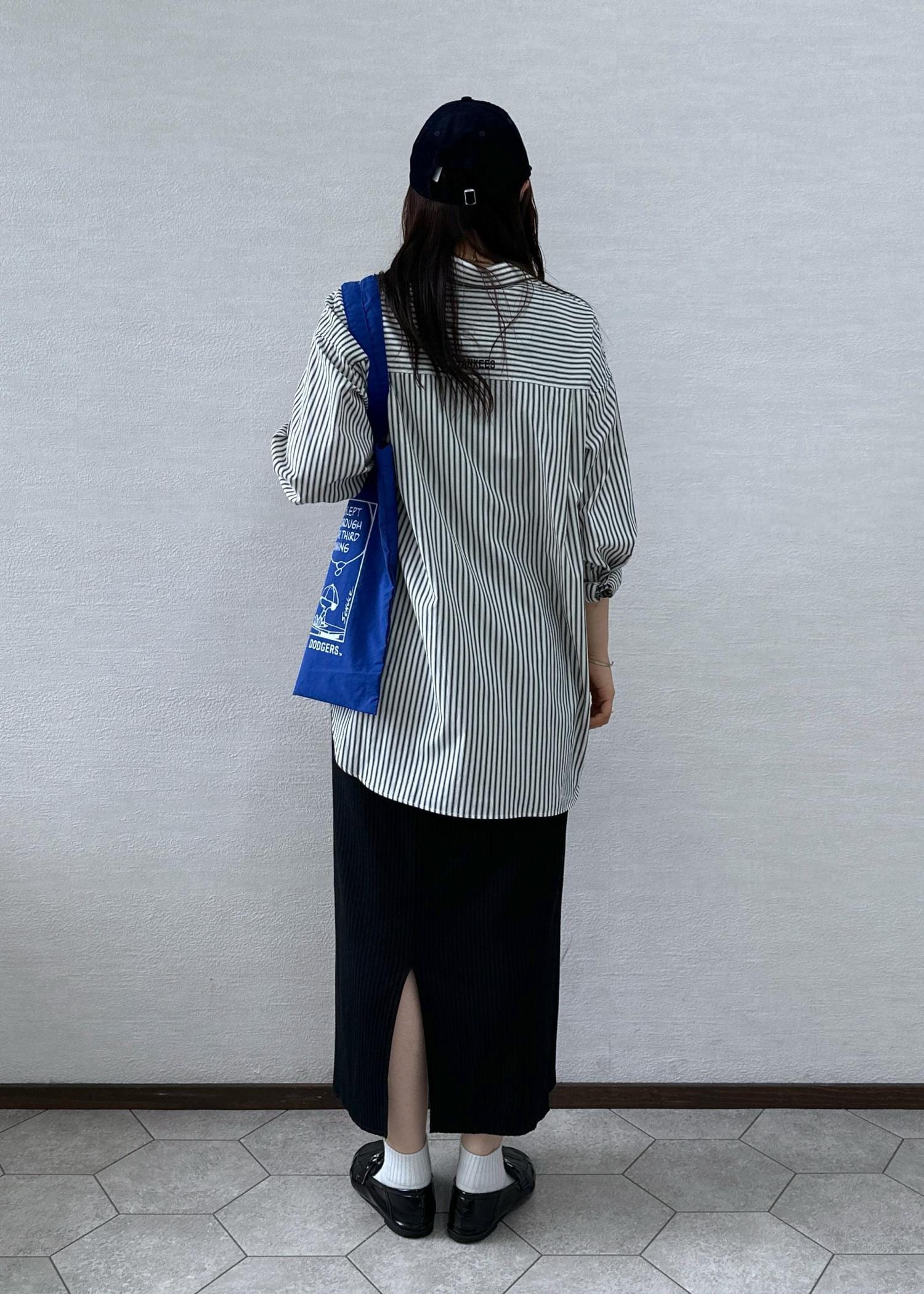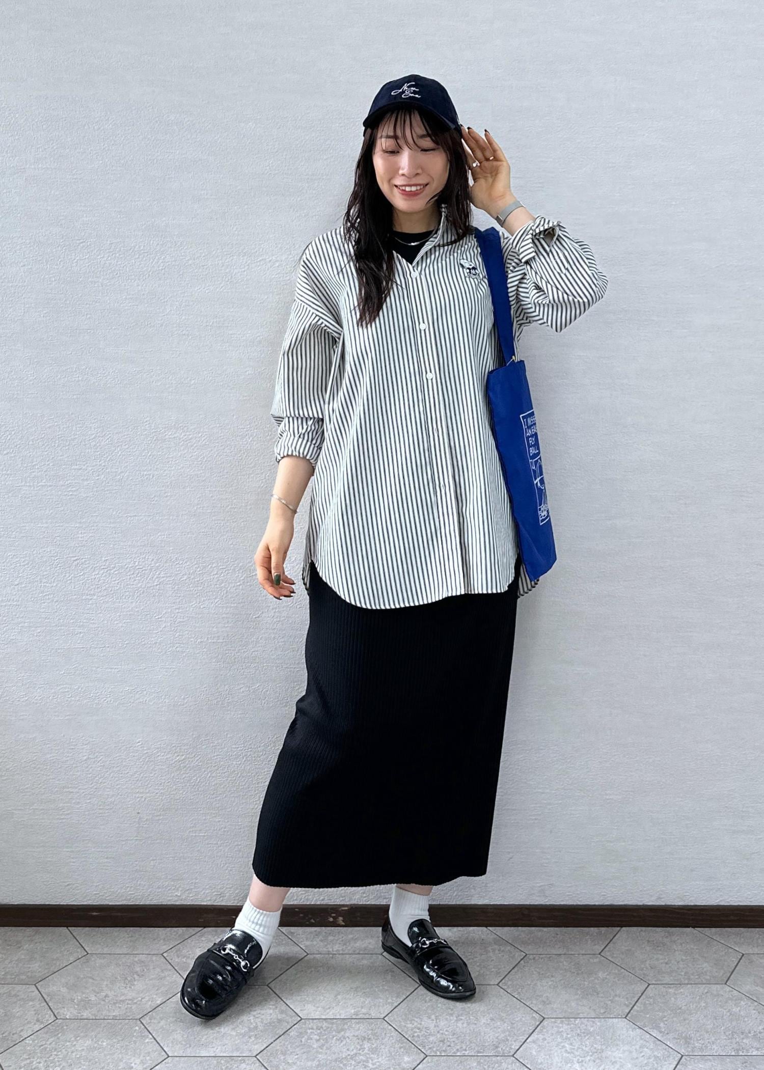 メンズライクなシャツなのでタイトスカートを合わせて女性らしさをプラスしました♩