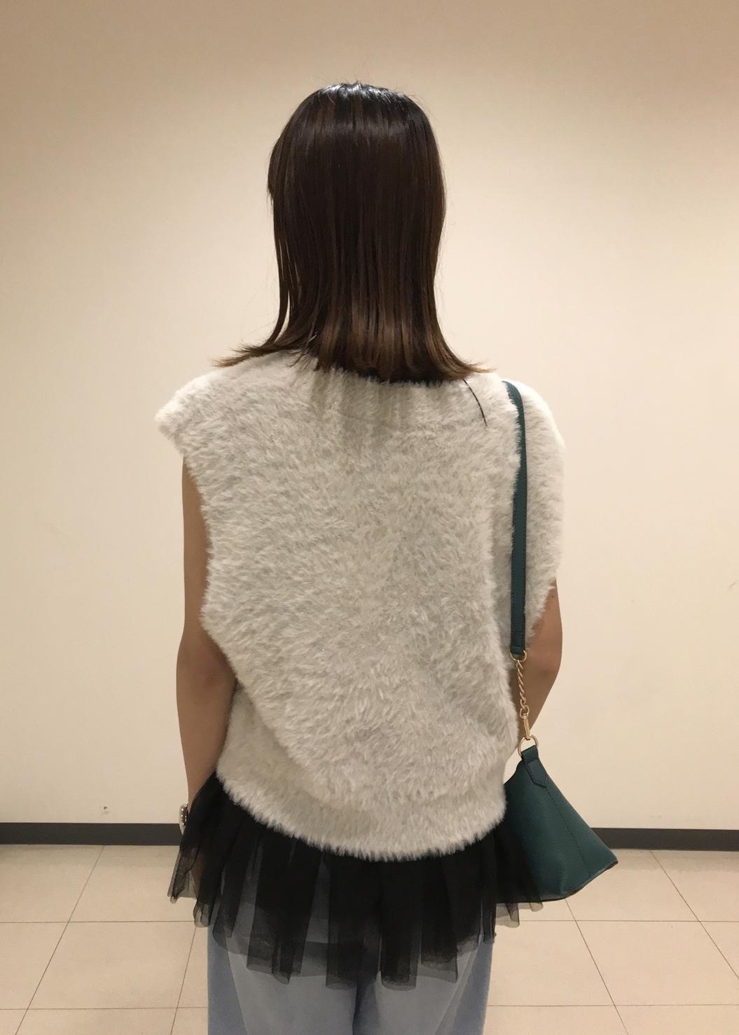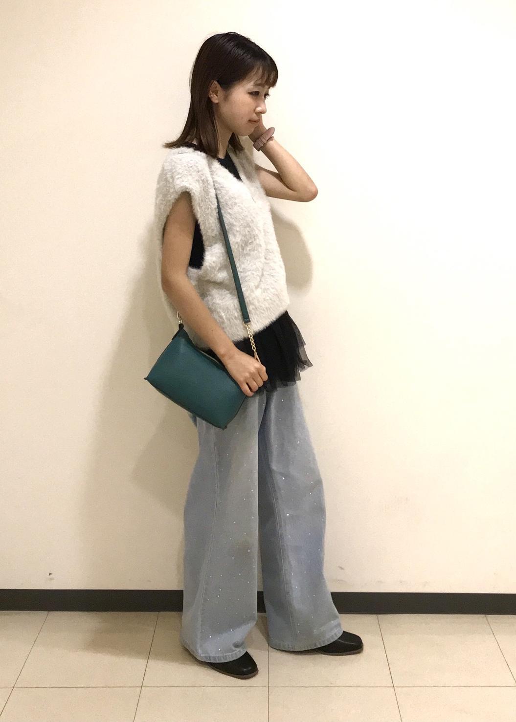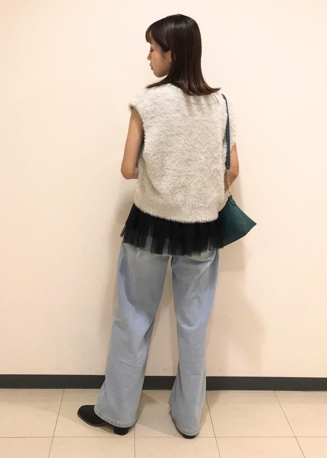 ファーベストの裾からフリルが見えるように合わせ、ボトムをデニムパンツにすることで大人っぽいキレイめカジュアルコーデに✨