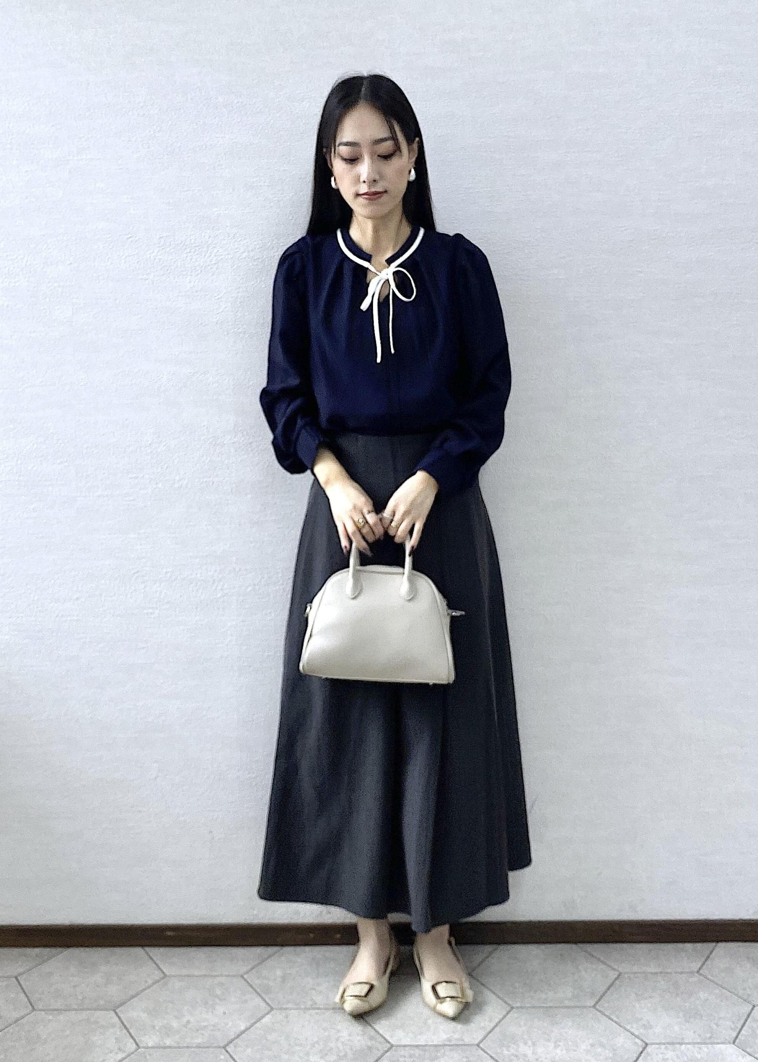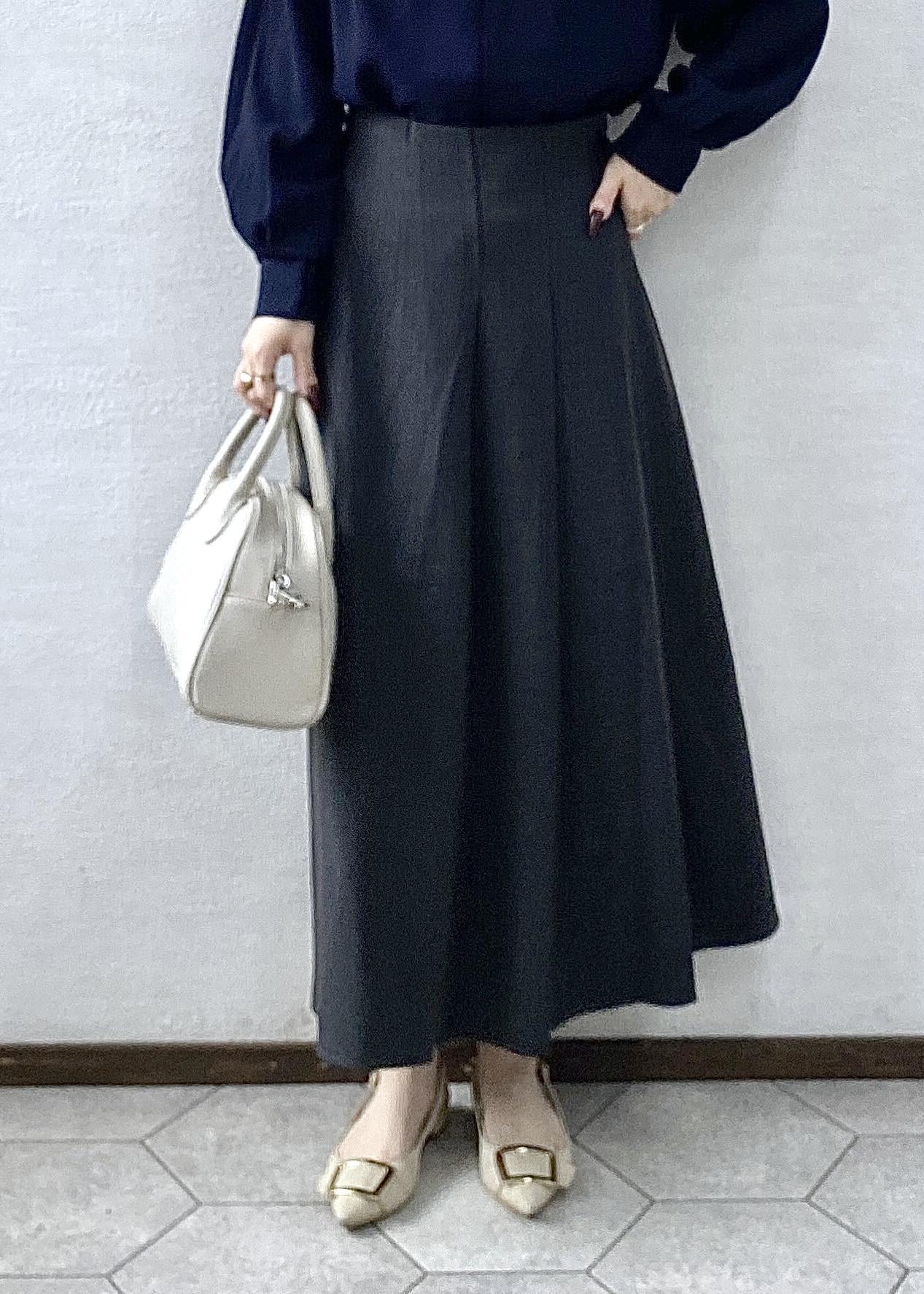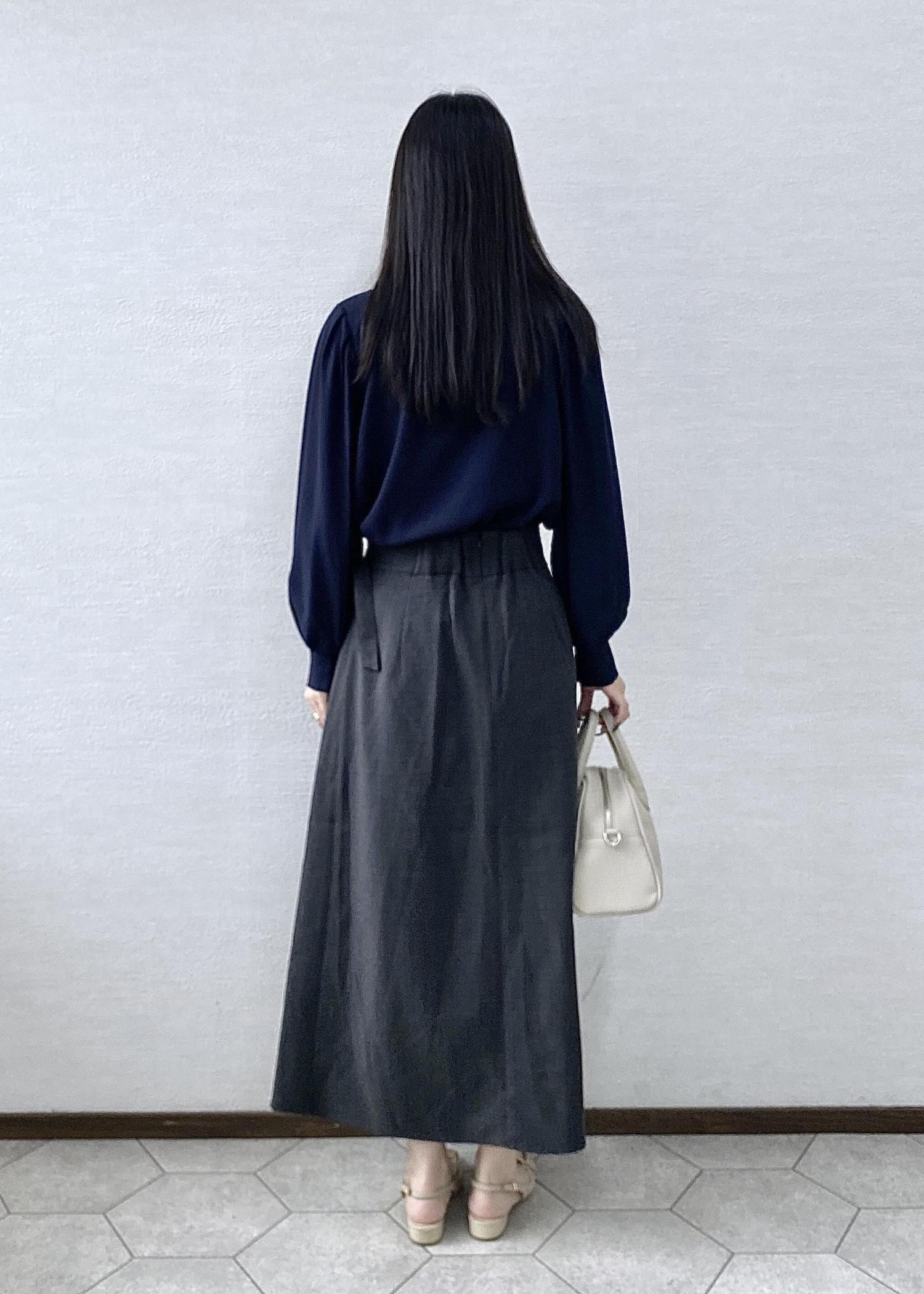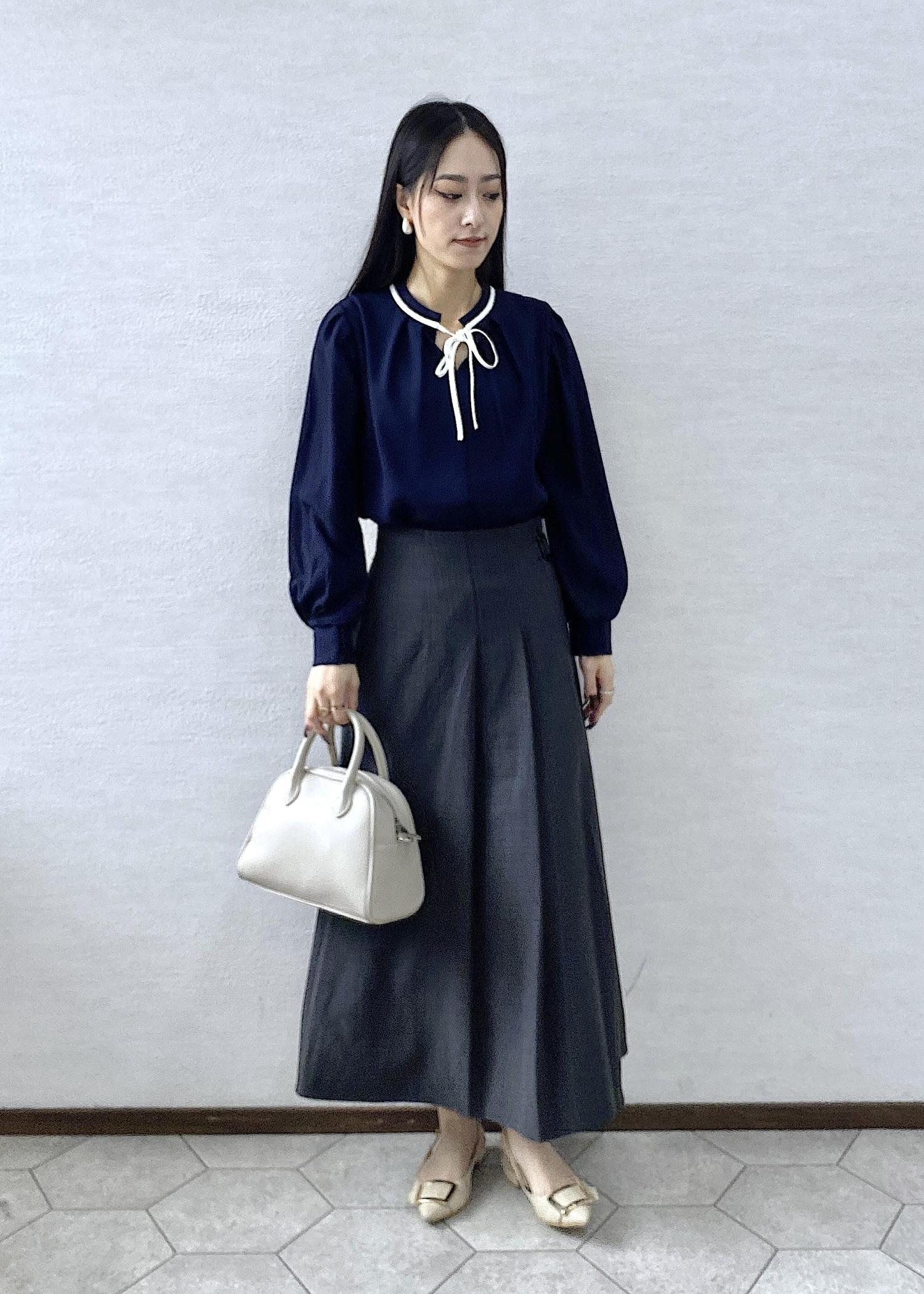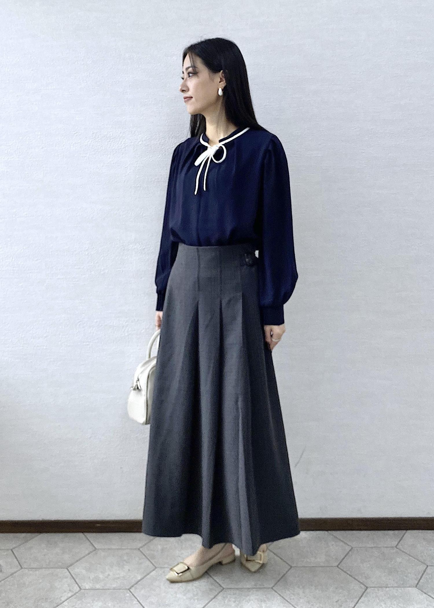 毎年人気のレディハンサムシリーズのスカートに前後2WAYで着回しできるブラウスを合わせたお仕事にぴったりなコーディネートです。