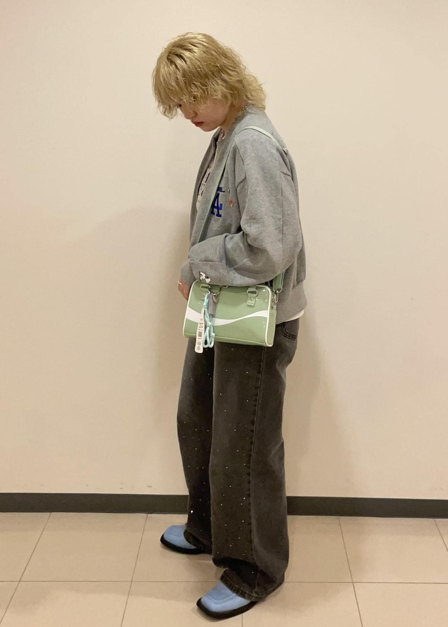 スウェット×デニムのカジュアルなスタイルにローファーやエナメルバッグなどを合わせることですっきりとして綺麗な印象に。