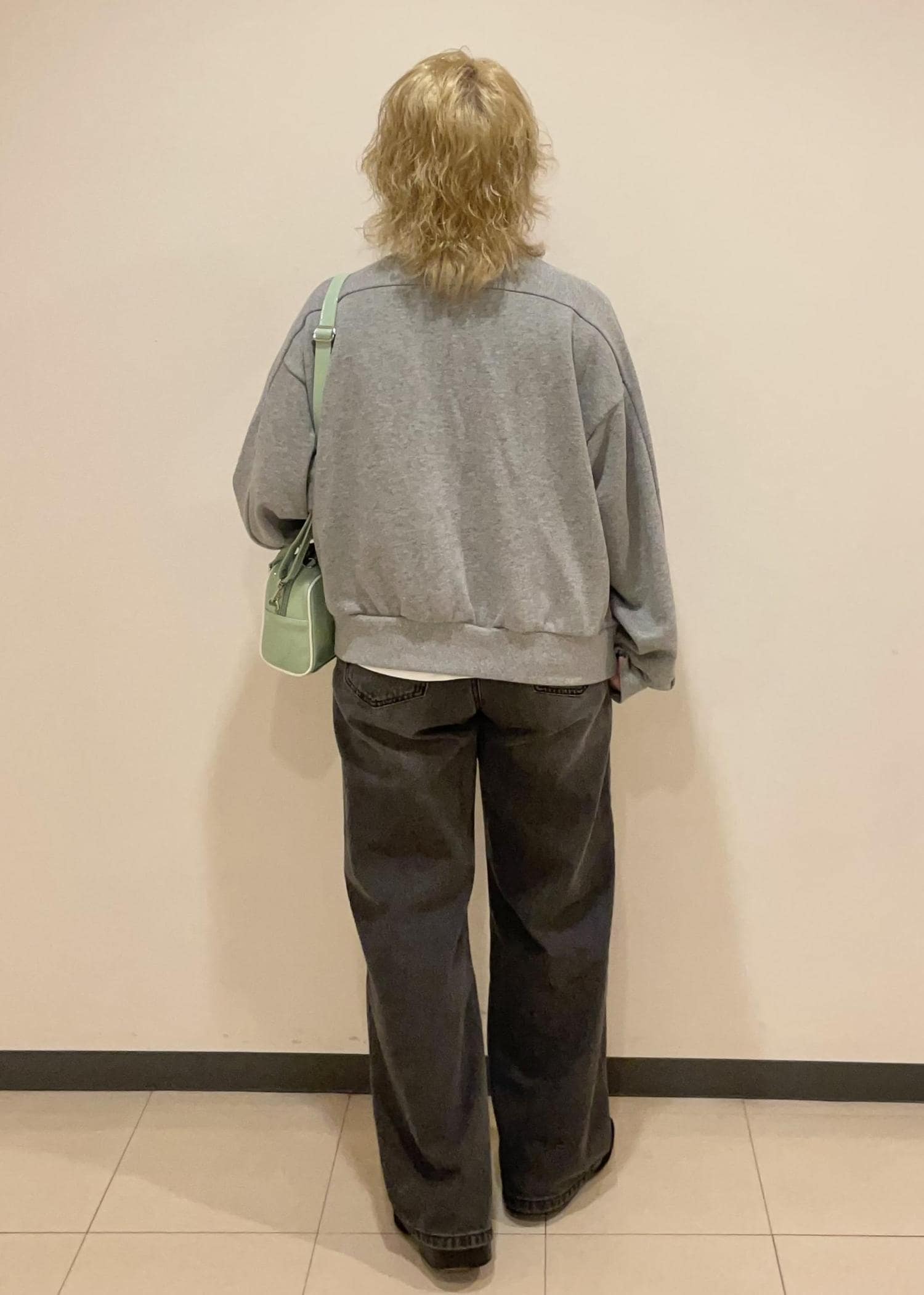 スウェットカーデ×デニムパンツ