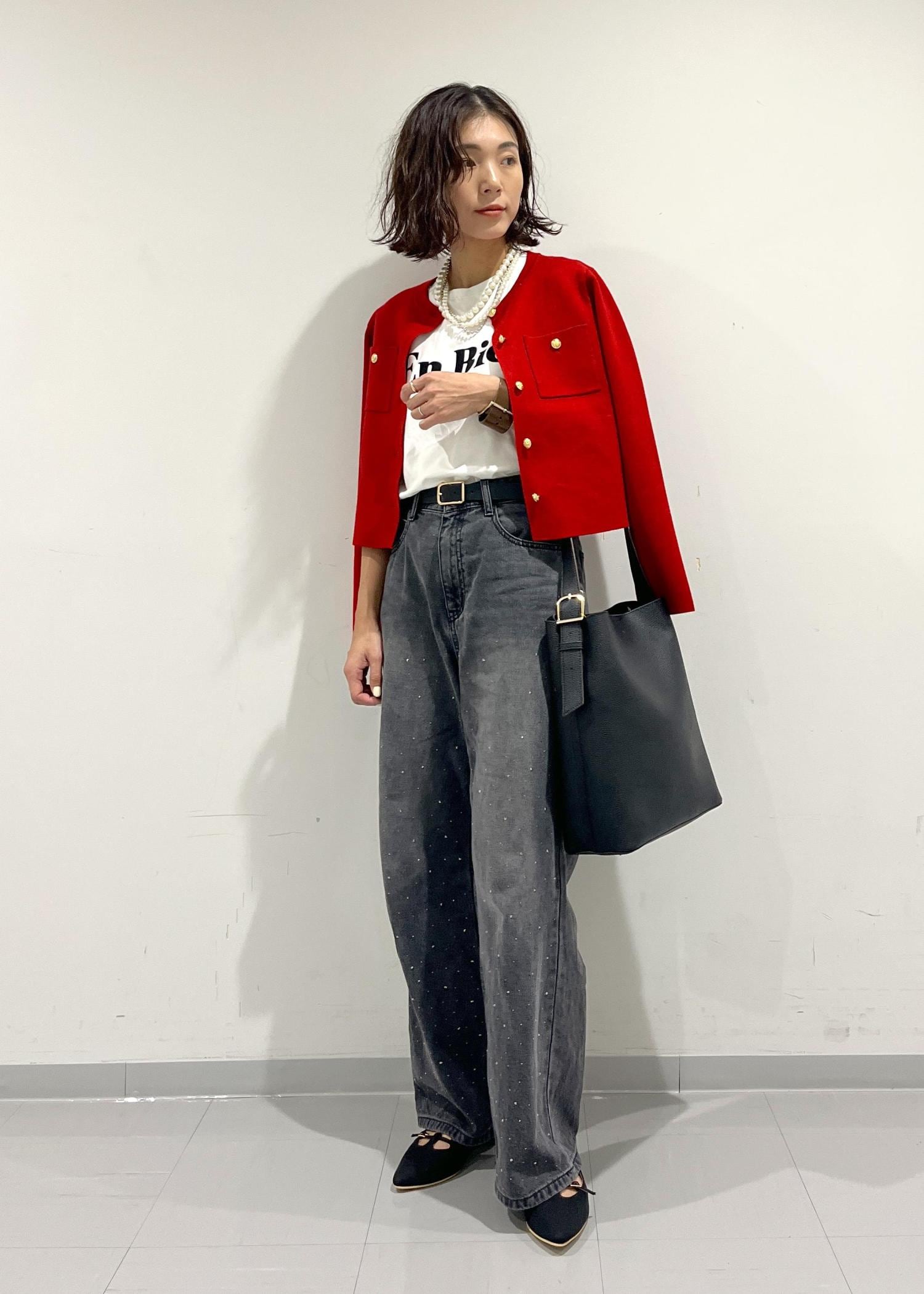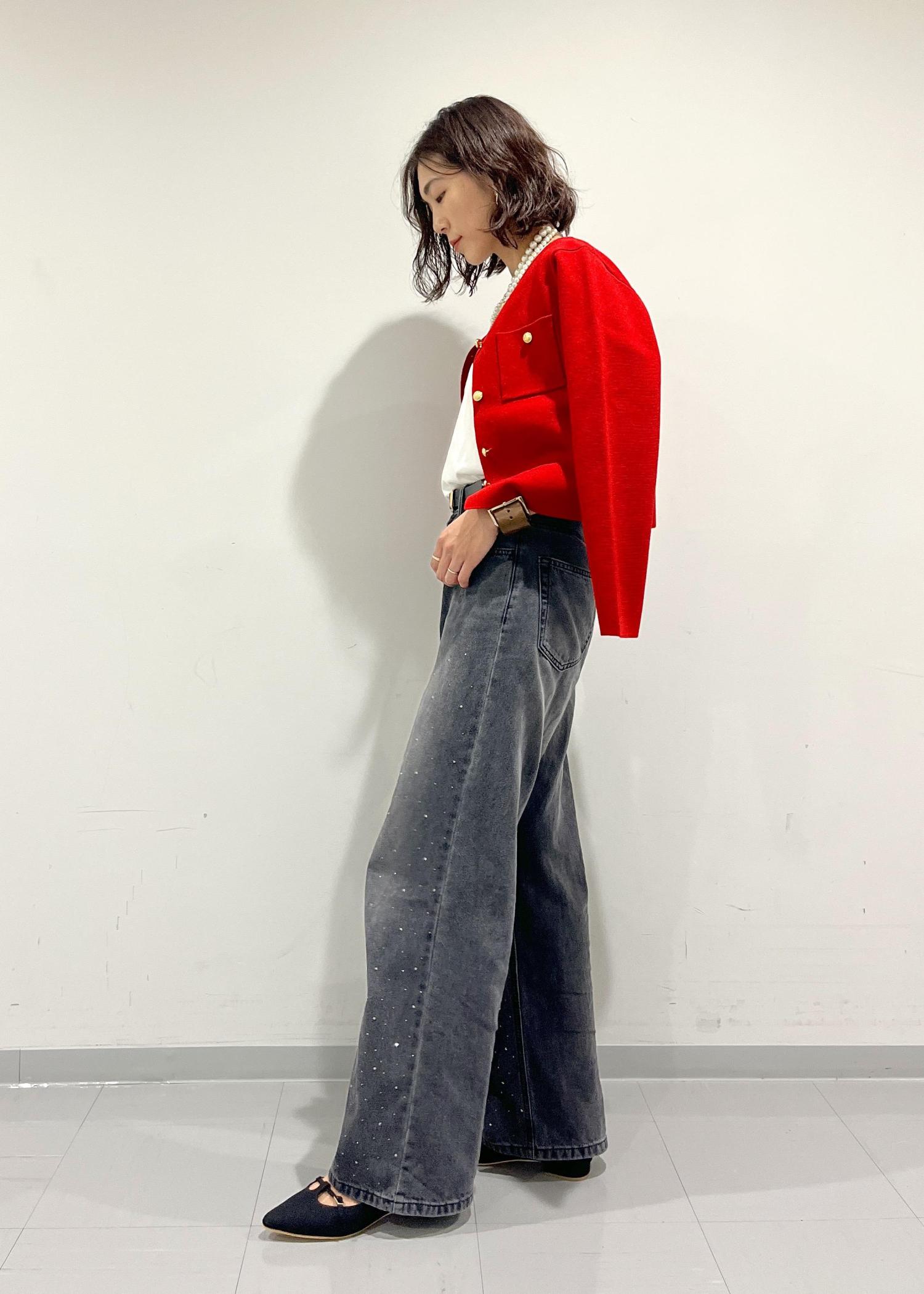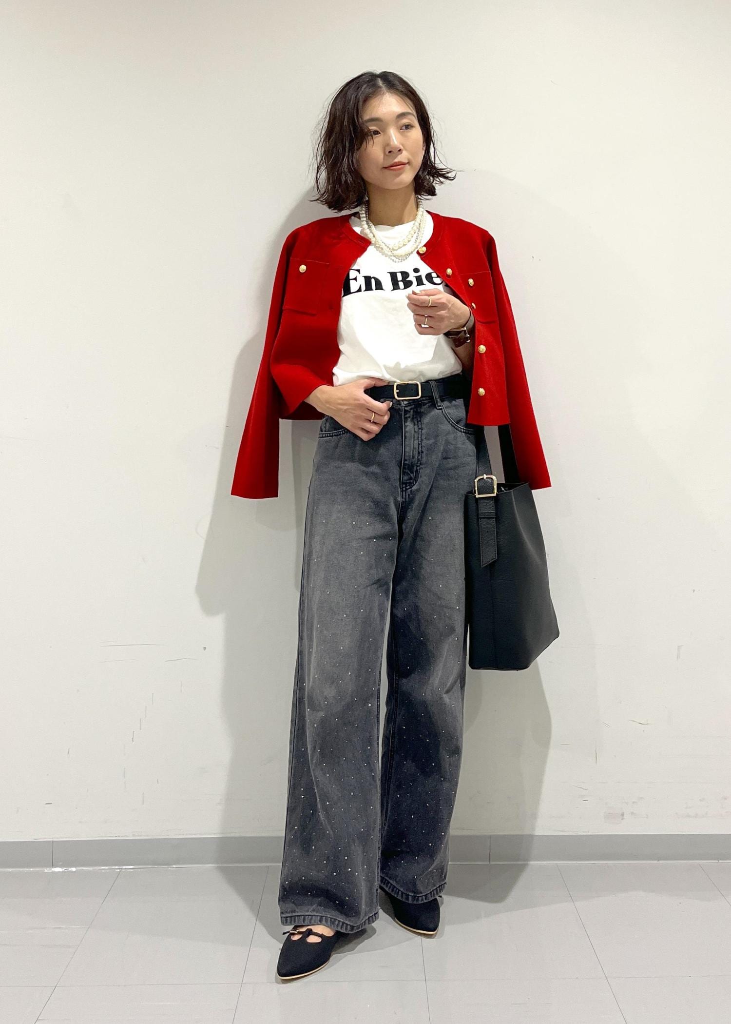 真っ赤なニットが主役ではありますが、キツくなりすぎないよう黒ではなくグレー系のボトムをチョイスしました。