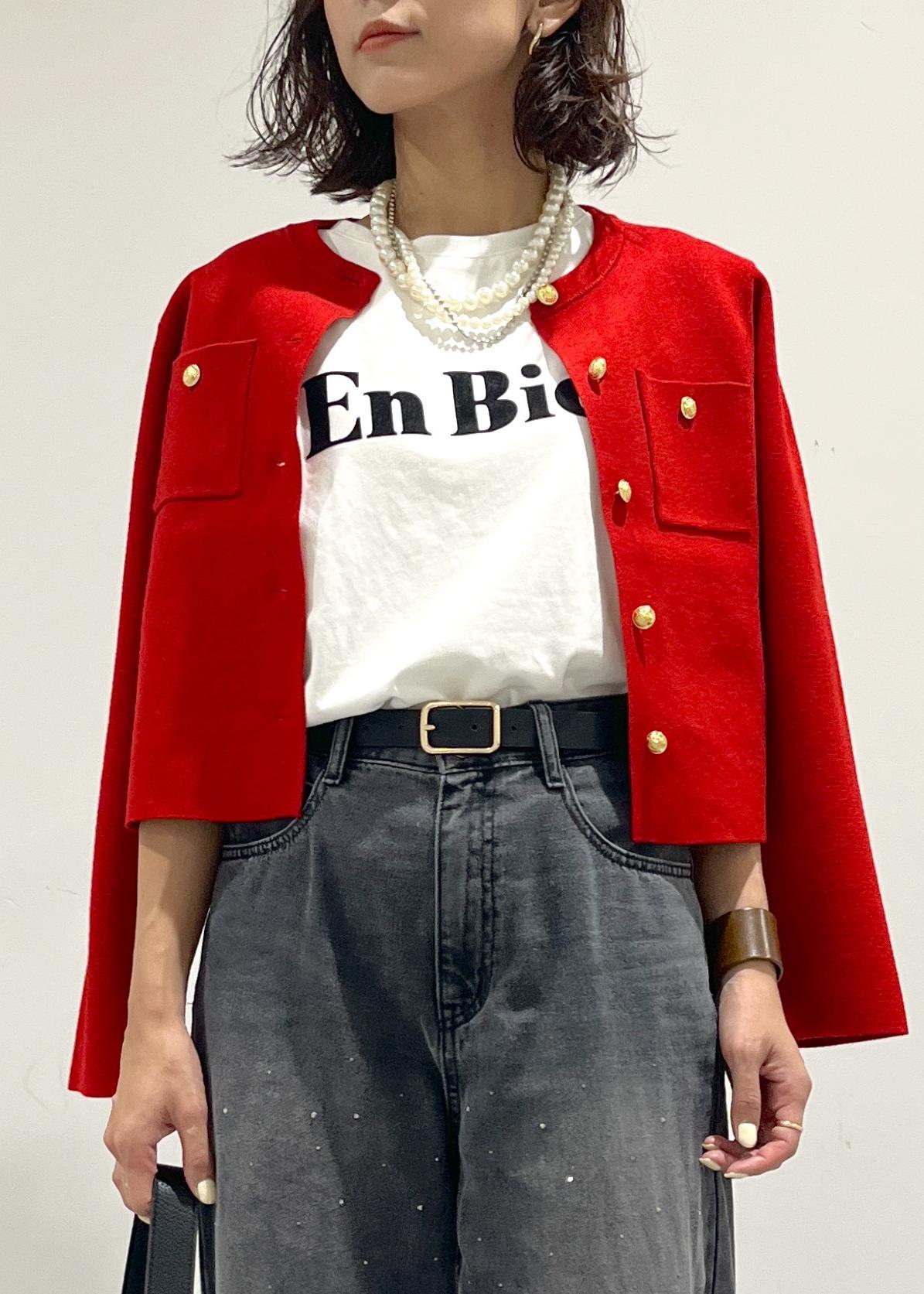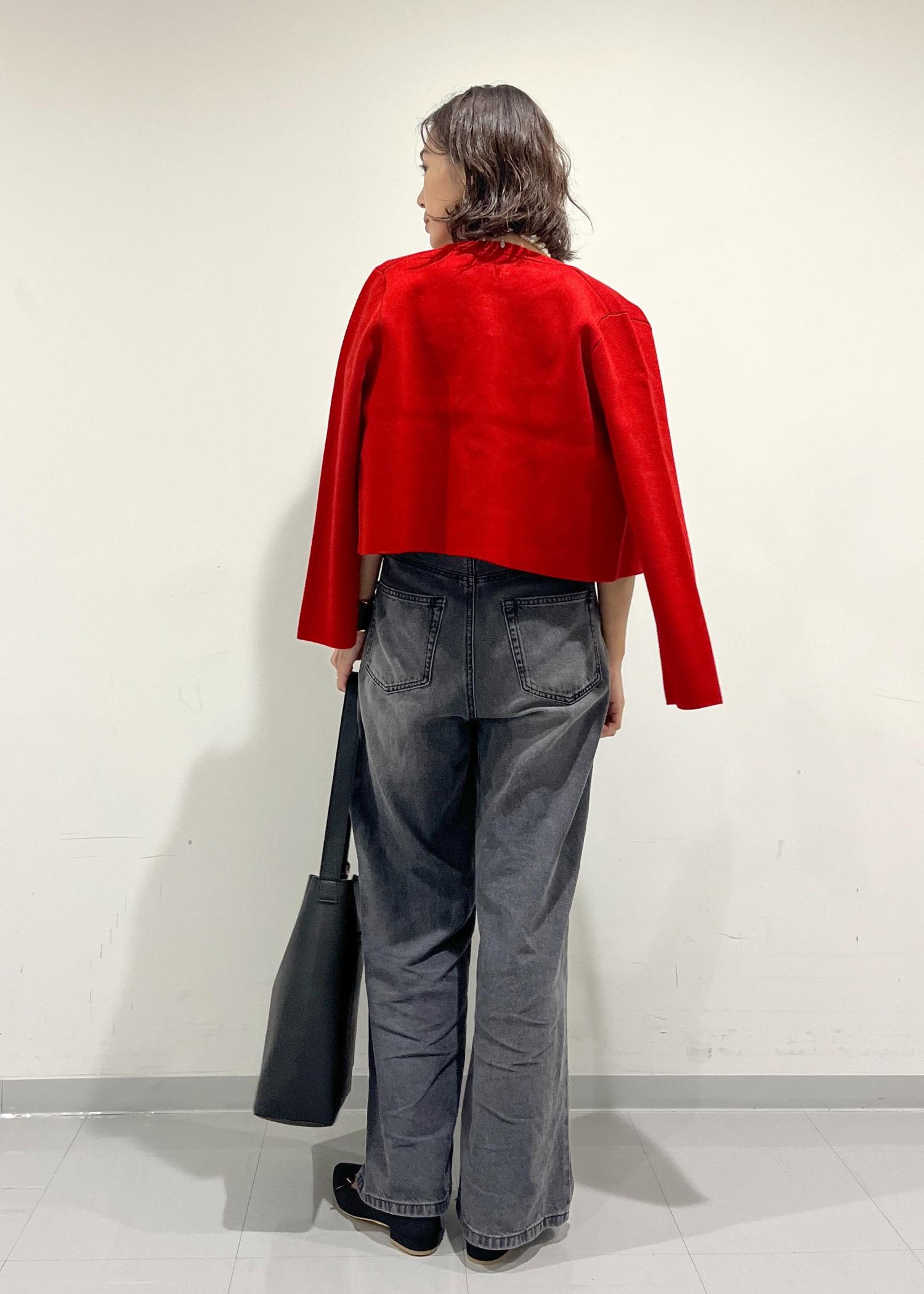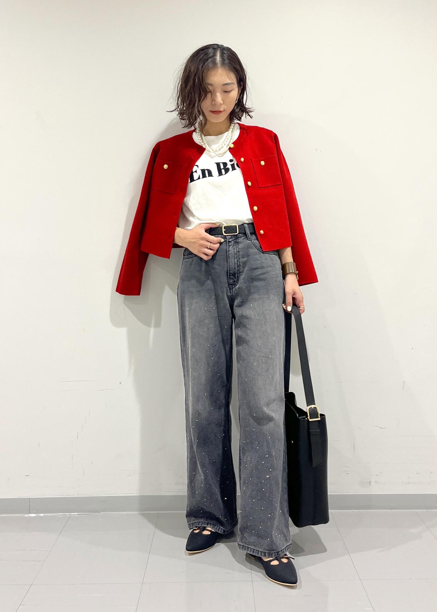 真っ赤なニットが主役ではありますが、キツくなりすぎないよう黒ではなくグレー系のボトムをチョイスしました。