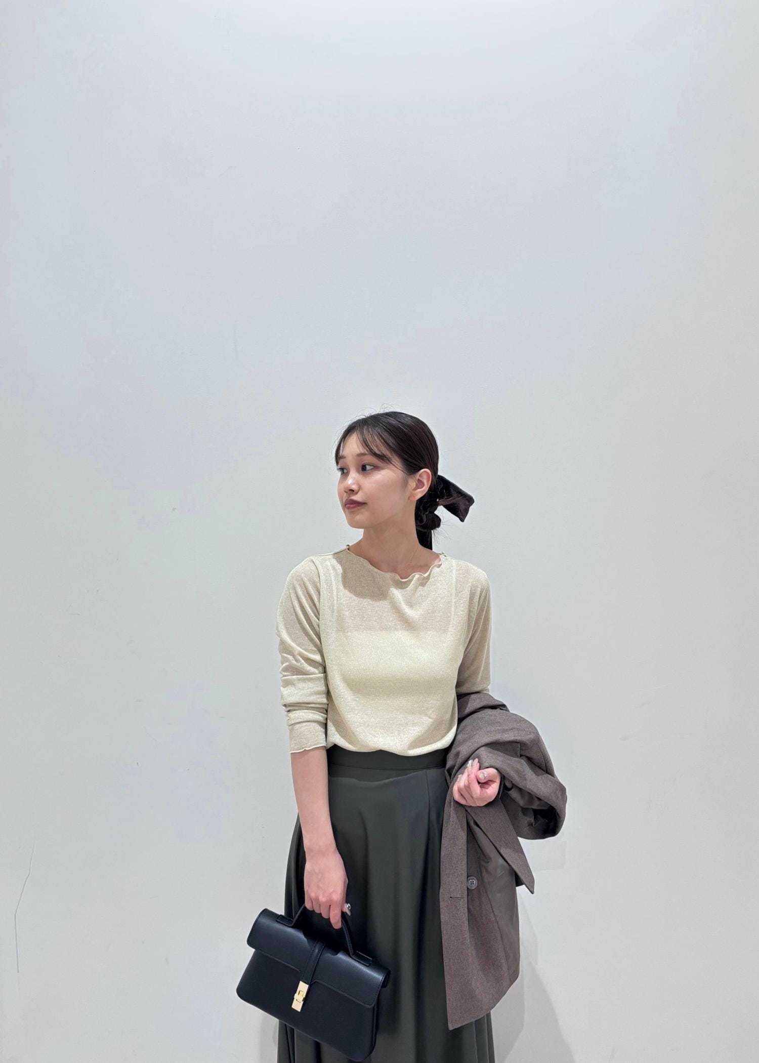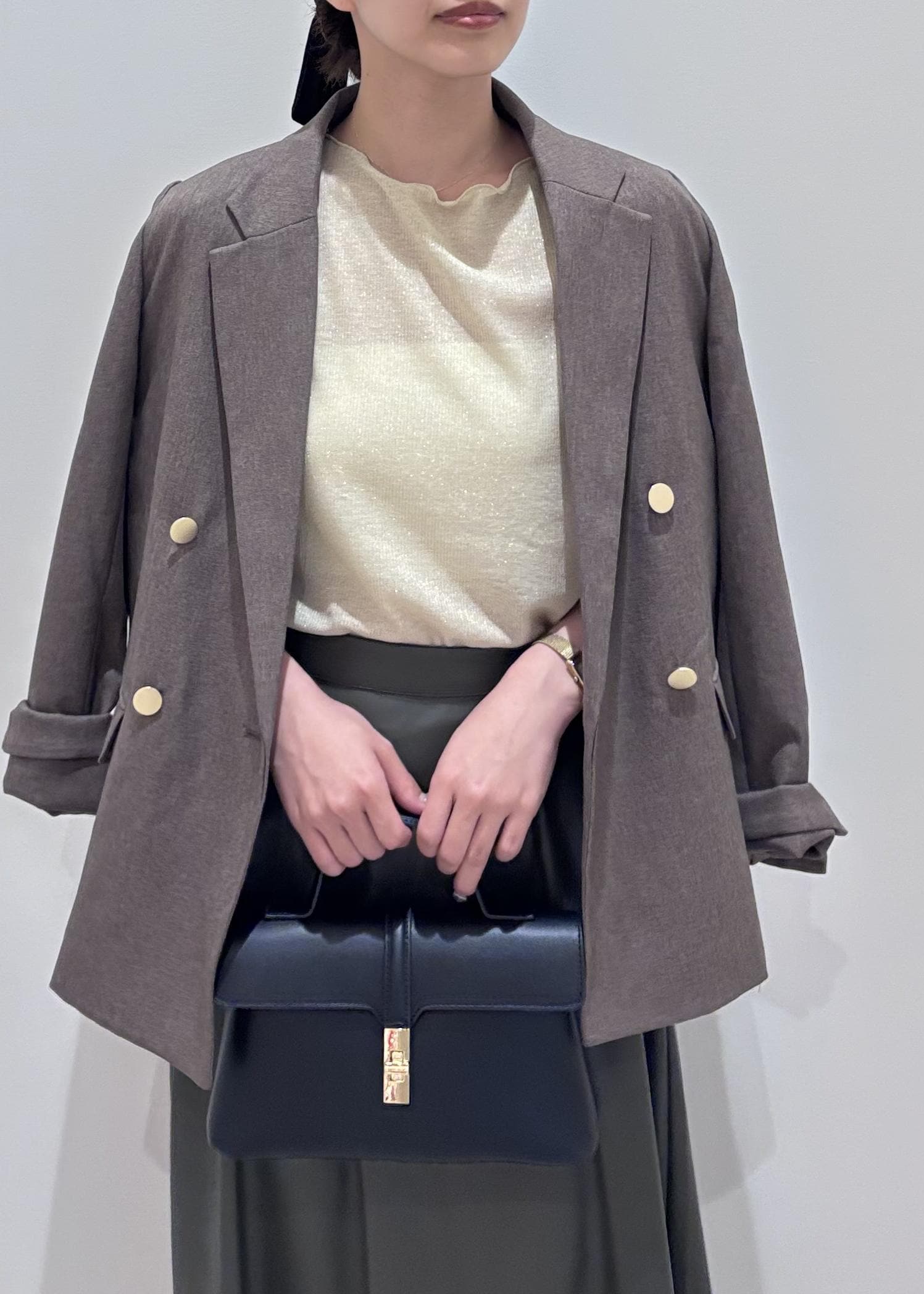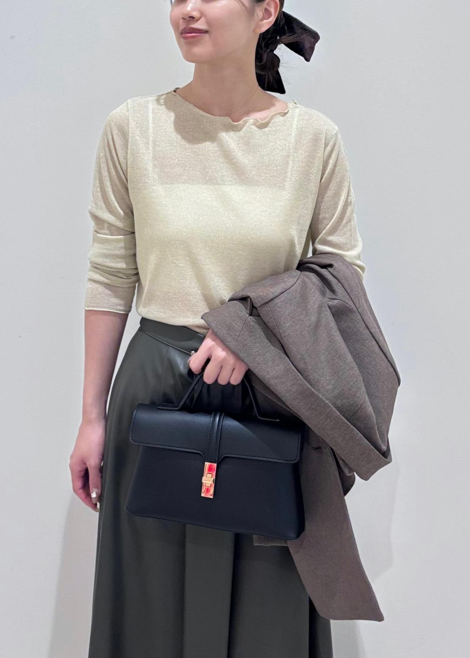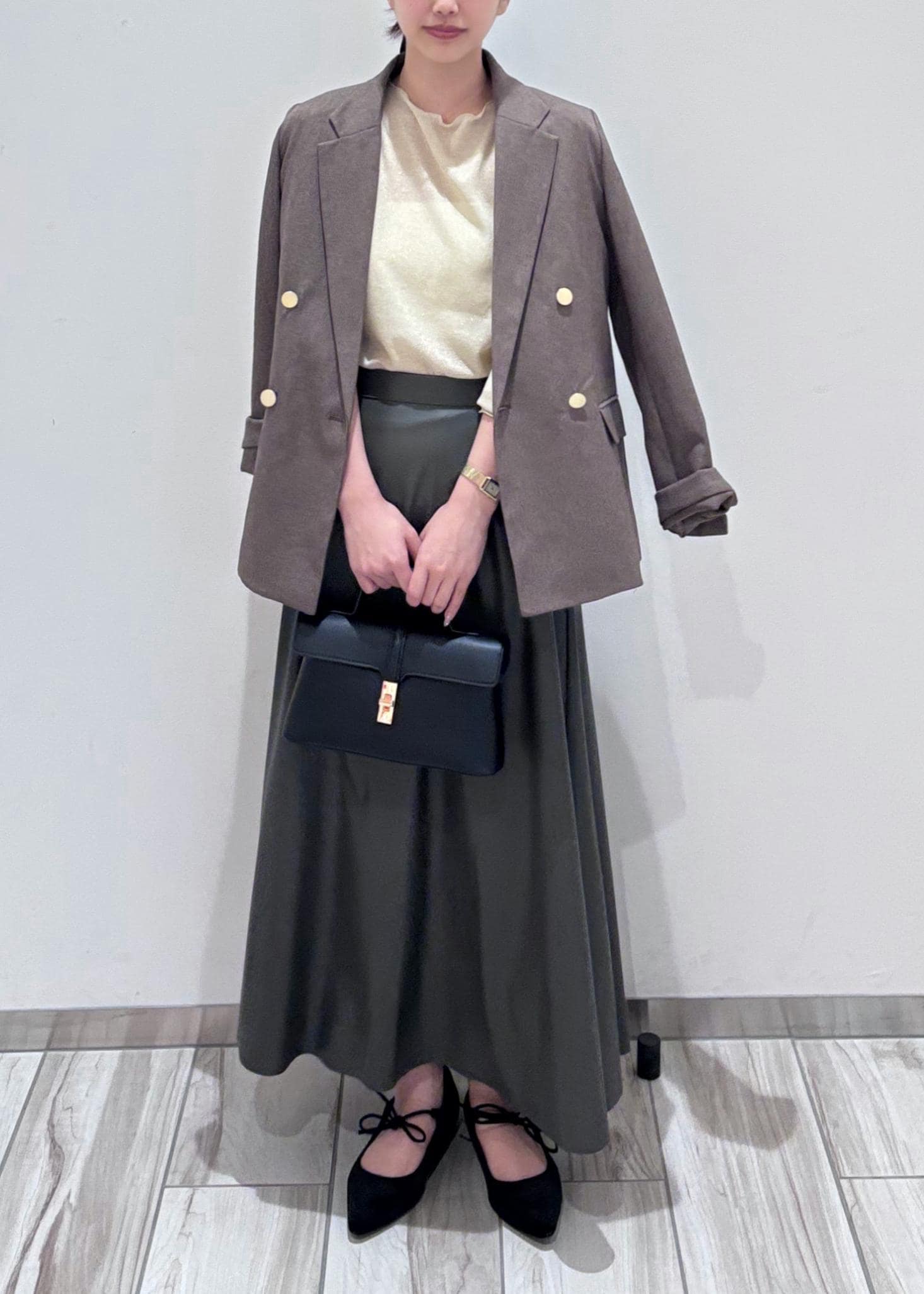 さりげないラメ感のあるシアートップスと、ジャケットは同じベージュ系にし、光沢感のあるレザースカートを合わせて品のある、大人な雰囲気を意識してみました。