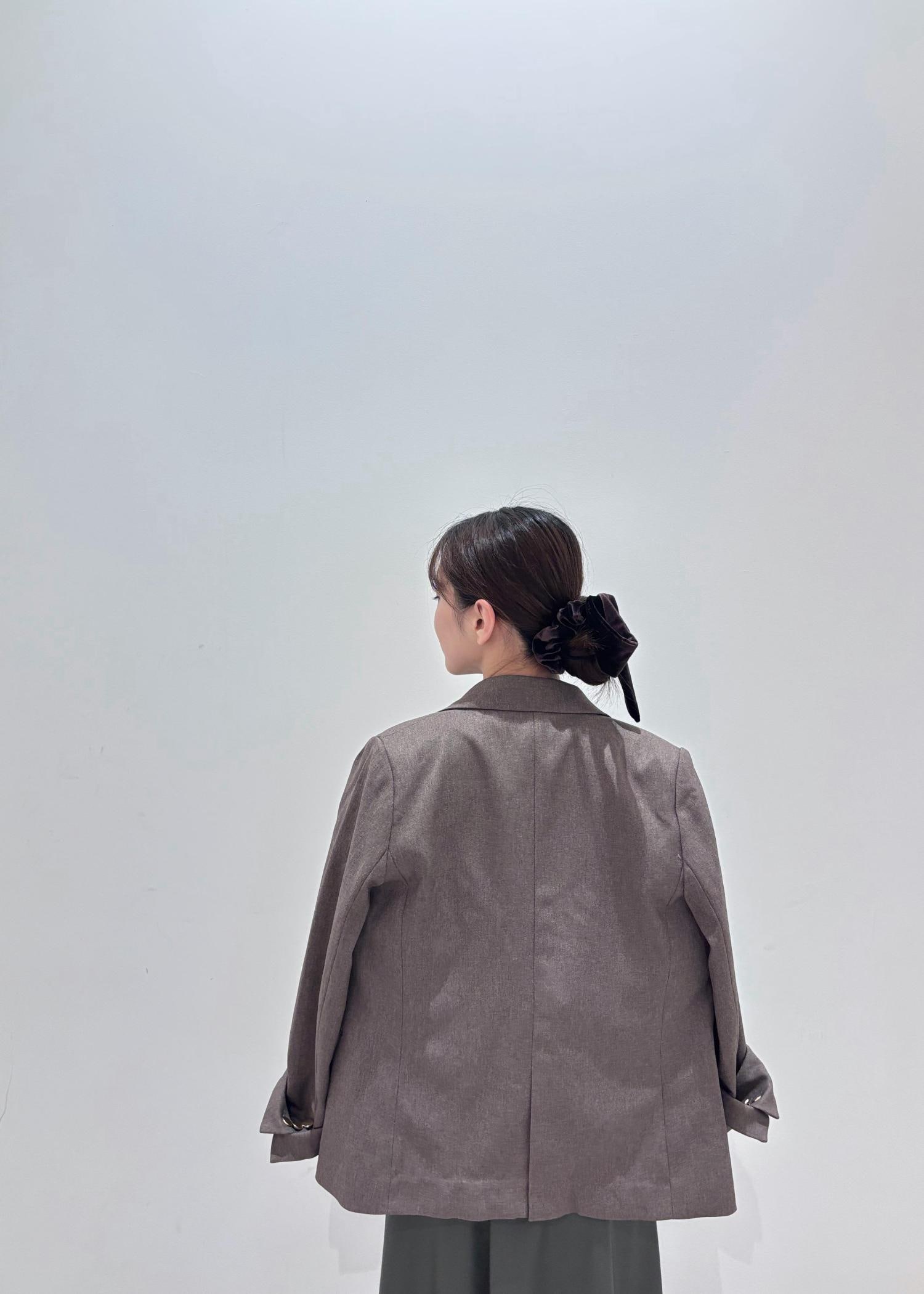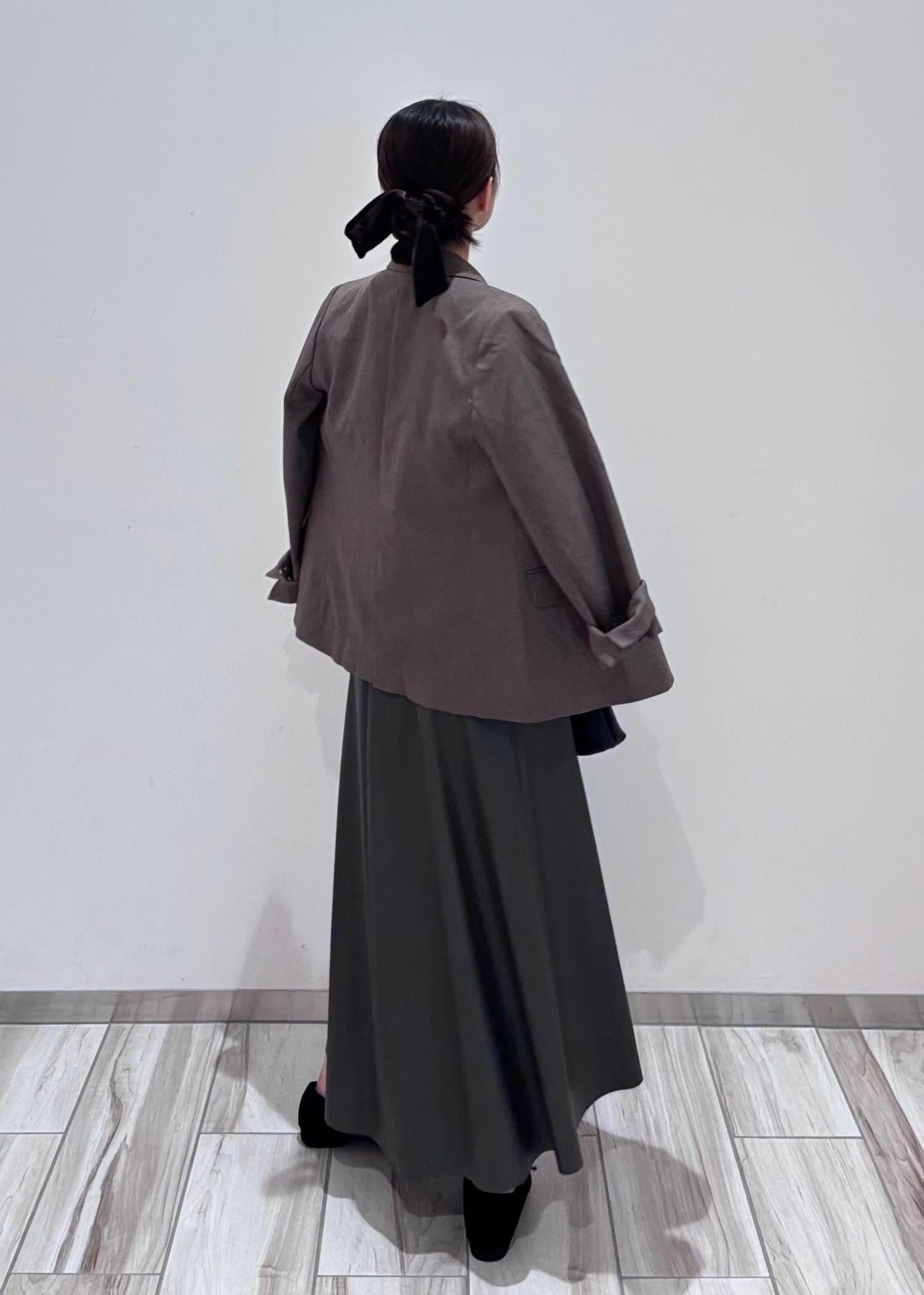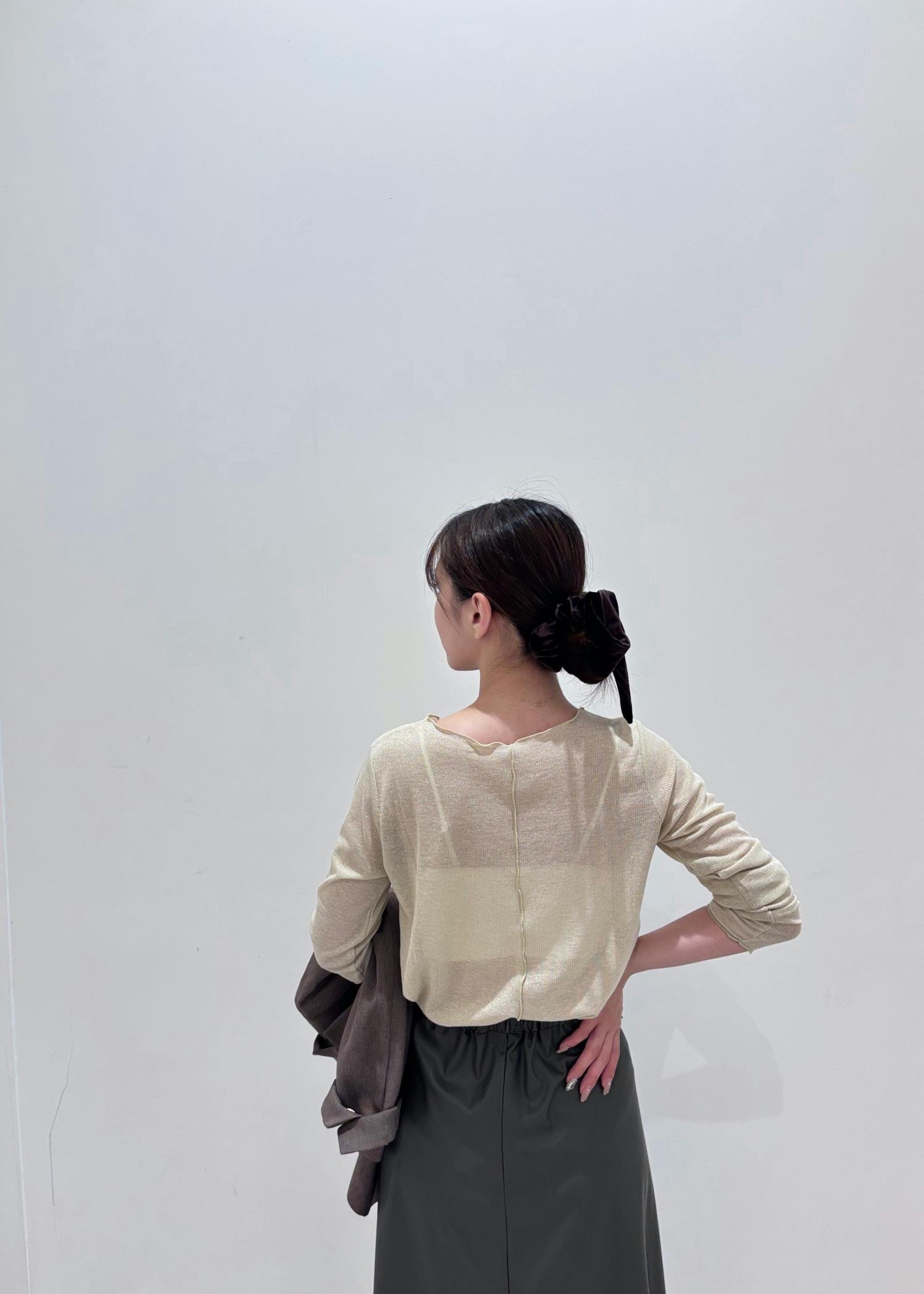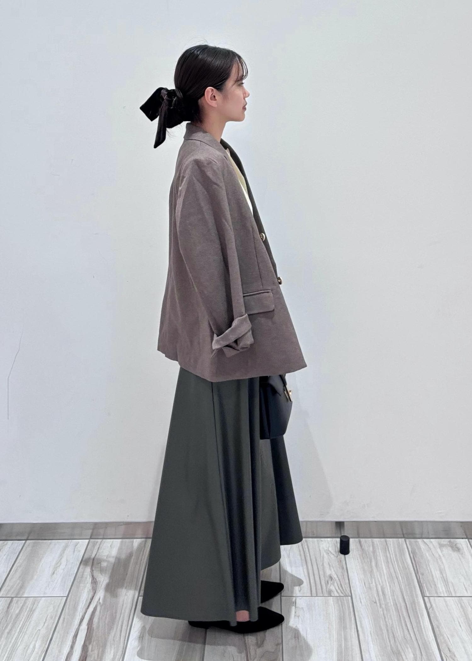さりげないラメ感のあるシアートップスと、ジャケットは同じベージュ系にし、光沢感のあるレザースカートを合わせて品のある、大人な雰囲気を意識してみました。