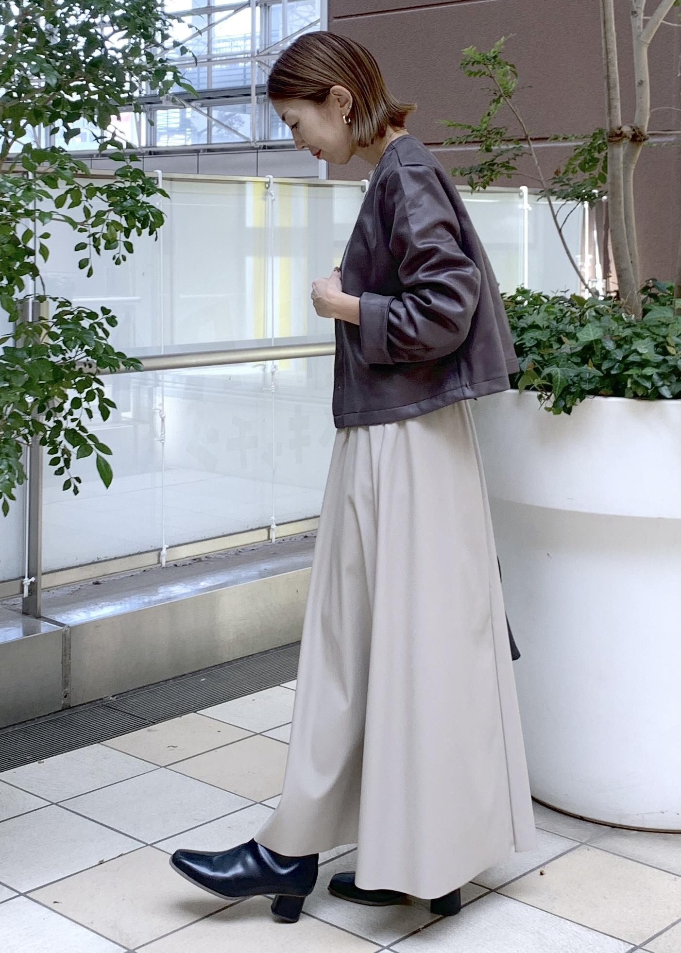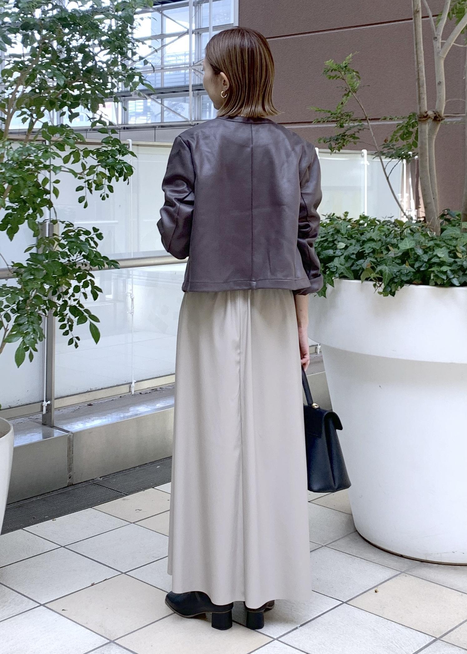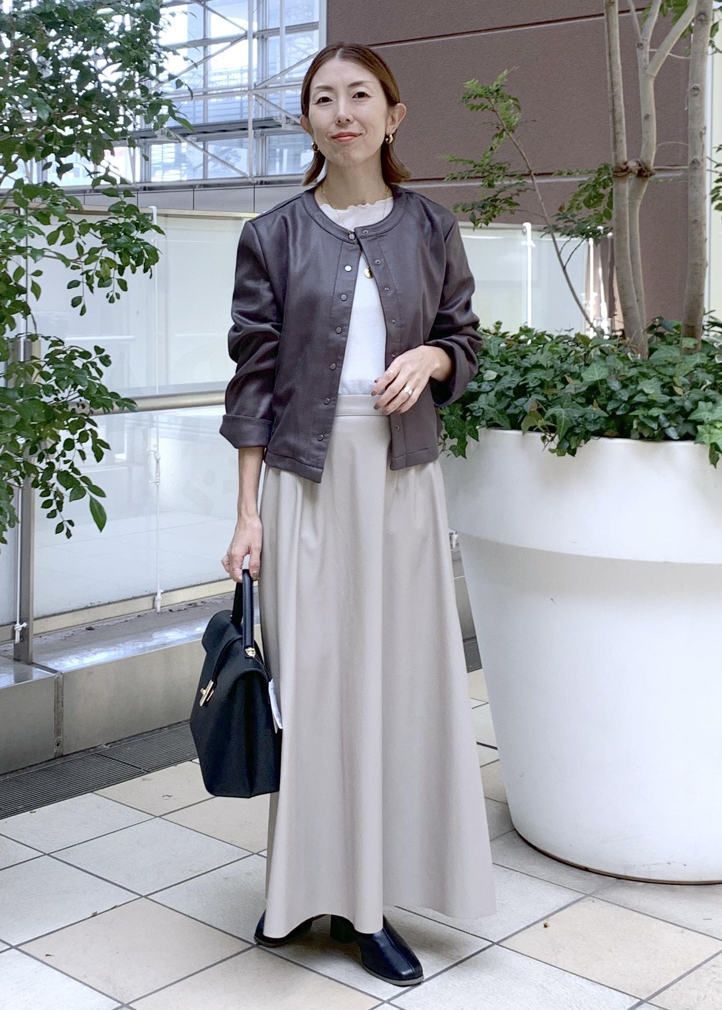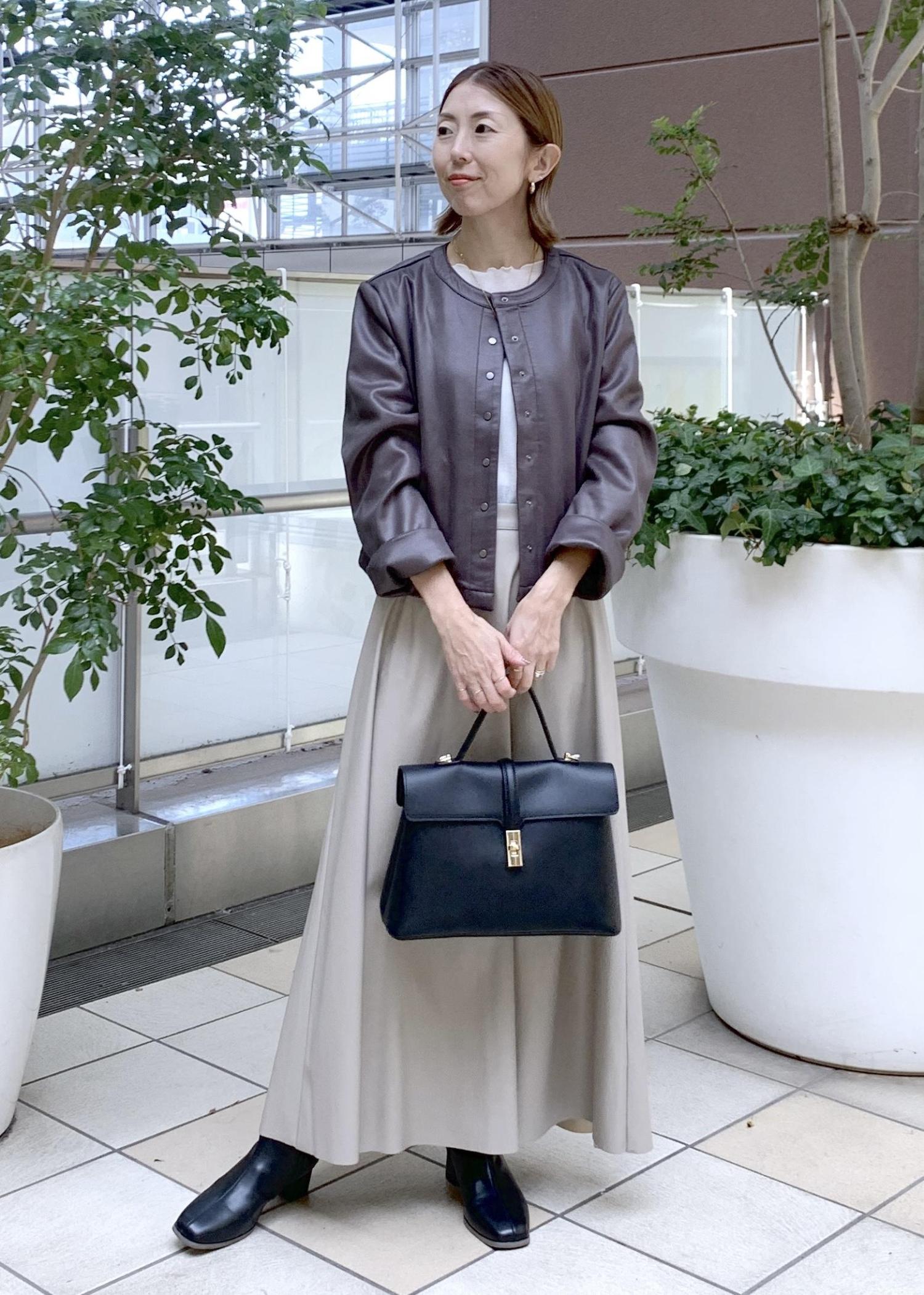 ボトムは、フェイクレザースカートを合わせて女性らしく◎