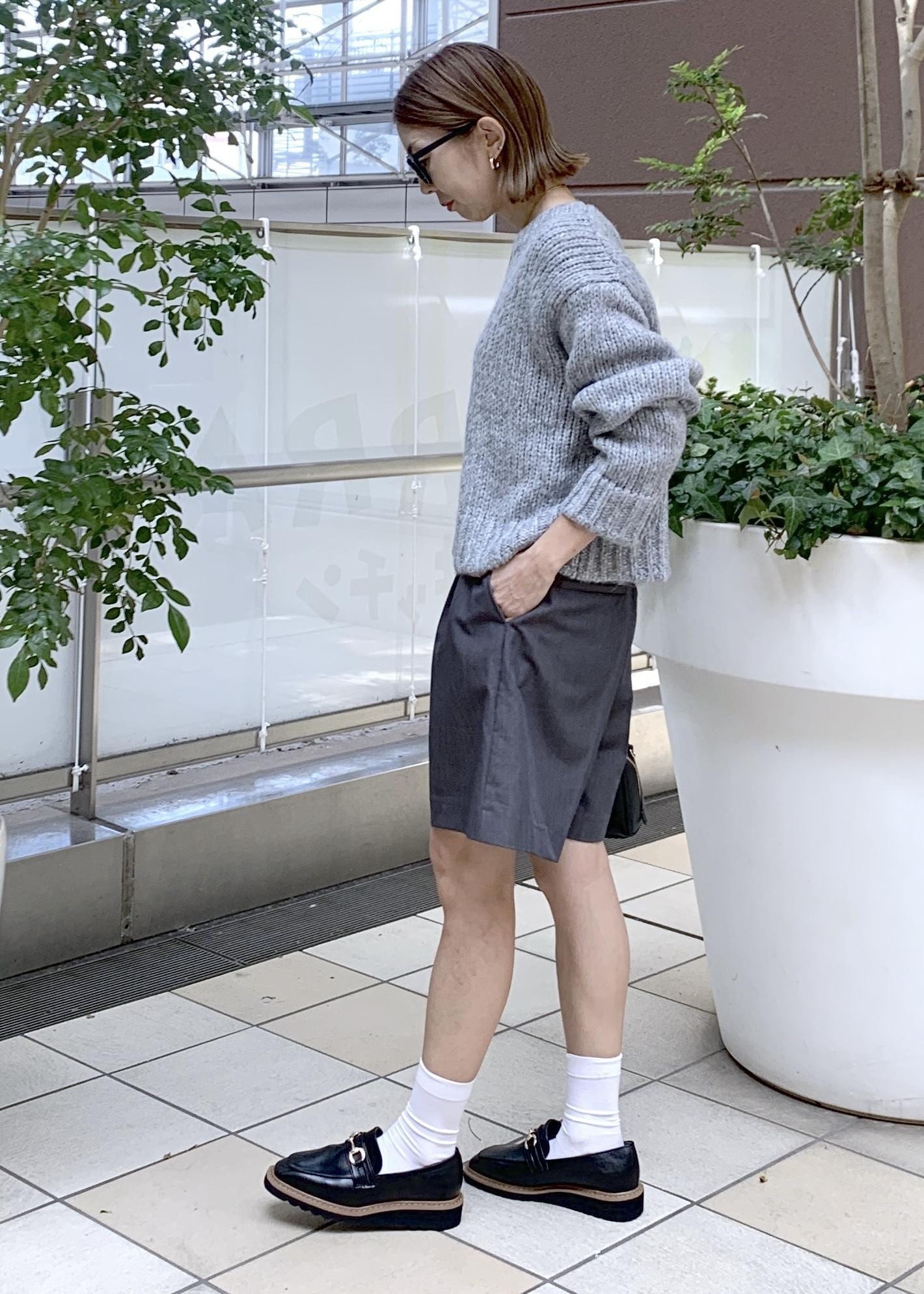 ボトムのハーフパンツもグレーを合わせて、大人も着やすいグレーのワントーンスタイリングに…
