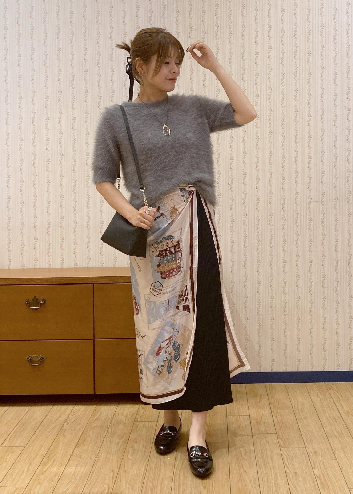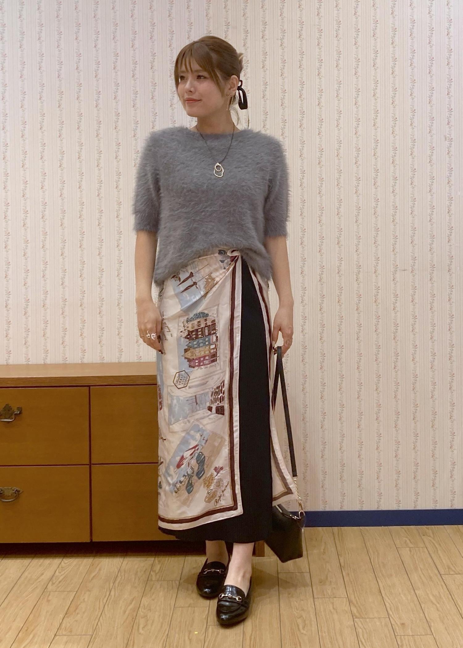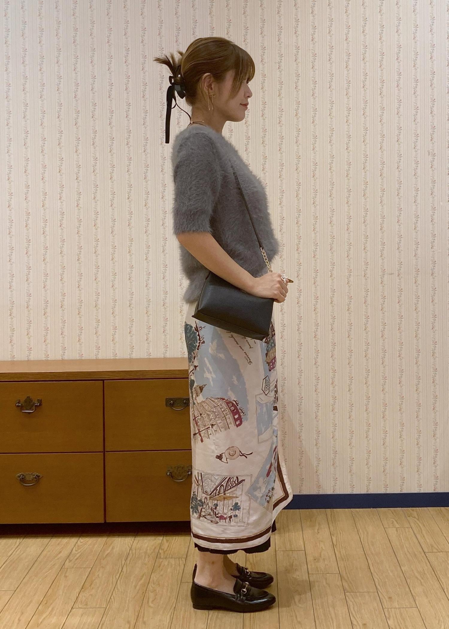 ふわふわのシャギーニットにタイトスカートを合わせたシンプルなコーディネート。