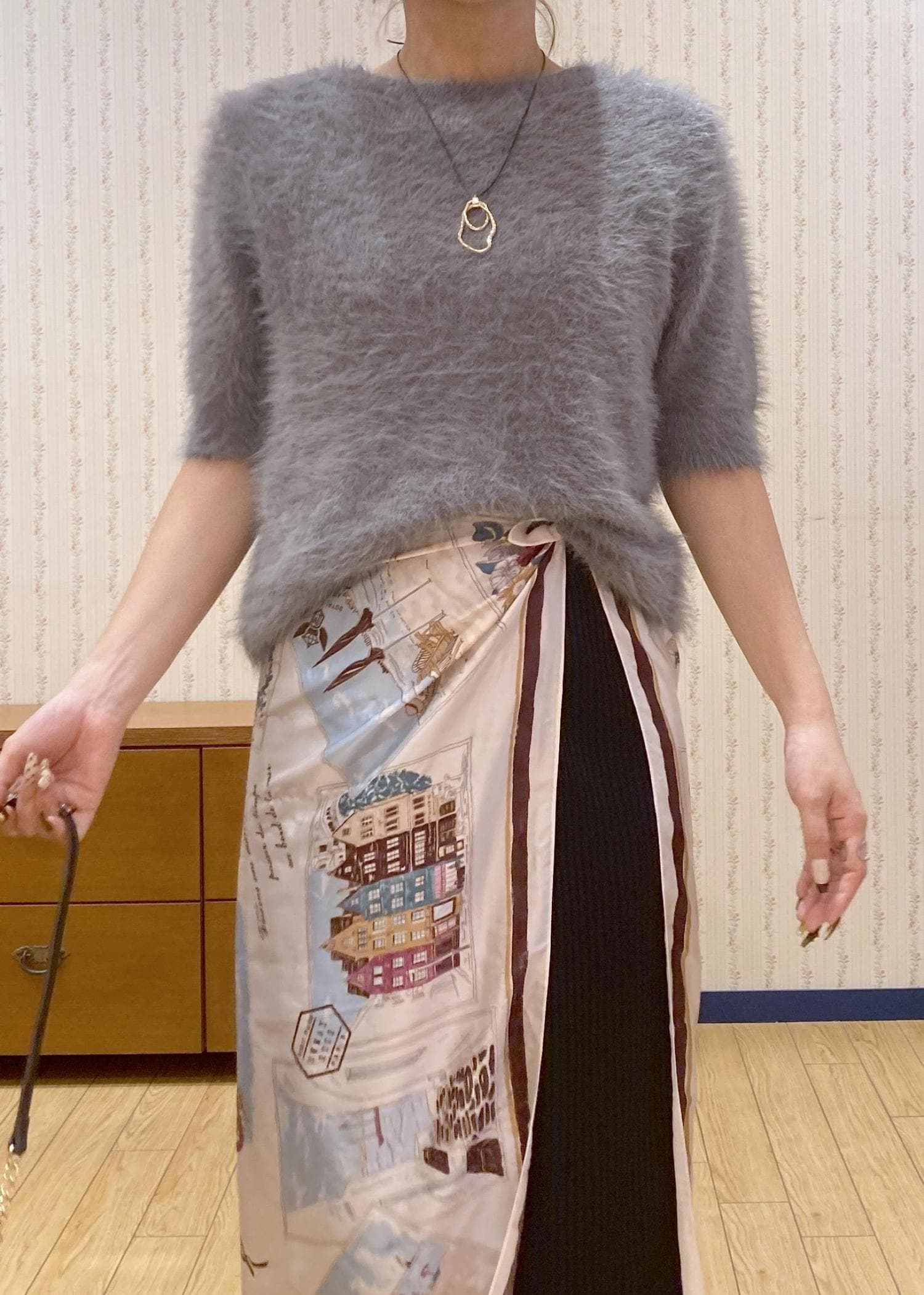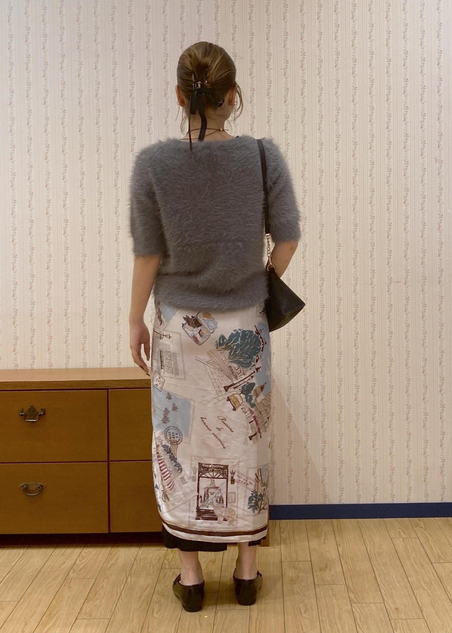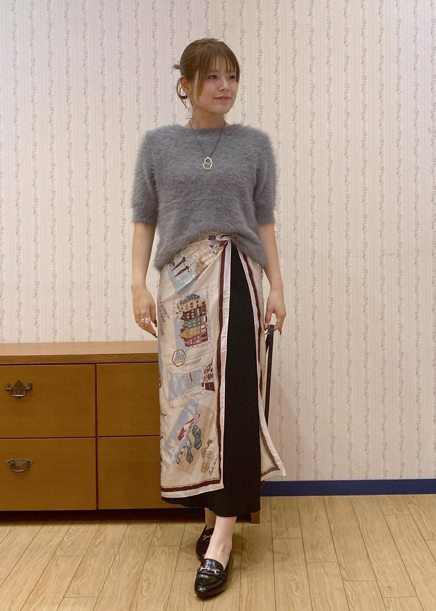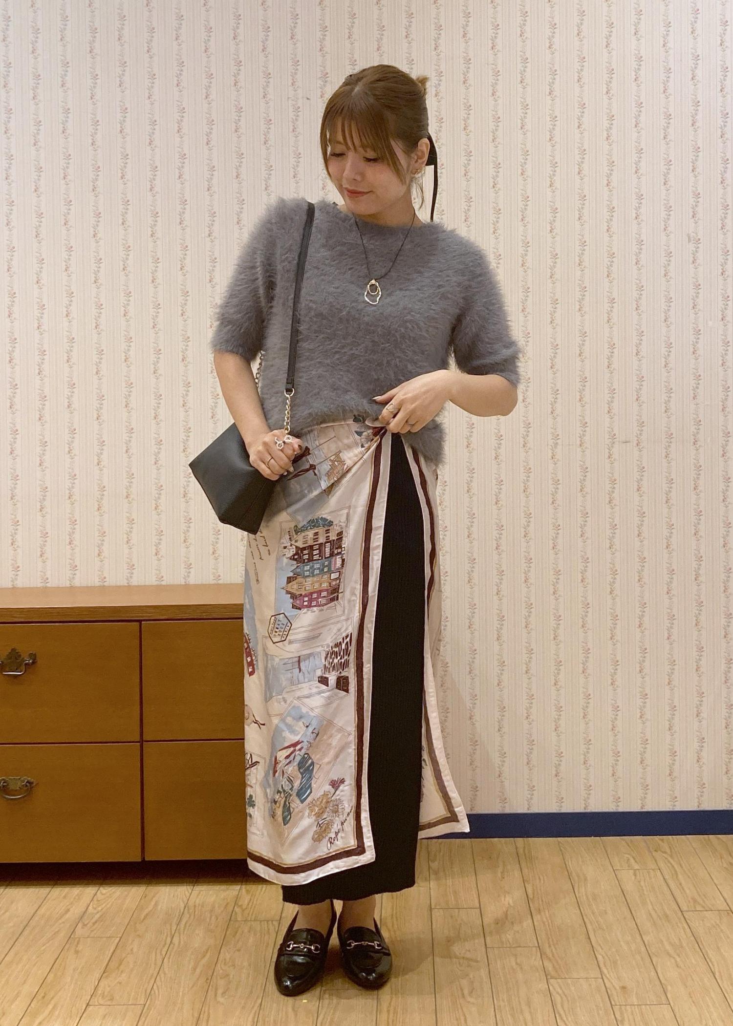 ふわふわのシャギーニットにタイトスカートを合わせたシンプルなコーディネート。