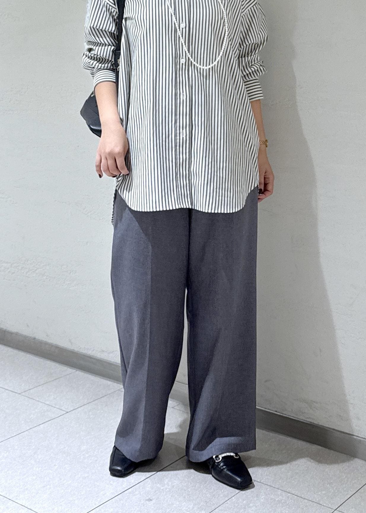 今まで丈がジャストより少し短く感じていたので、余計に下半身が太く見えてしまうのが悩みでしたが、ズルっと着れる丈感で脚が長く見せれます。