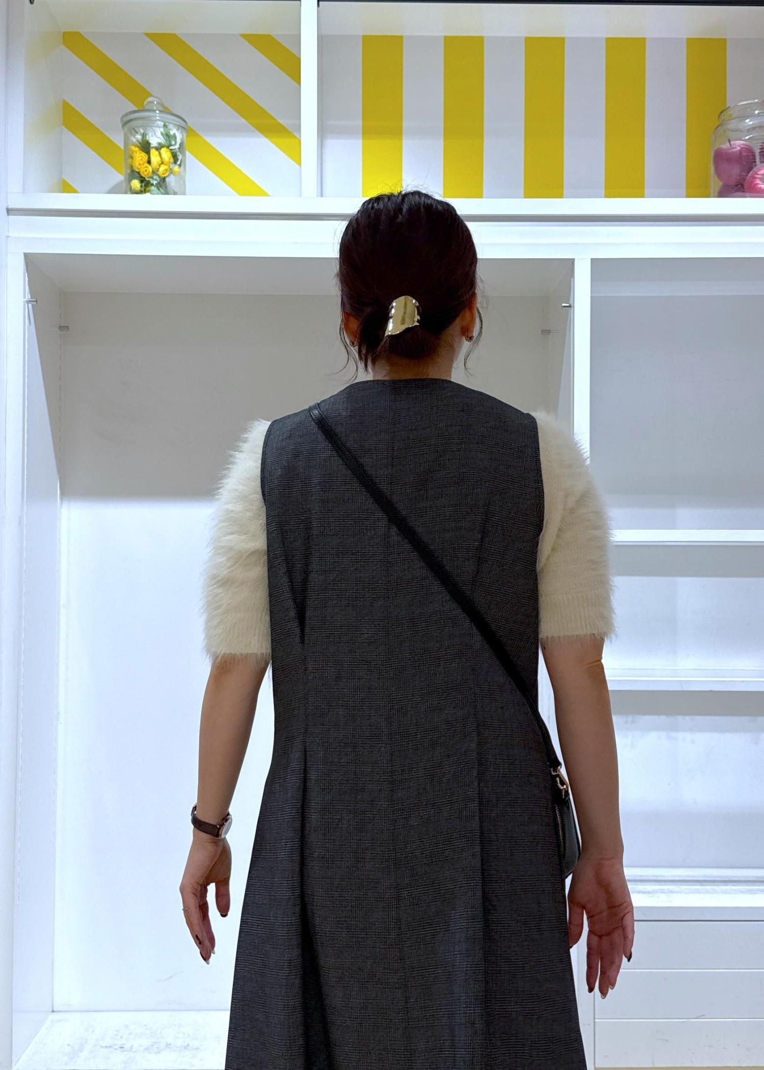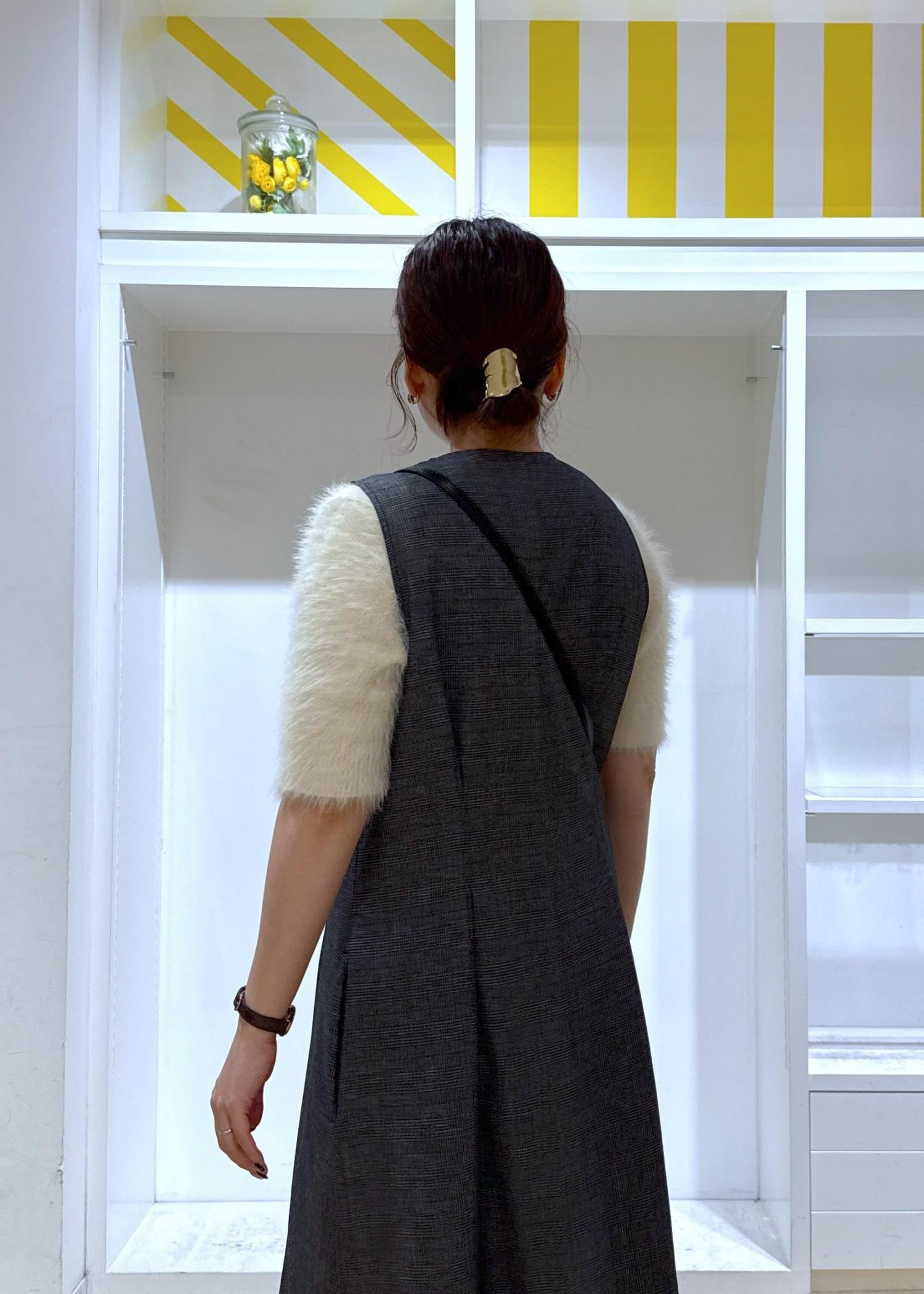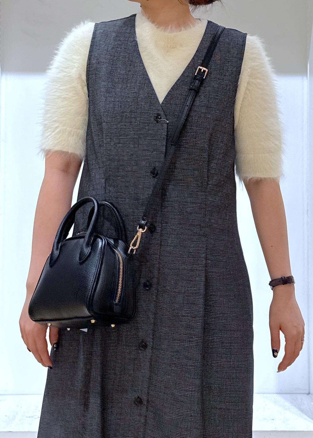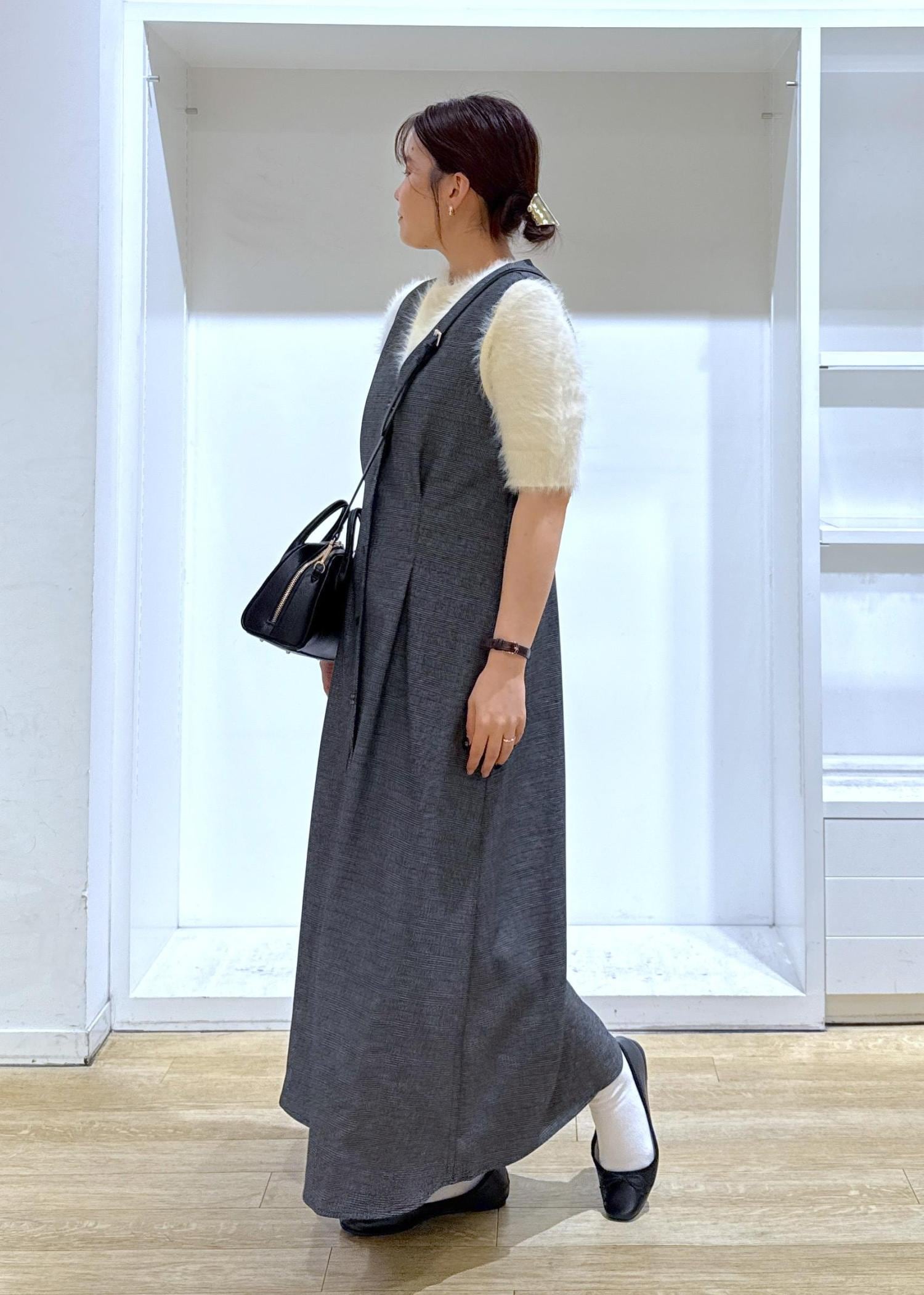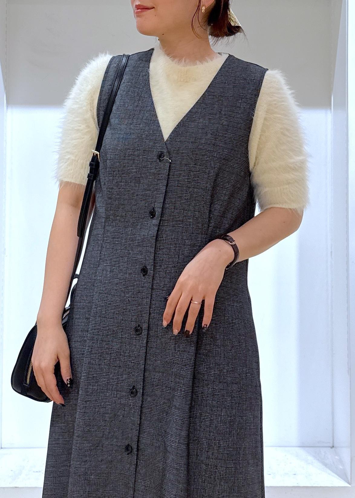 秋らしいグレンチェック柄のジャンパースカートにトレンド感のあるシャギーニットを合わせた秋のお出かけコーデにしてみました!