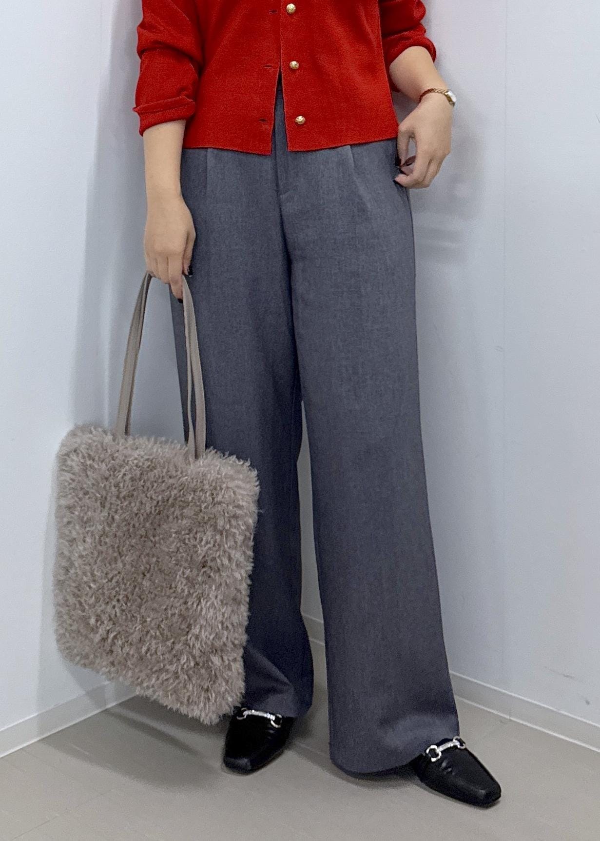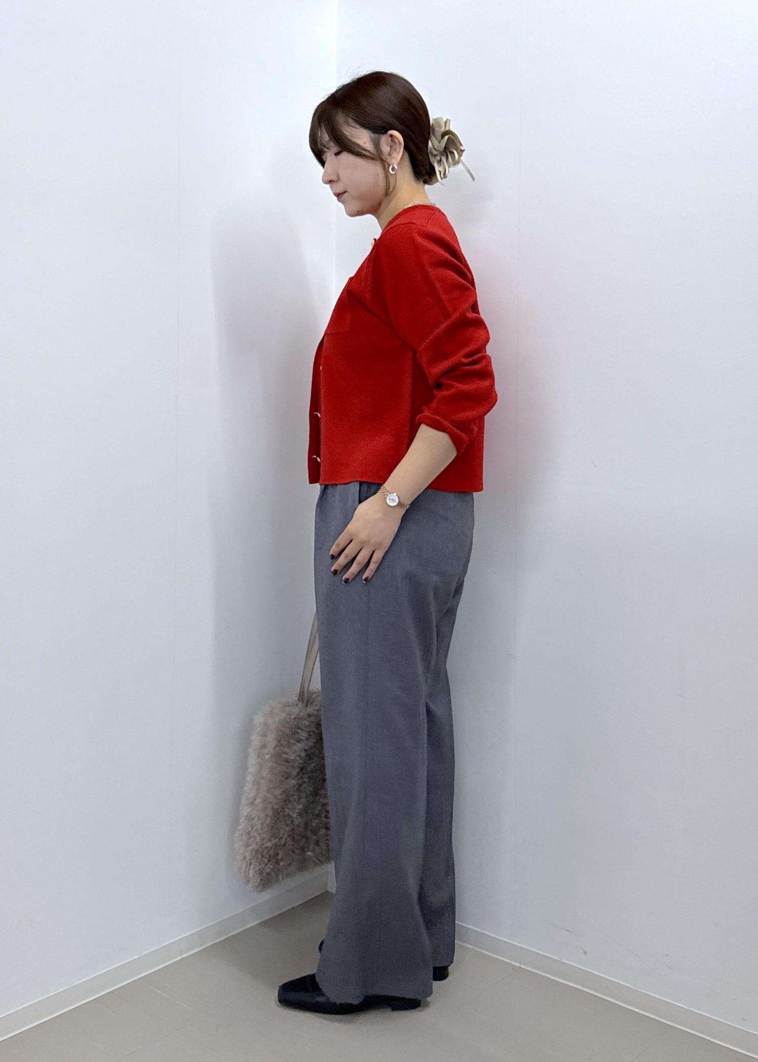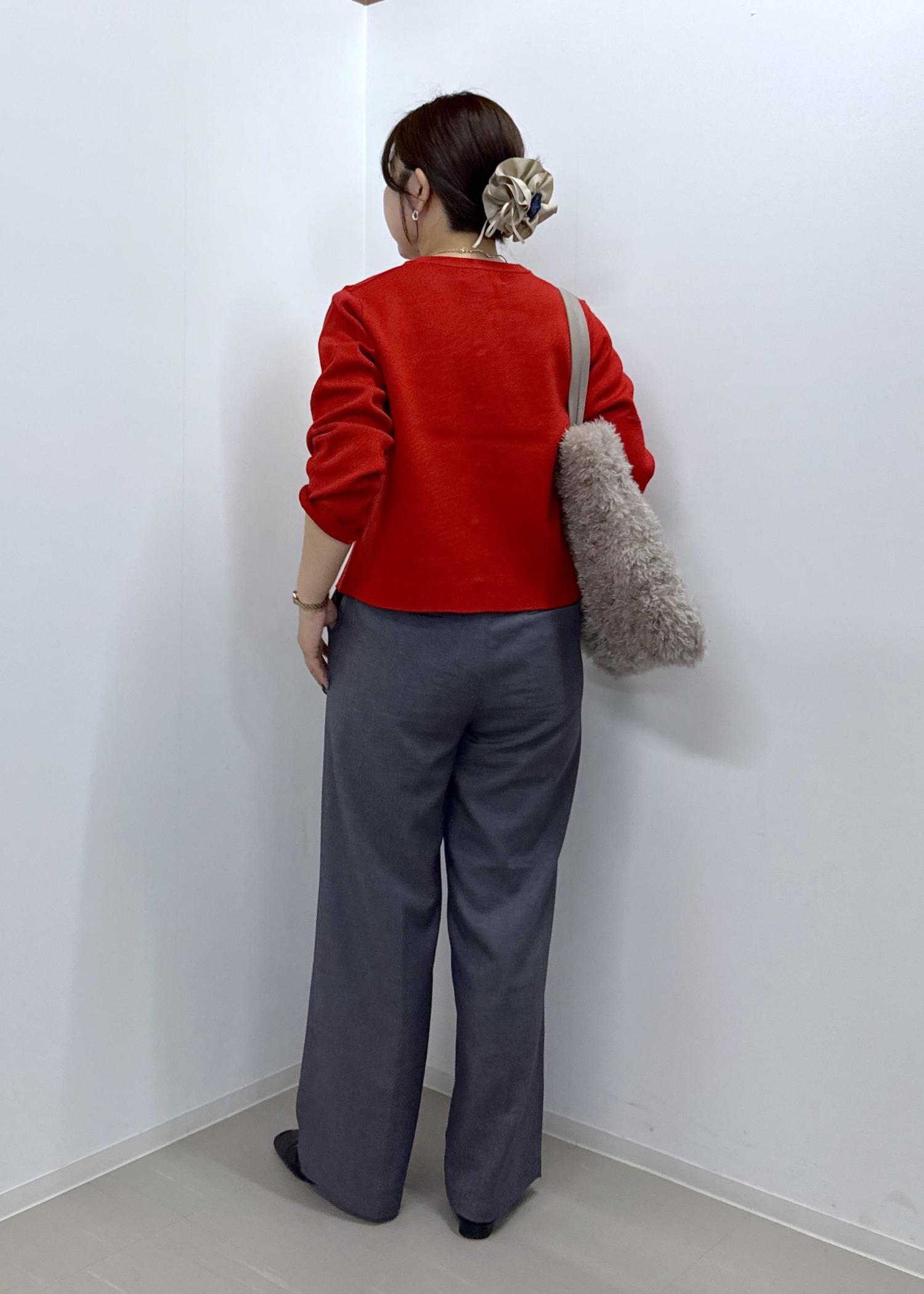 今まで丈がジャストより少し短く感じていたので、余計に下半身が太く見えてしまうのが悩みでしたが、ズルっと着れる丈感で脚が長く見せれます。