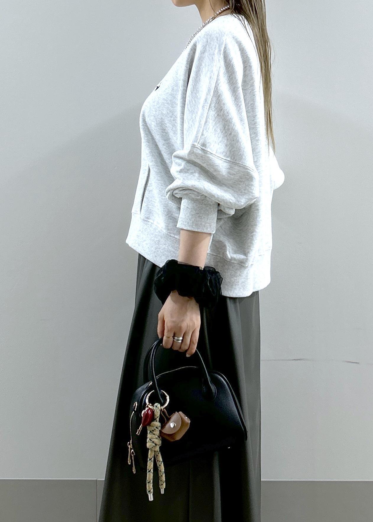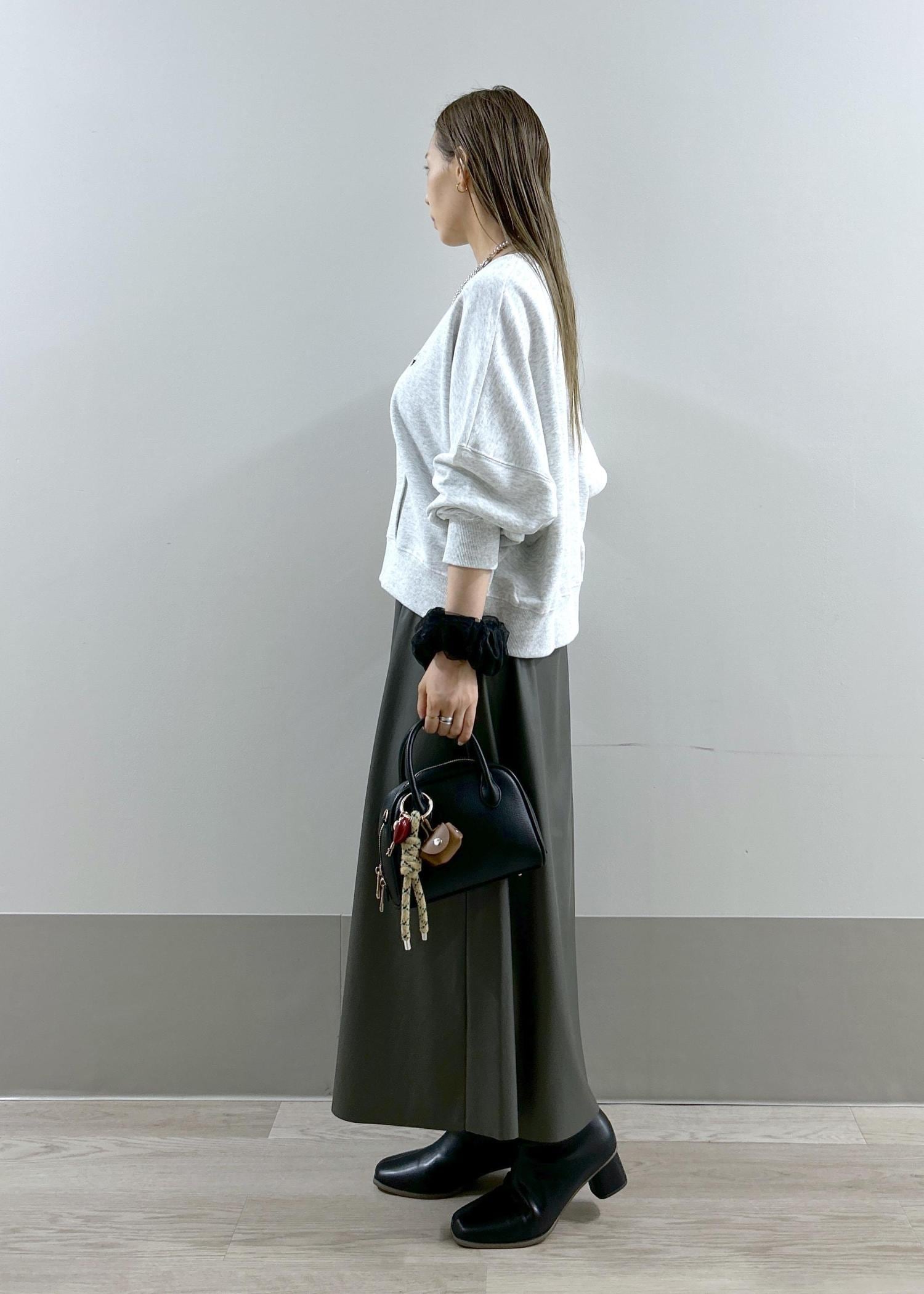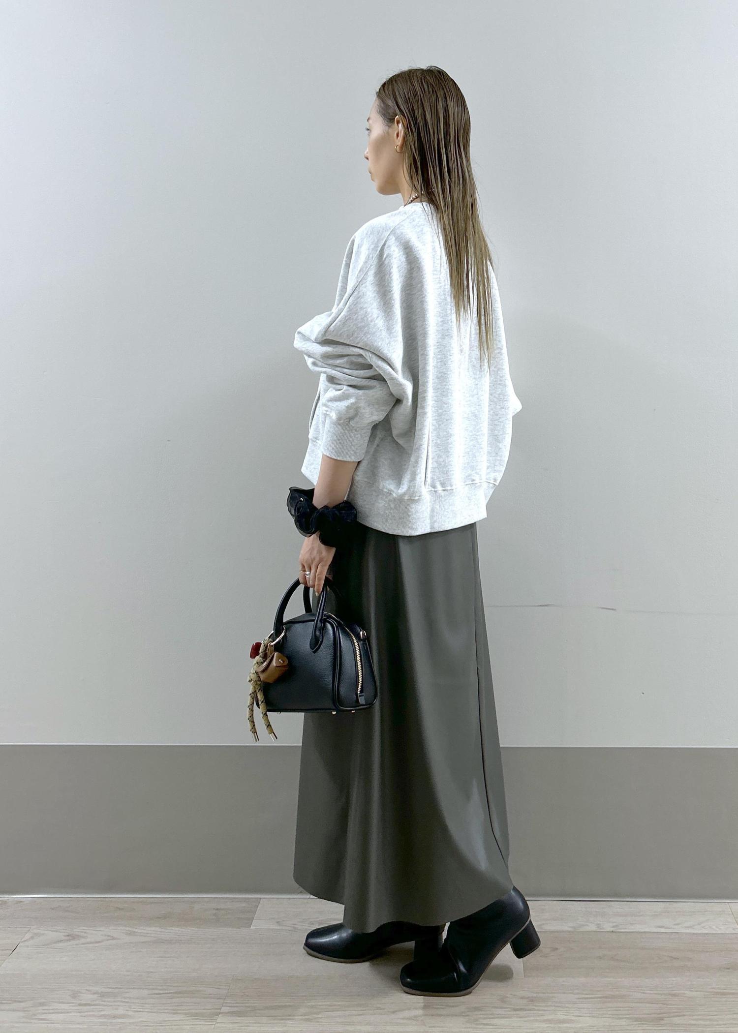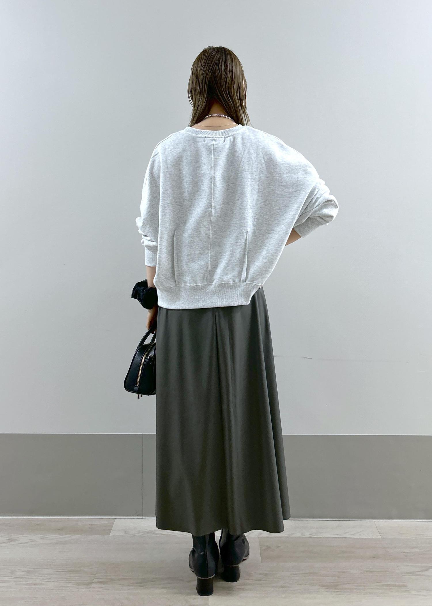 1枚で上品見えするスカートを、あえてカジュアルなスウェットと合わせたスタイリングです。
