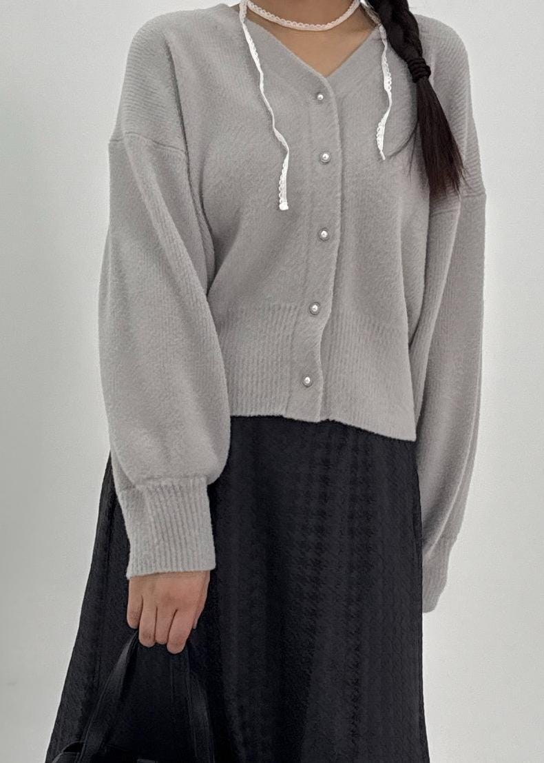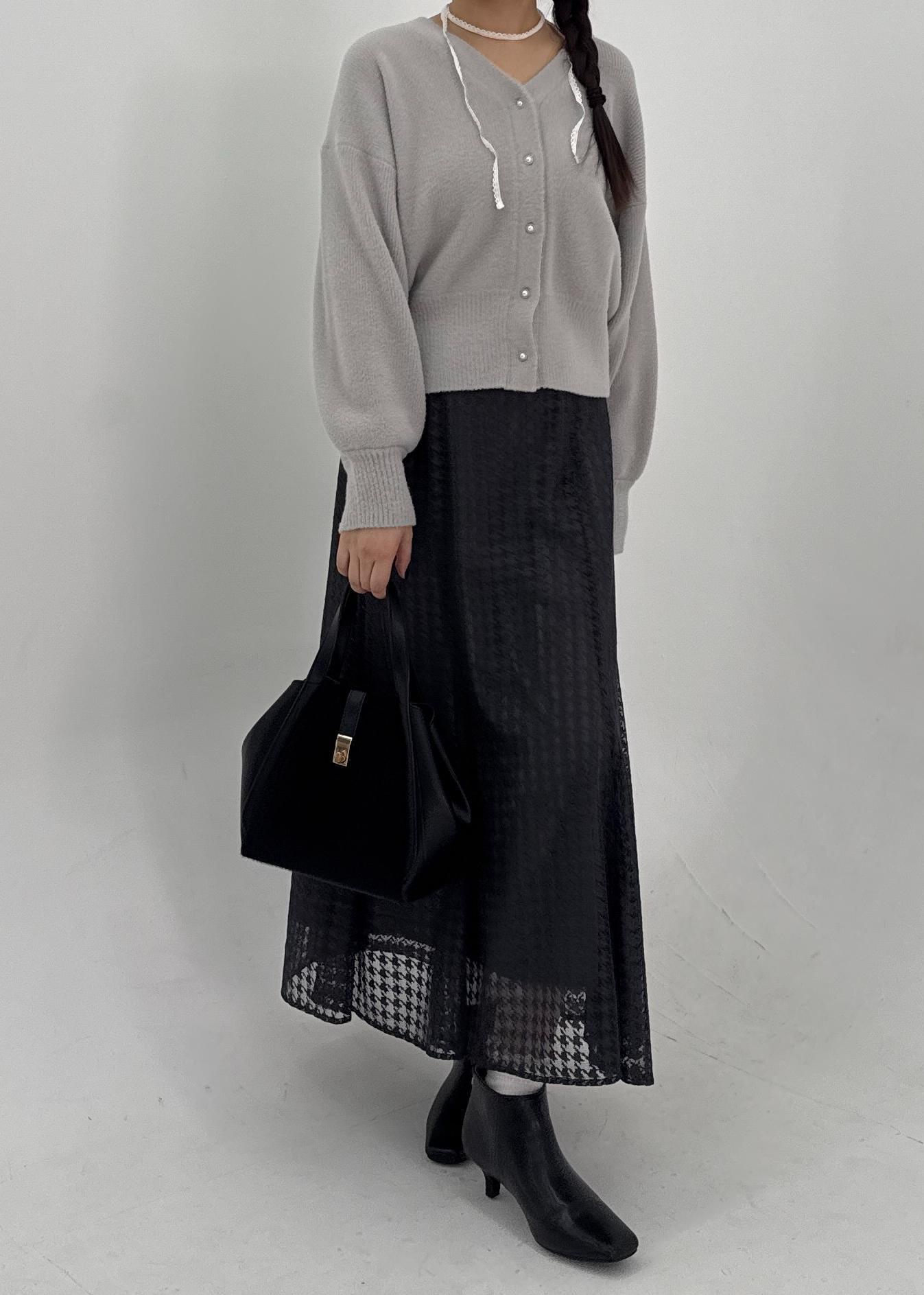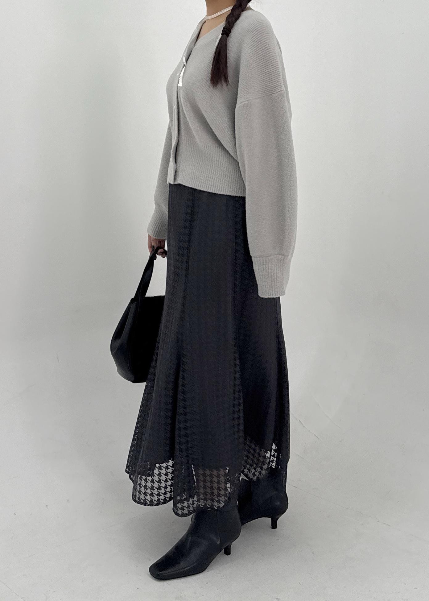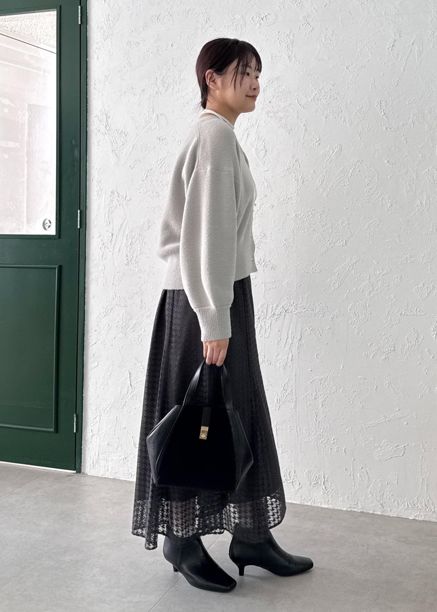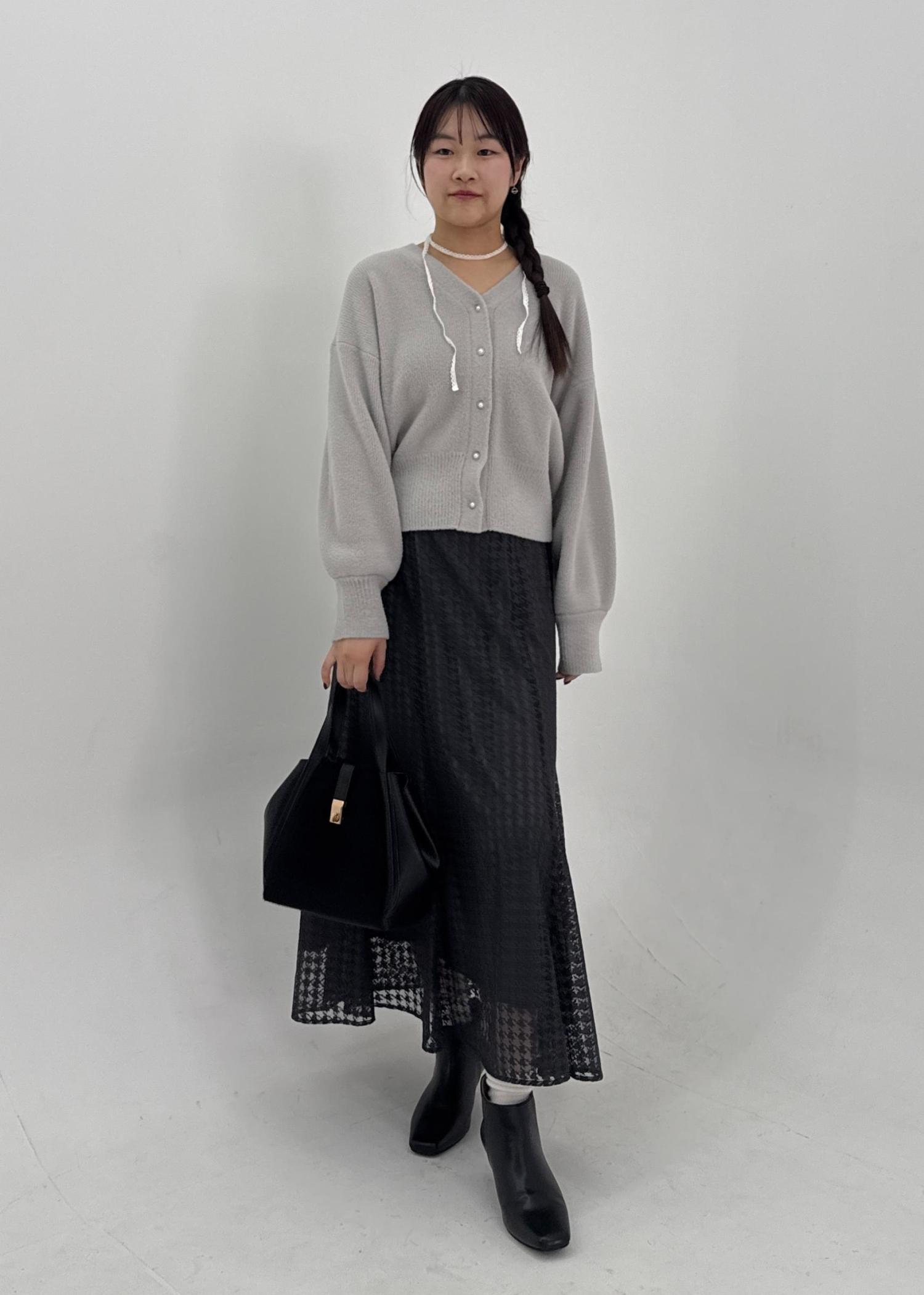 グレーのニットカーディガンとマーメイドシルエットのスカートを合わせた、きれいめコーデです。