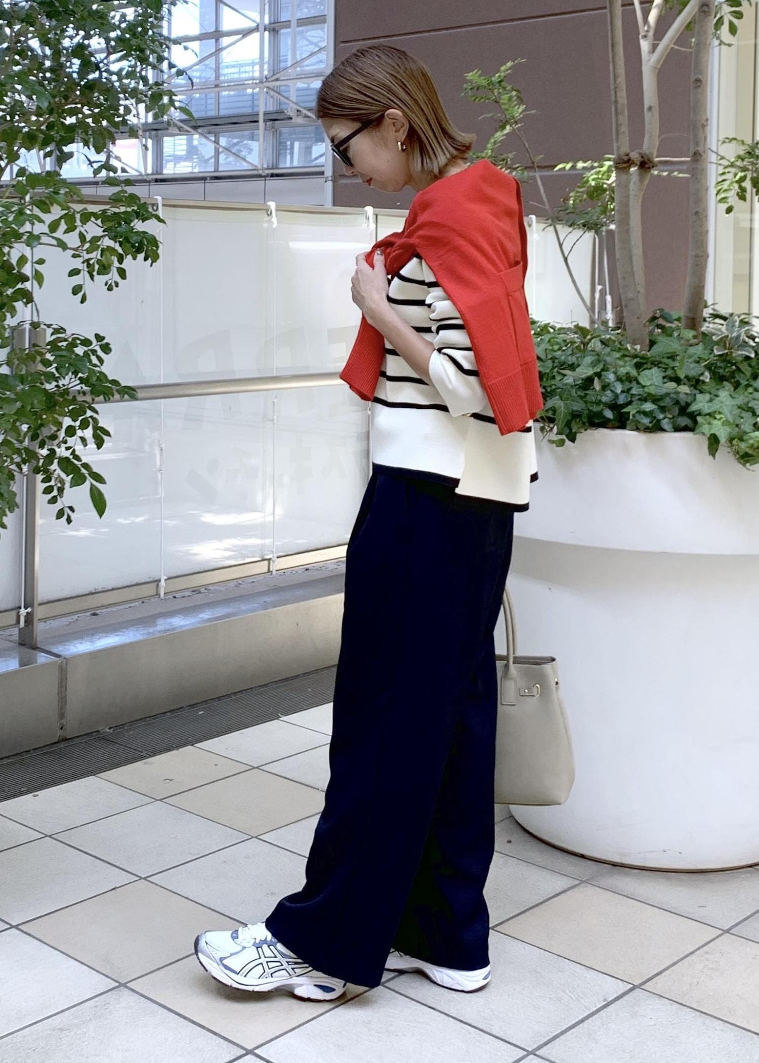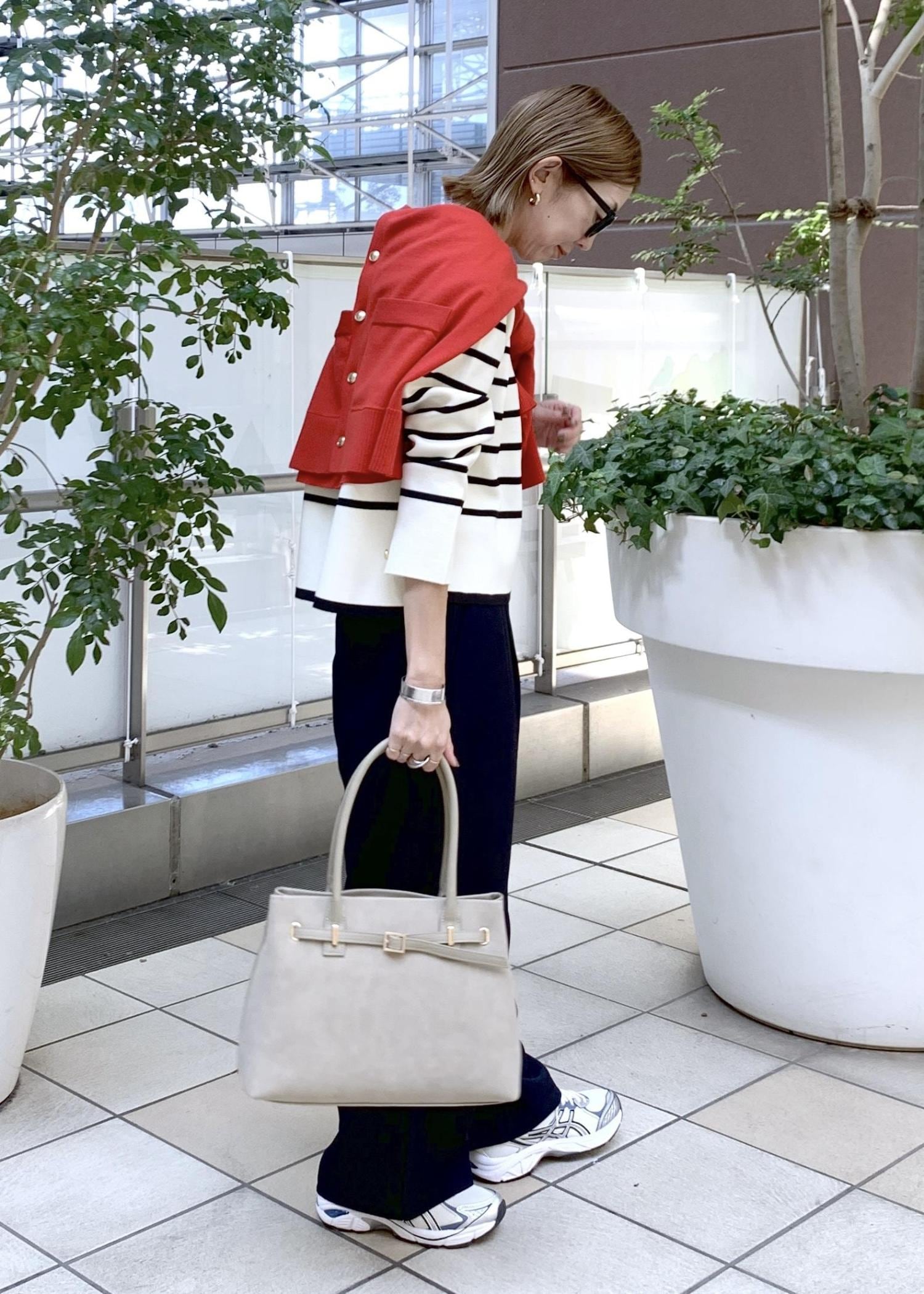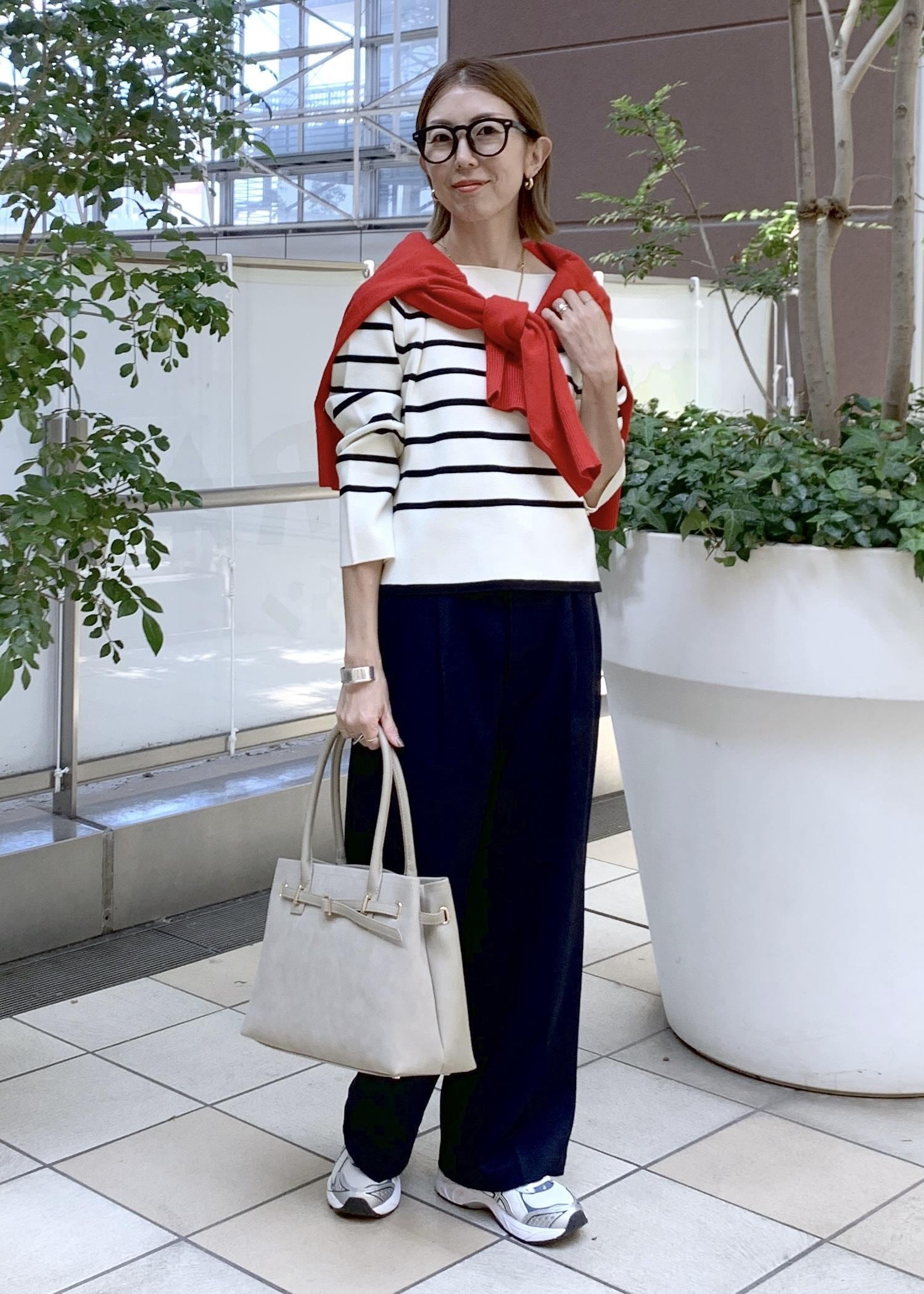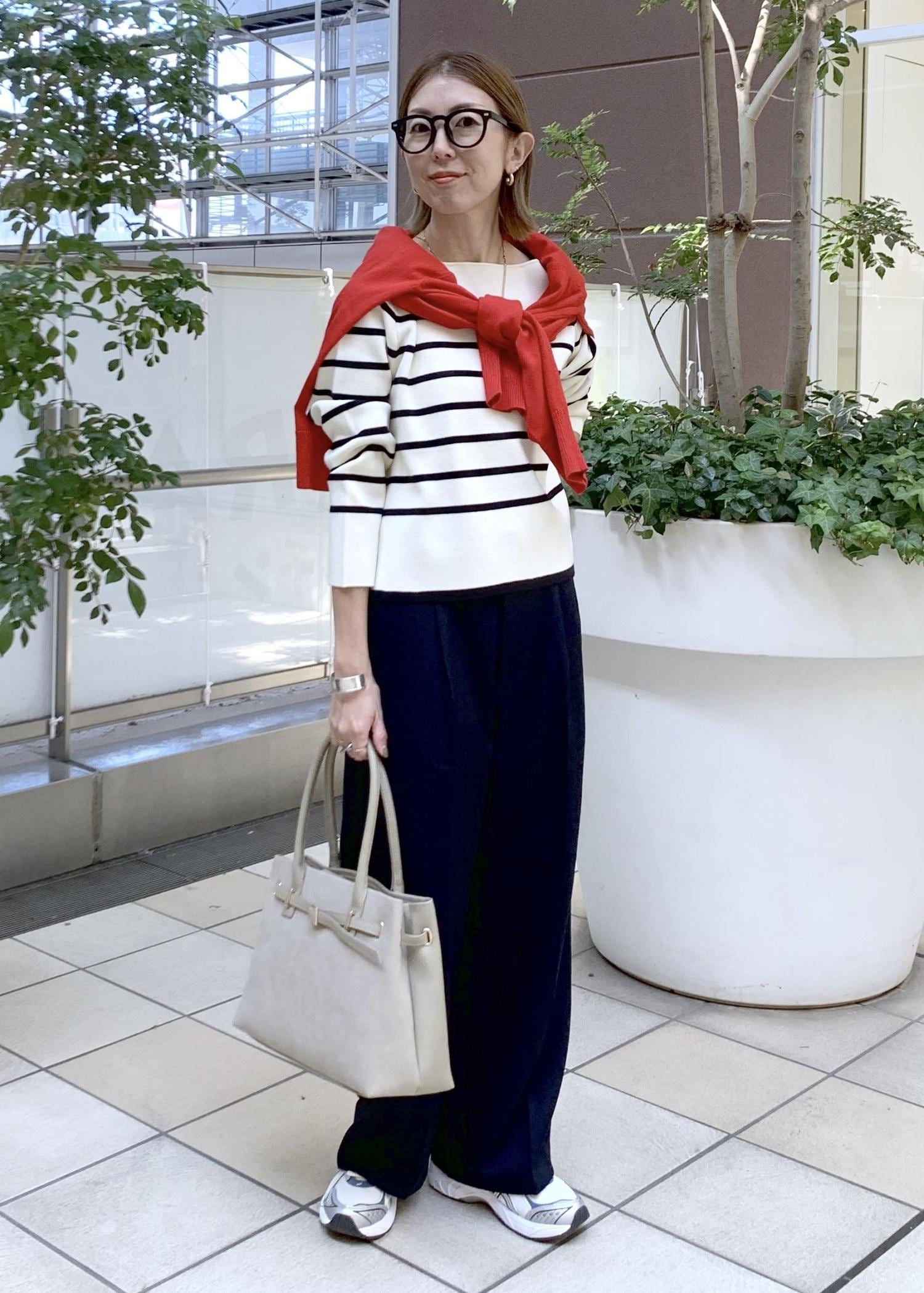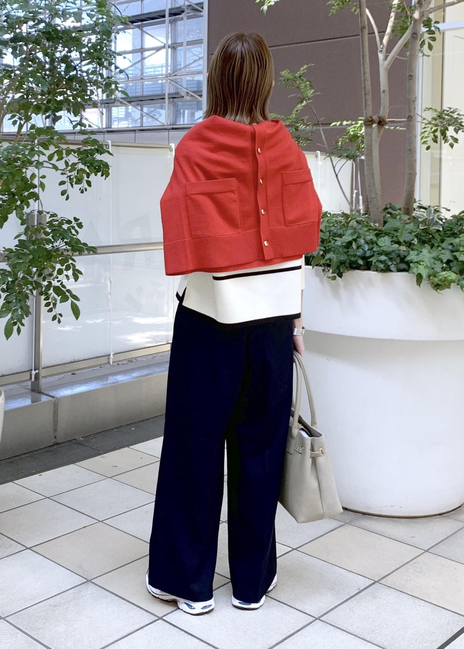 差し色に肩掛けした赤のカーディガンがポイントです。