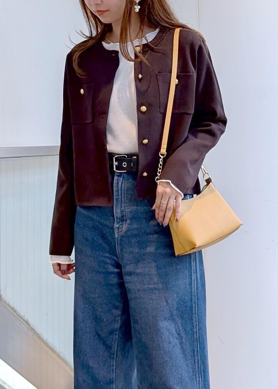 ロペピクニック定番のミラノリブカーディガンを使った秋カラースタイル。今季はサイズによって丈感が変わる仕様です。全体的なゆとりも変わるため、今回はスッキリと着用できるMサイズを着用しました。インナーには着回し力抜群のラメシアートップスを合わせました。