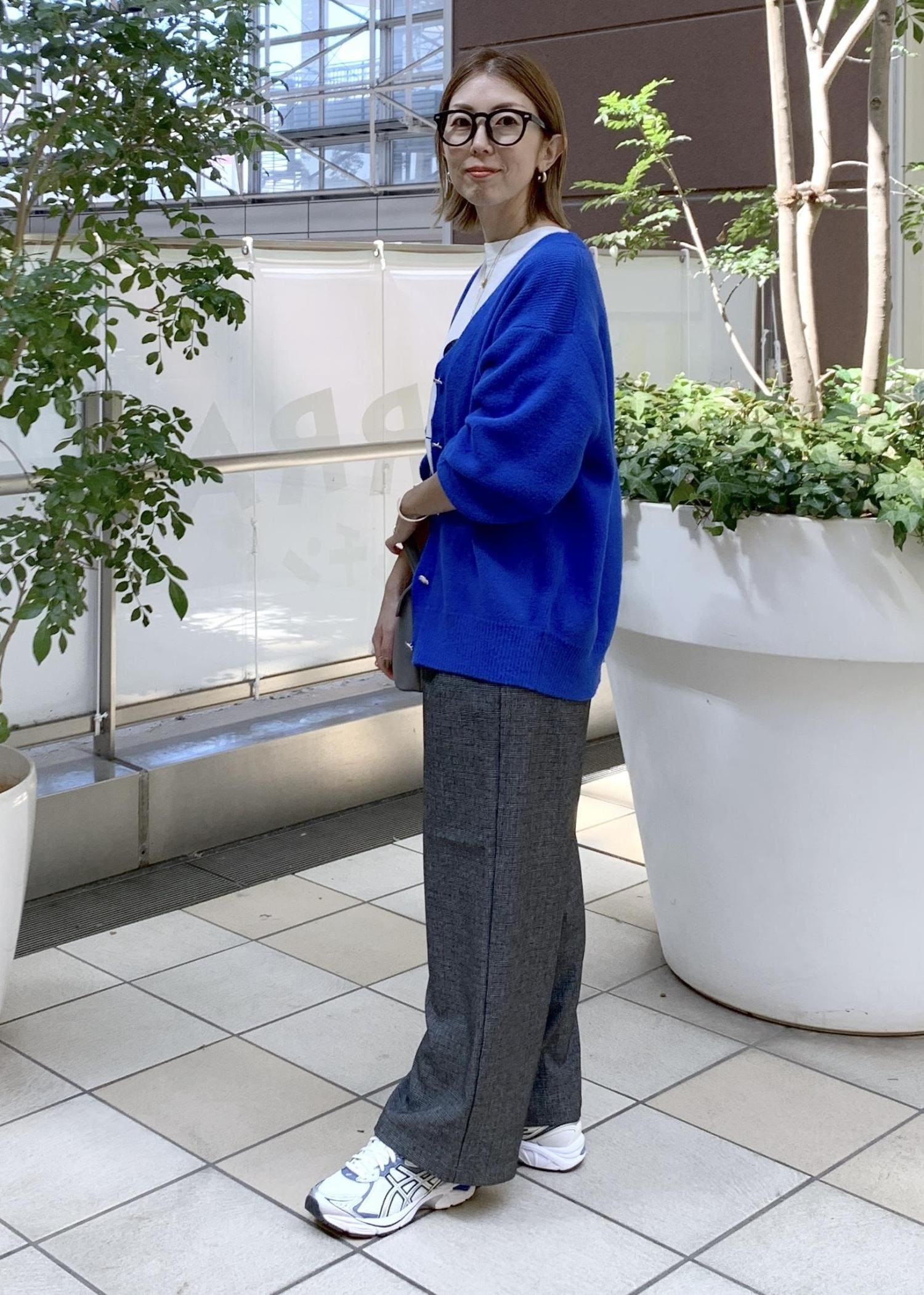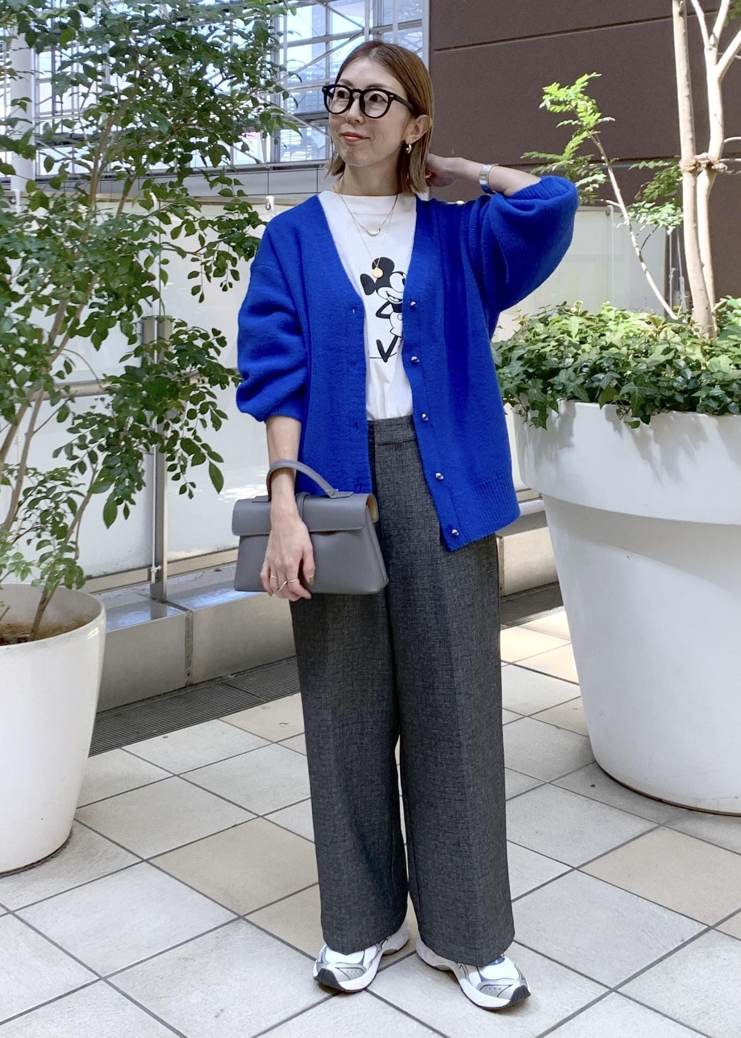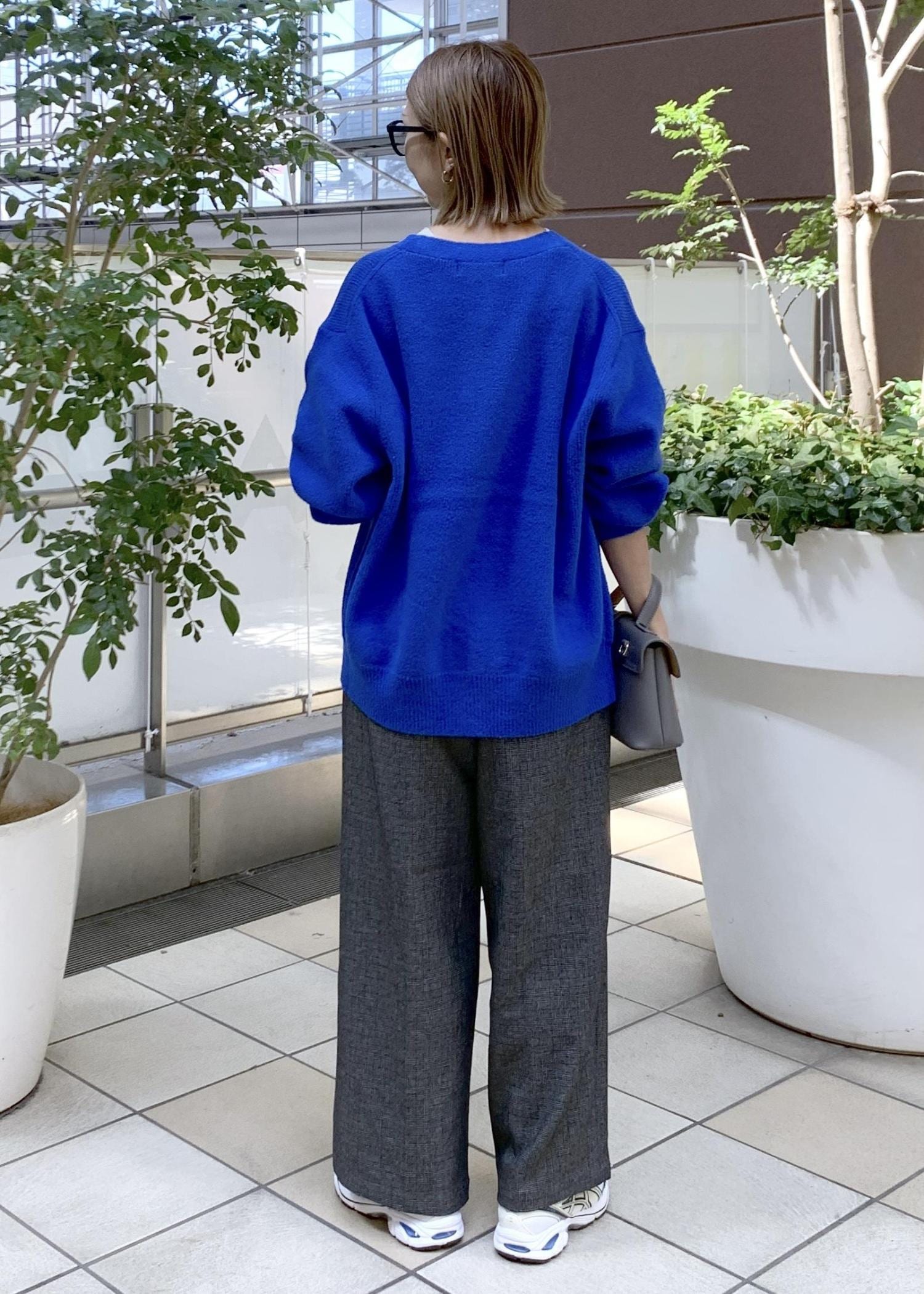 鮮やかなブルーが目を惹くミドル丈カーディガン。