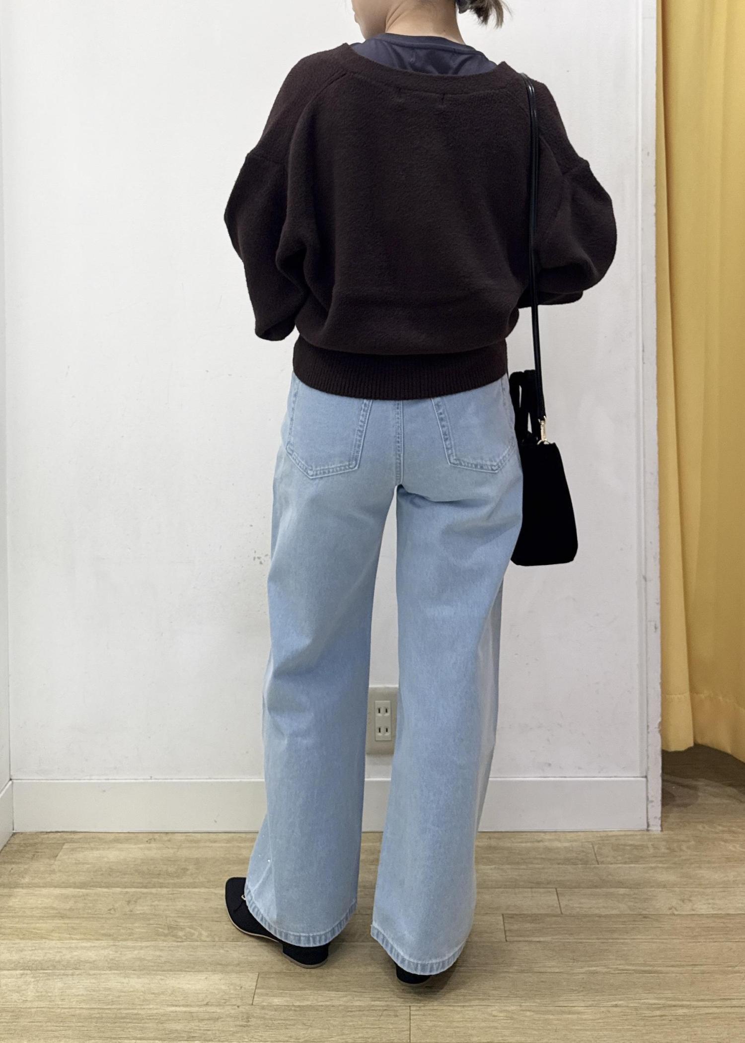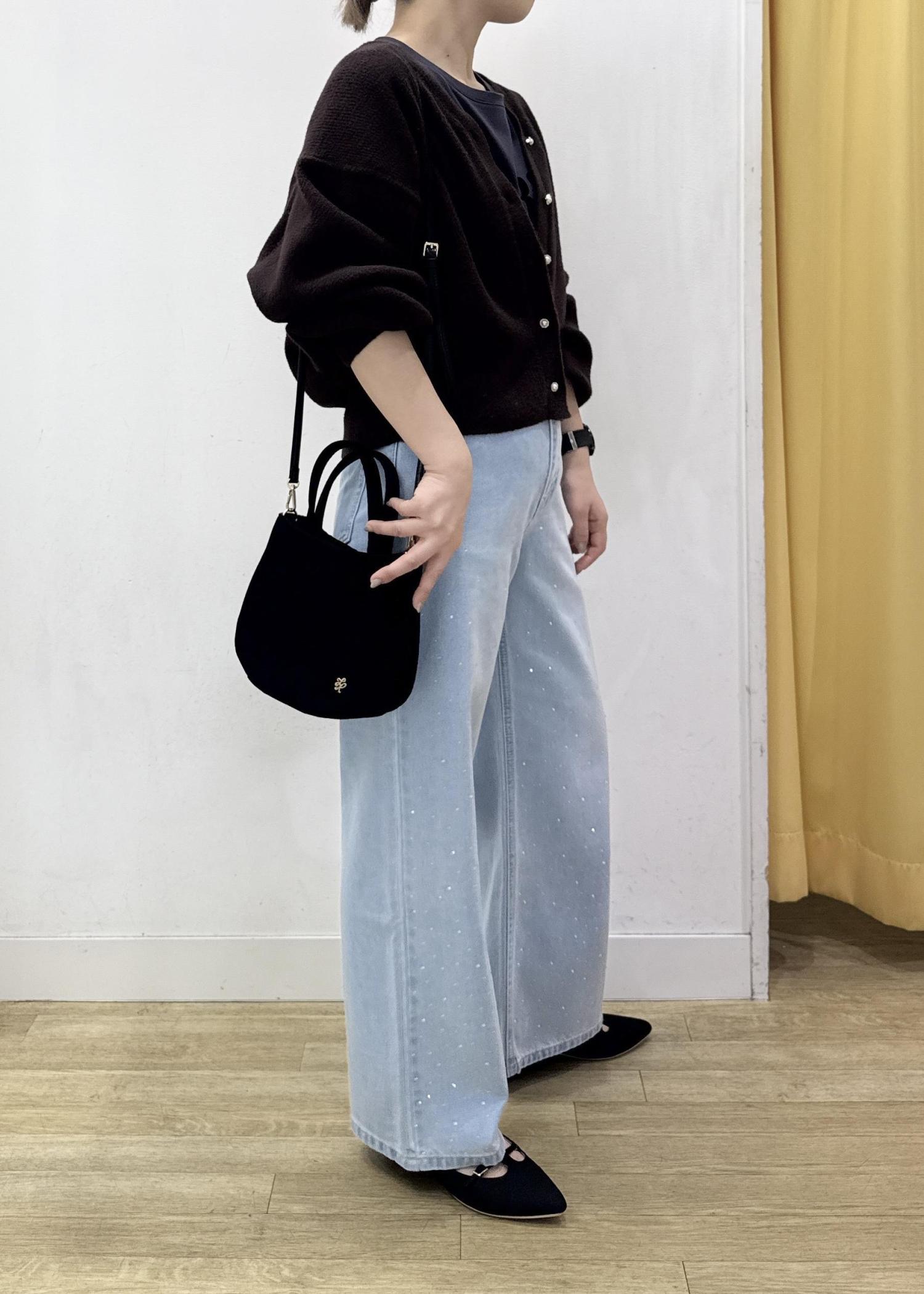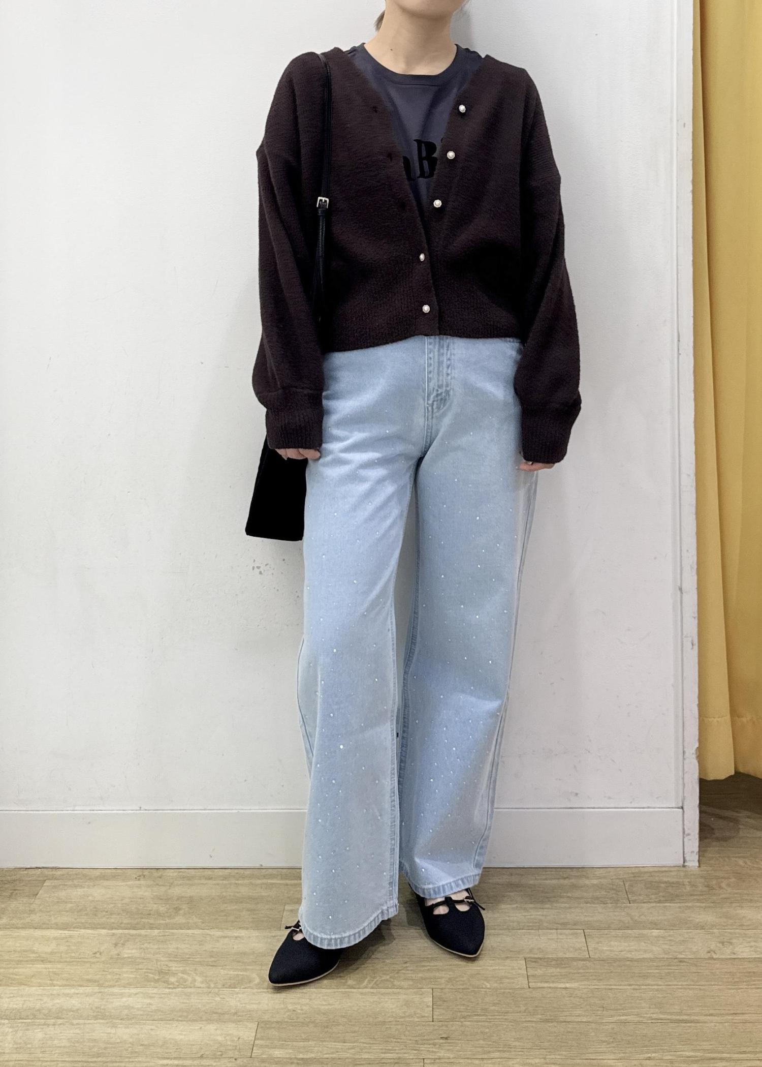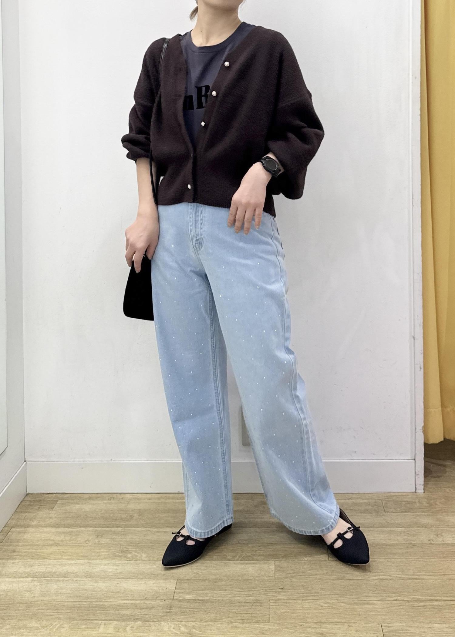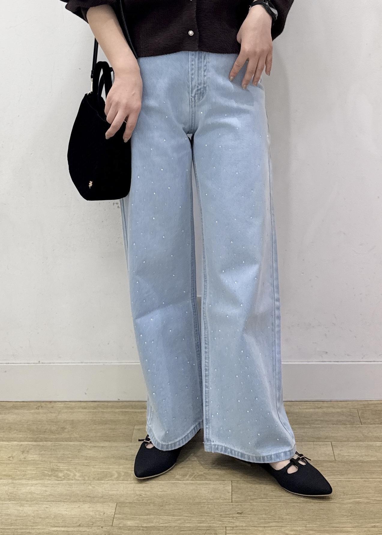 脚のラインは拾わないワイドシルエットで、カジュアルになりがちなデニムもビジューデザインで華やかに着ていただけます。