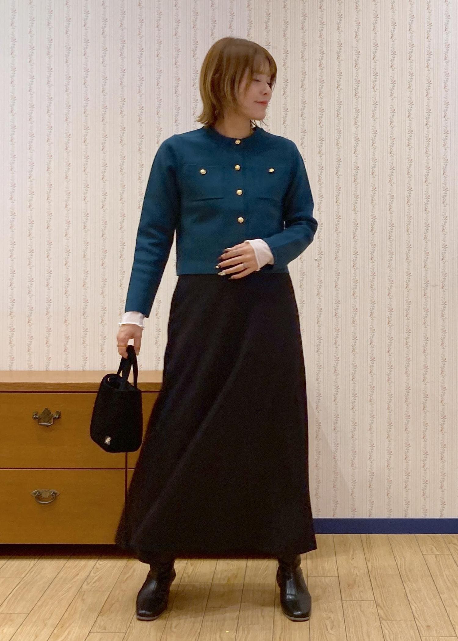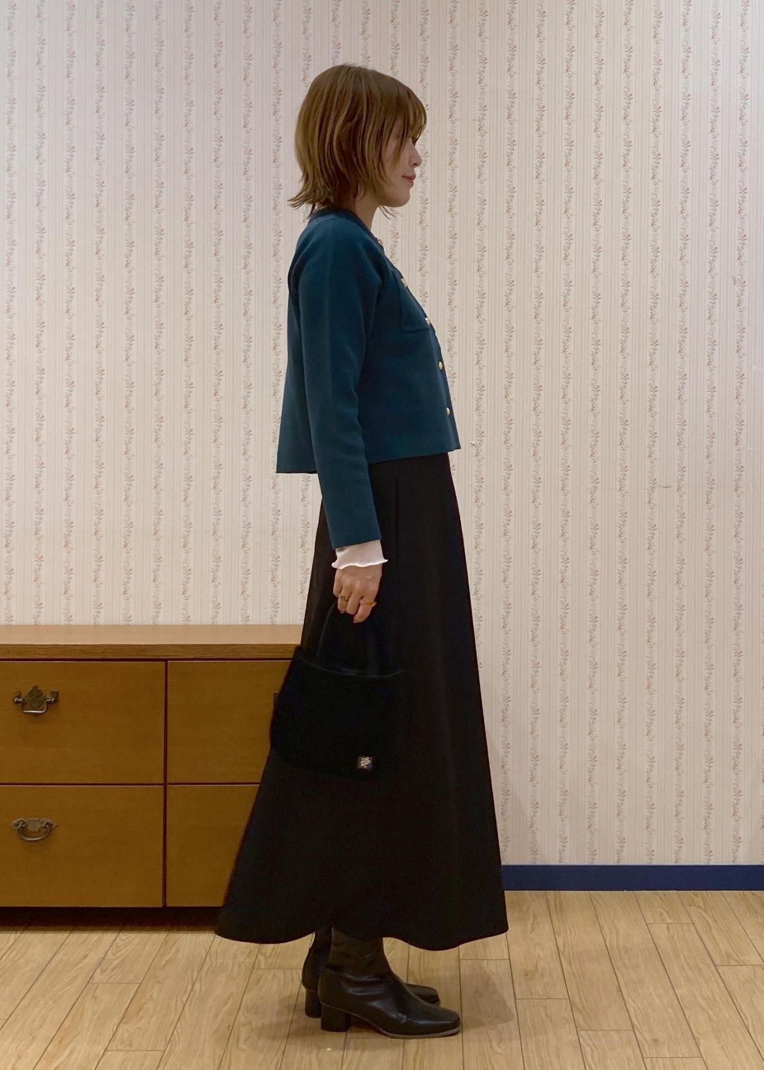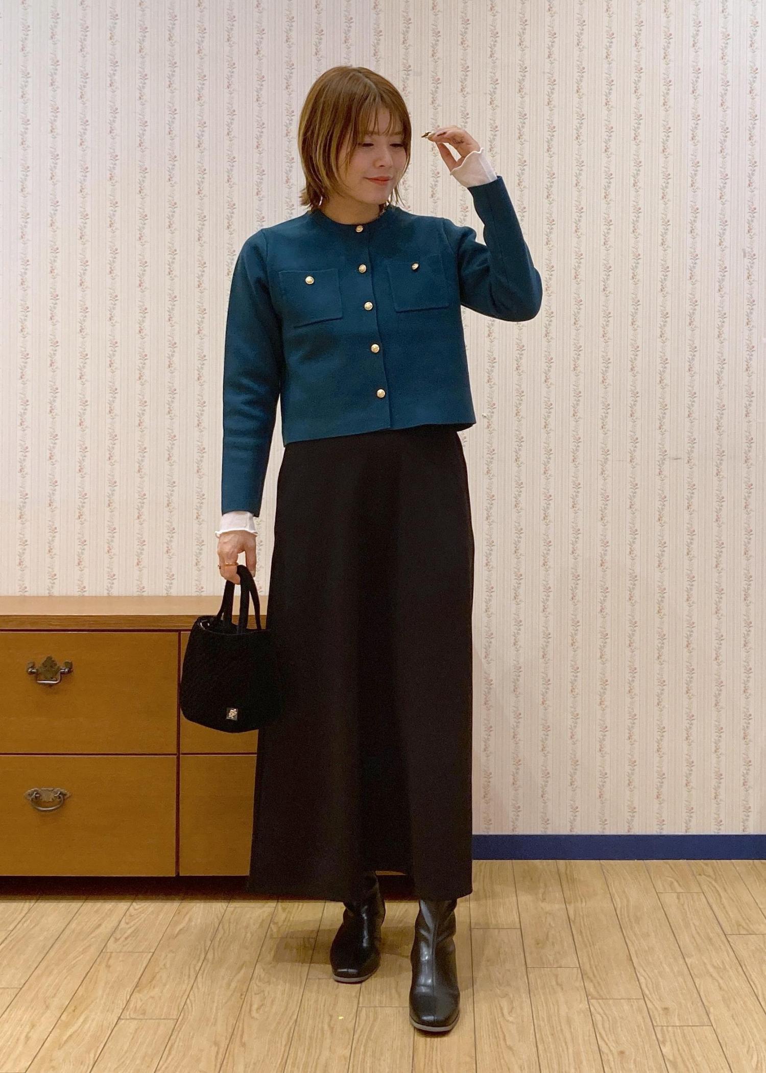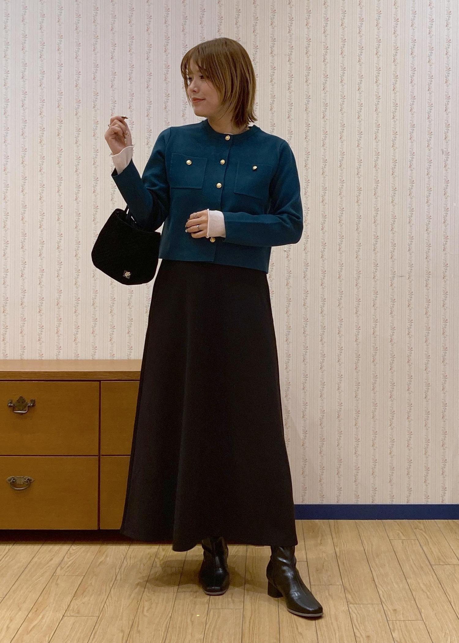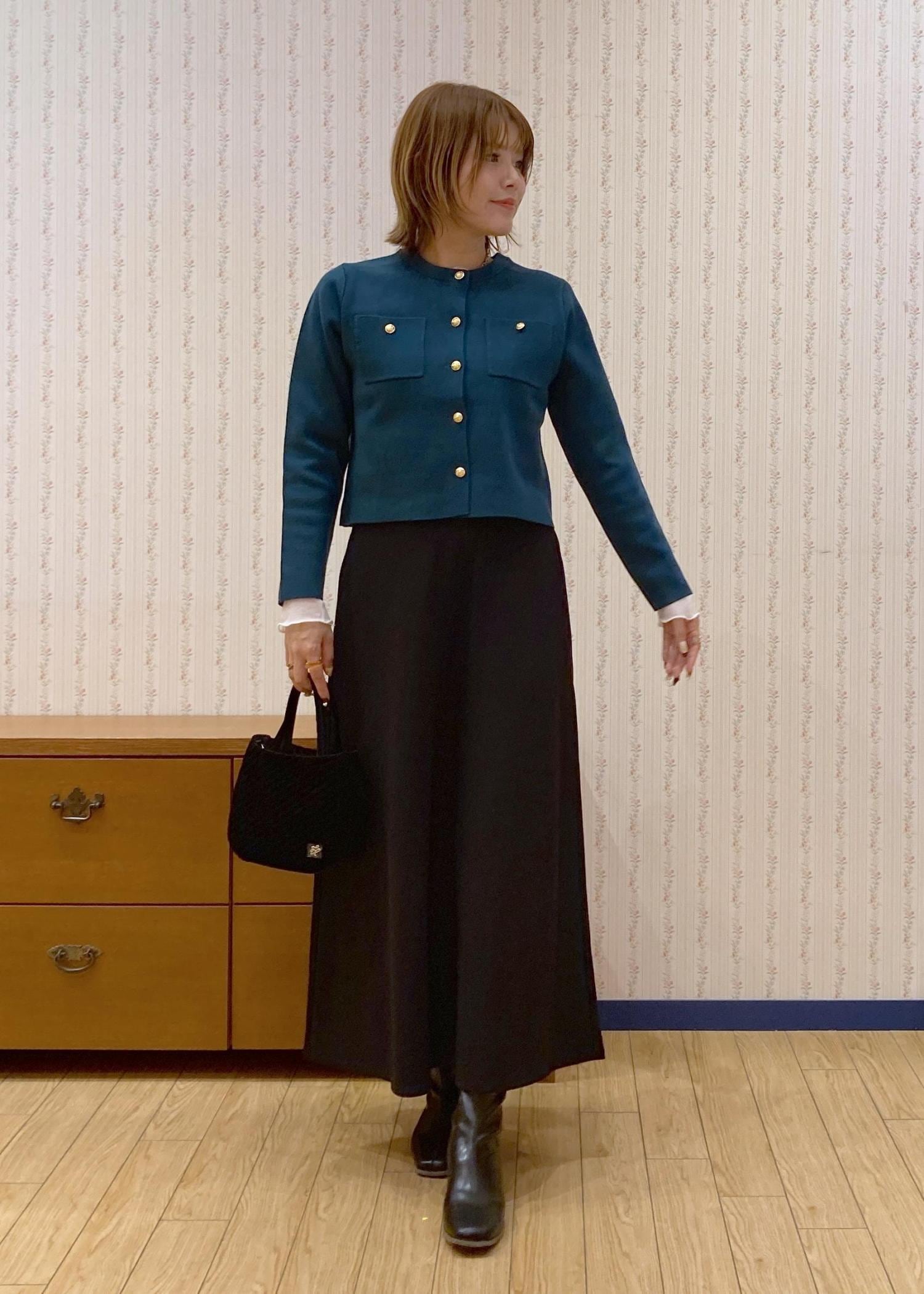カーディガン以外のアイテムはブラックでまとめて大人かわいく仕上げました。