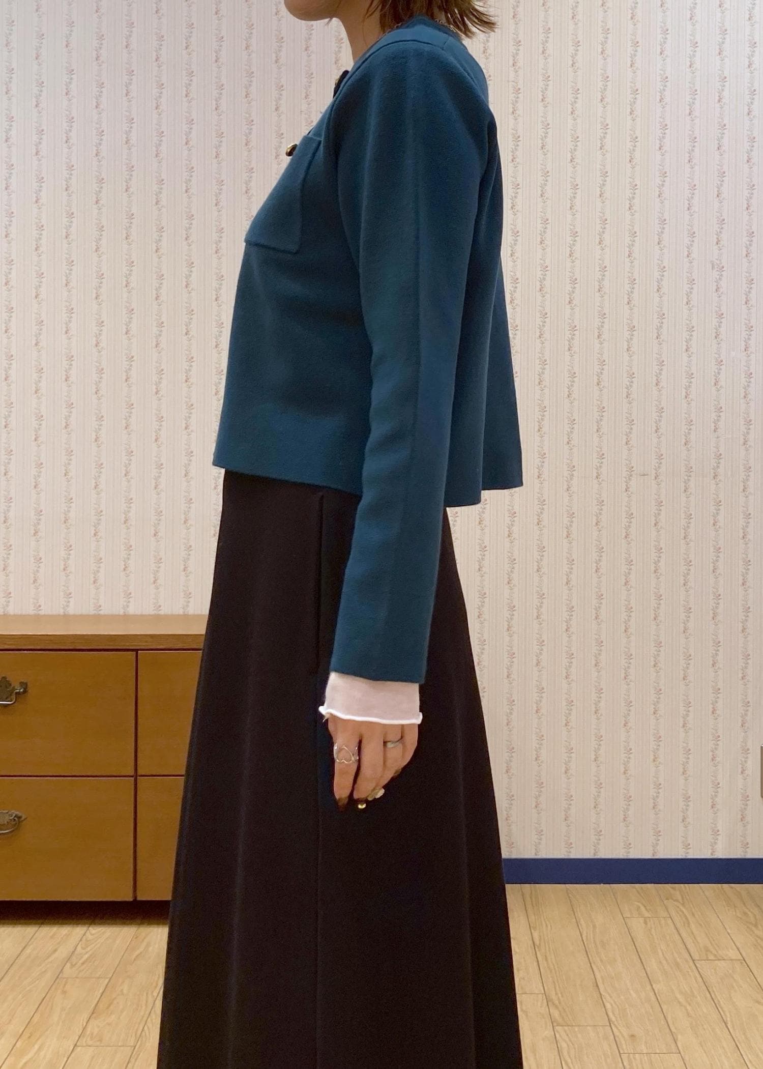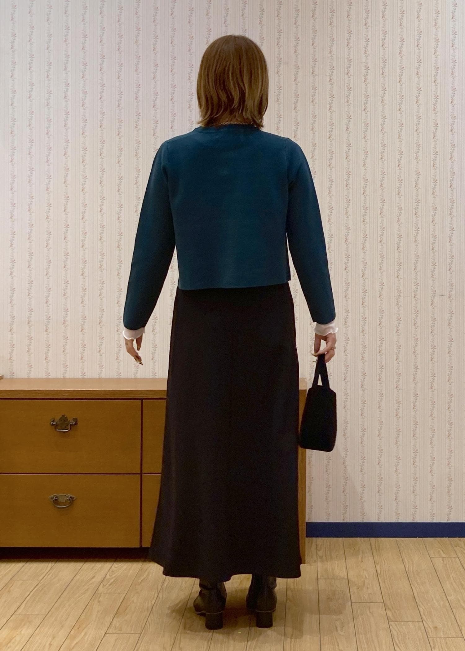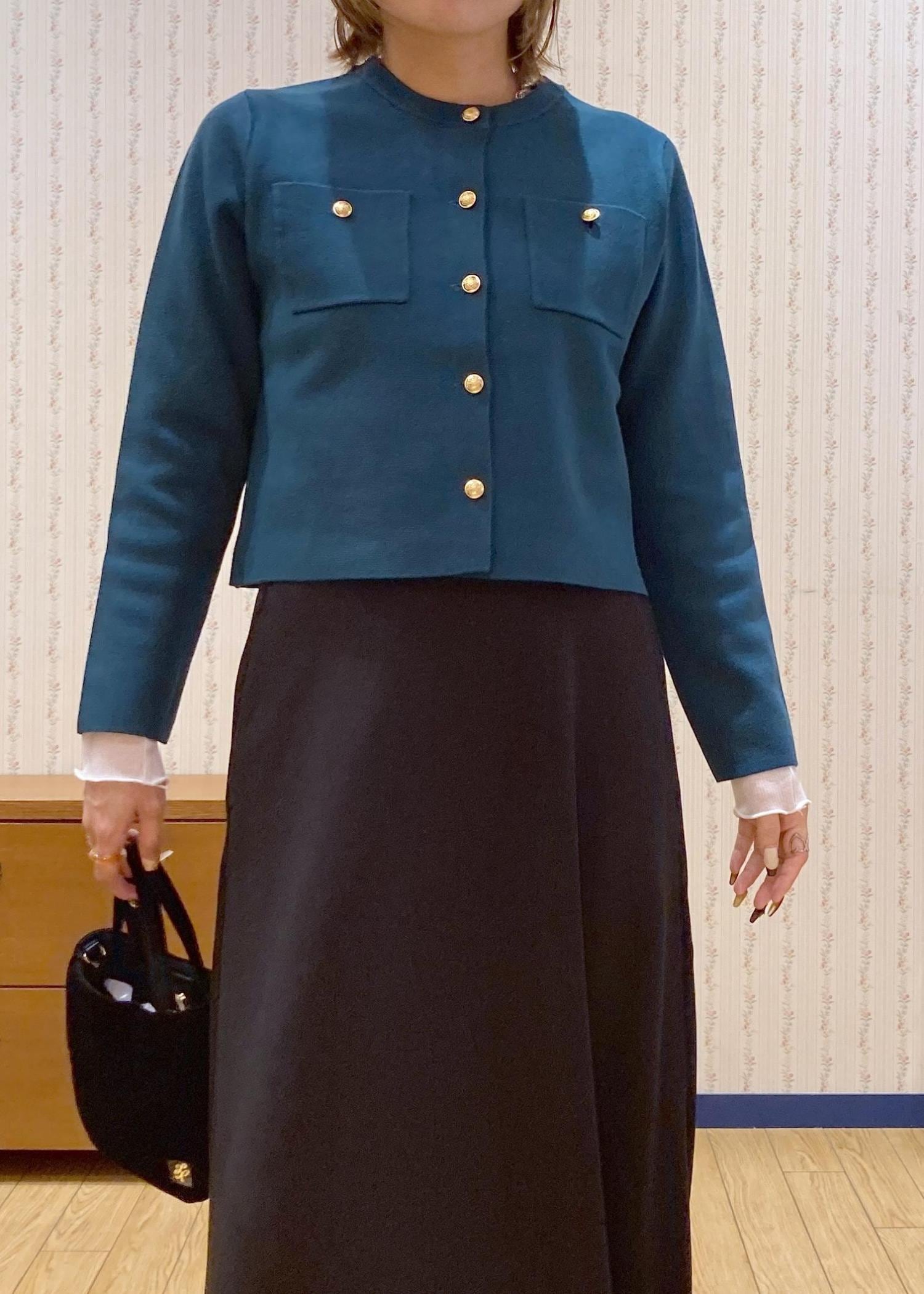 スッキリとした着丈のカーディガンなのでウエストインしなくてもスタイルアップして見えます!