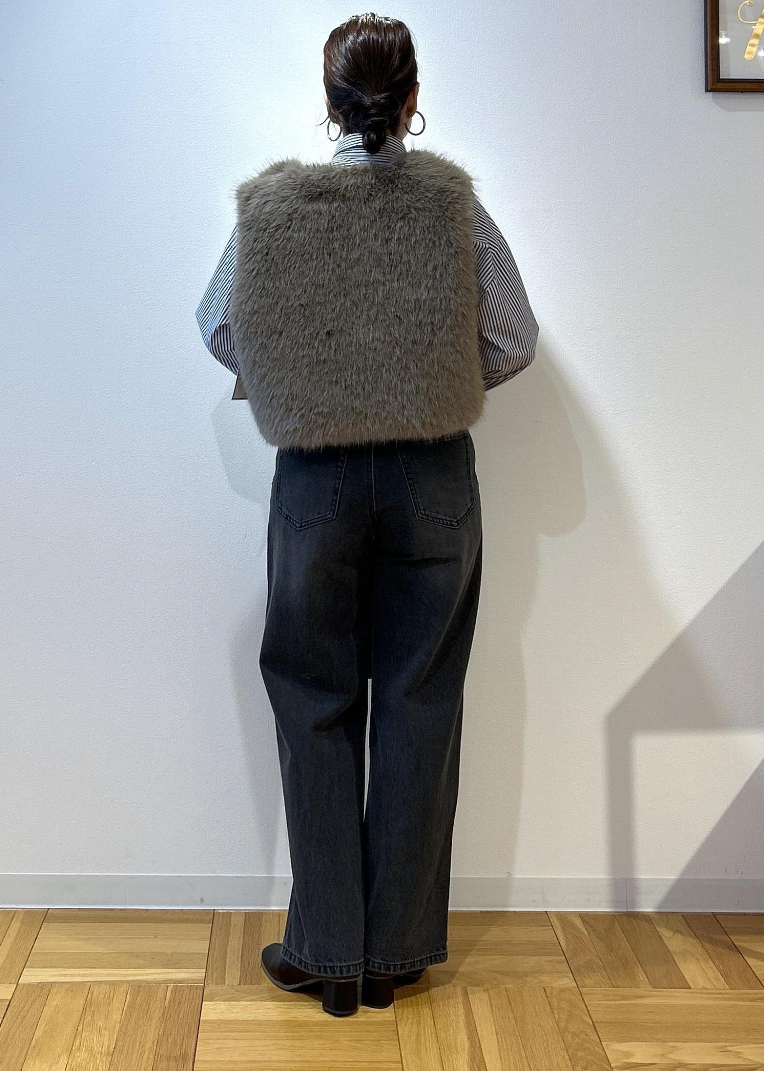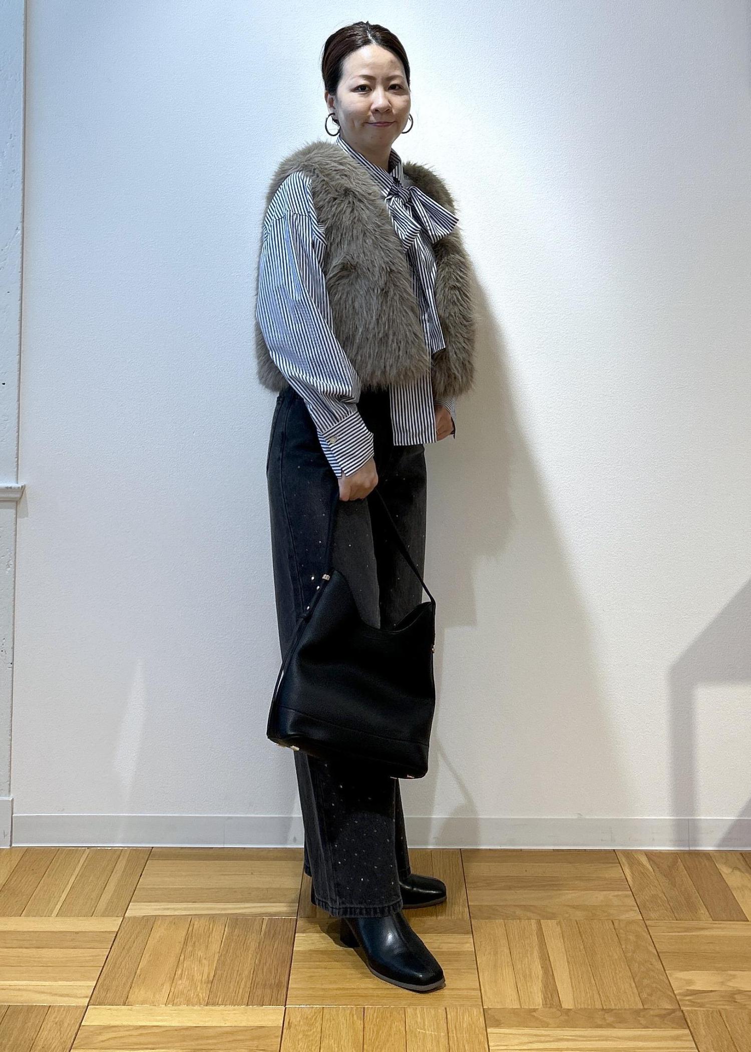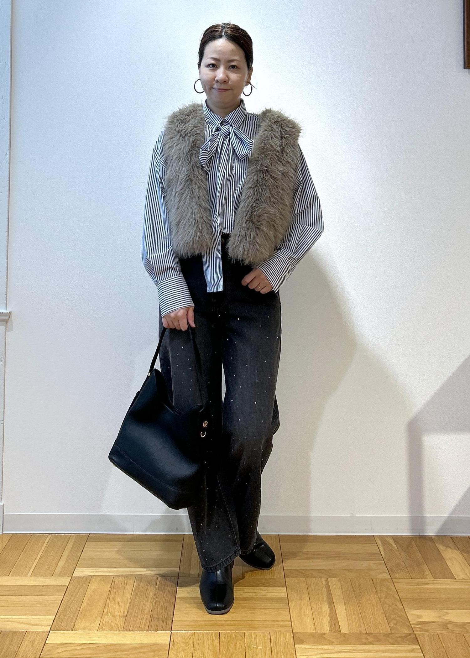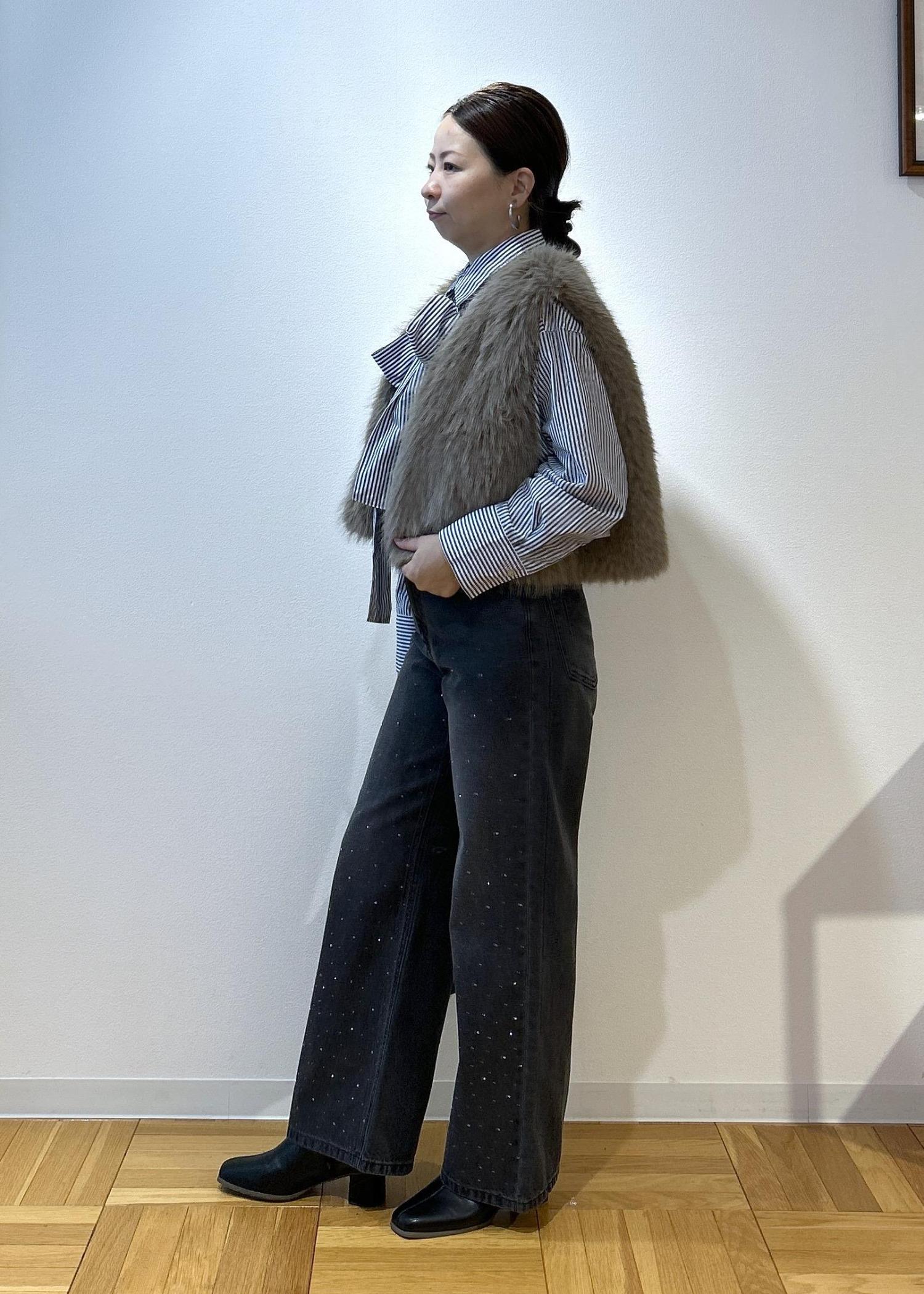 ROPÉ PICNICファーベストダークブラウン / F¥6,996レビュー着丈はウエストあたりで、コンパクトな丈感なので脚長効果も出してくれます。フアフア感が華やかさを出してくれますし、一気にオシャレ感がでます!