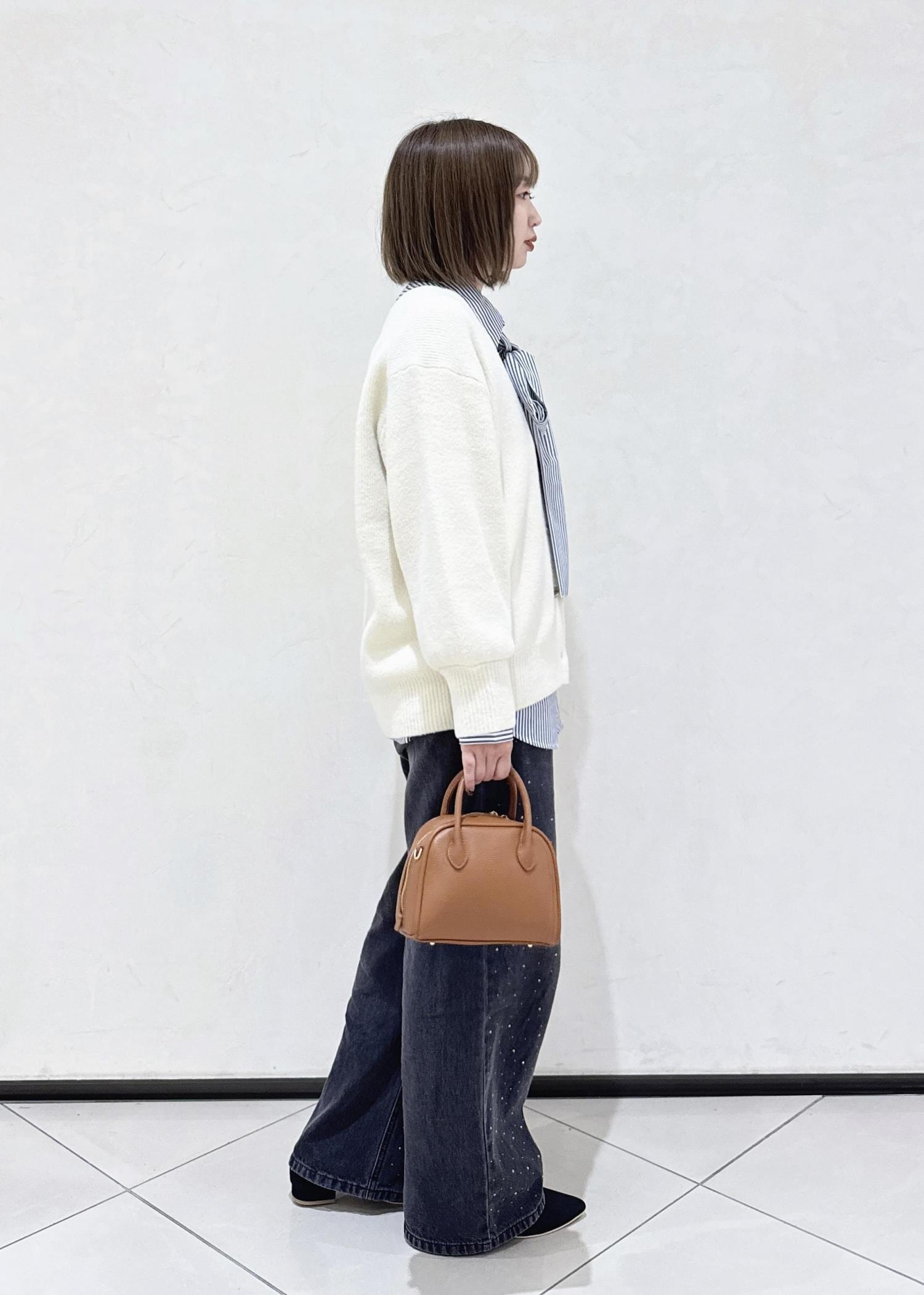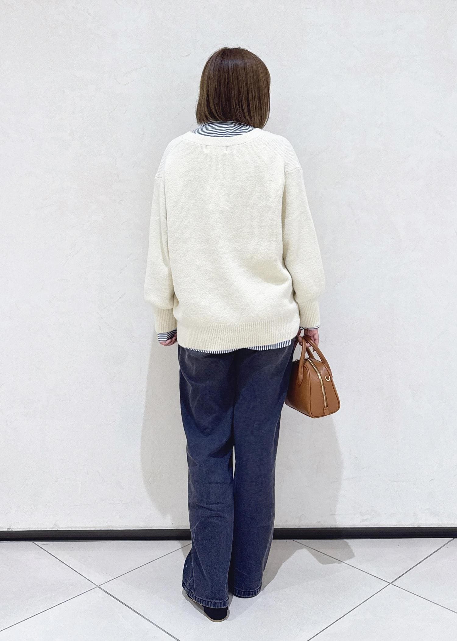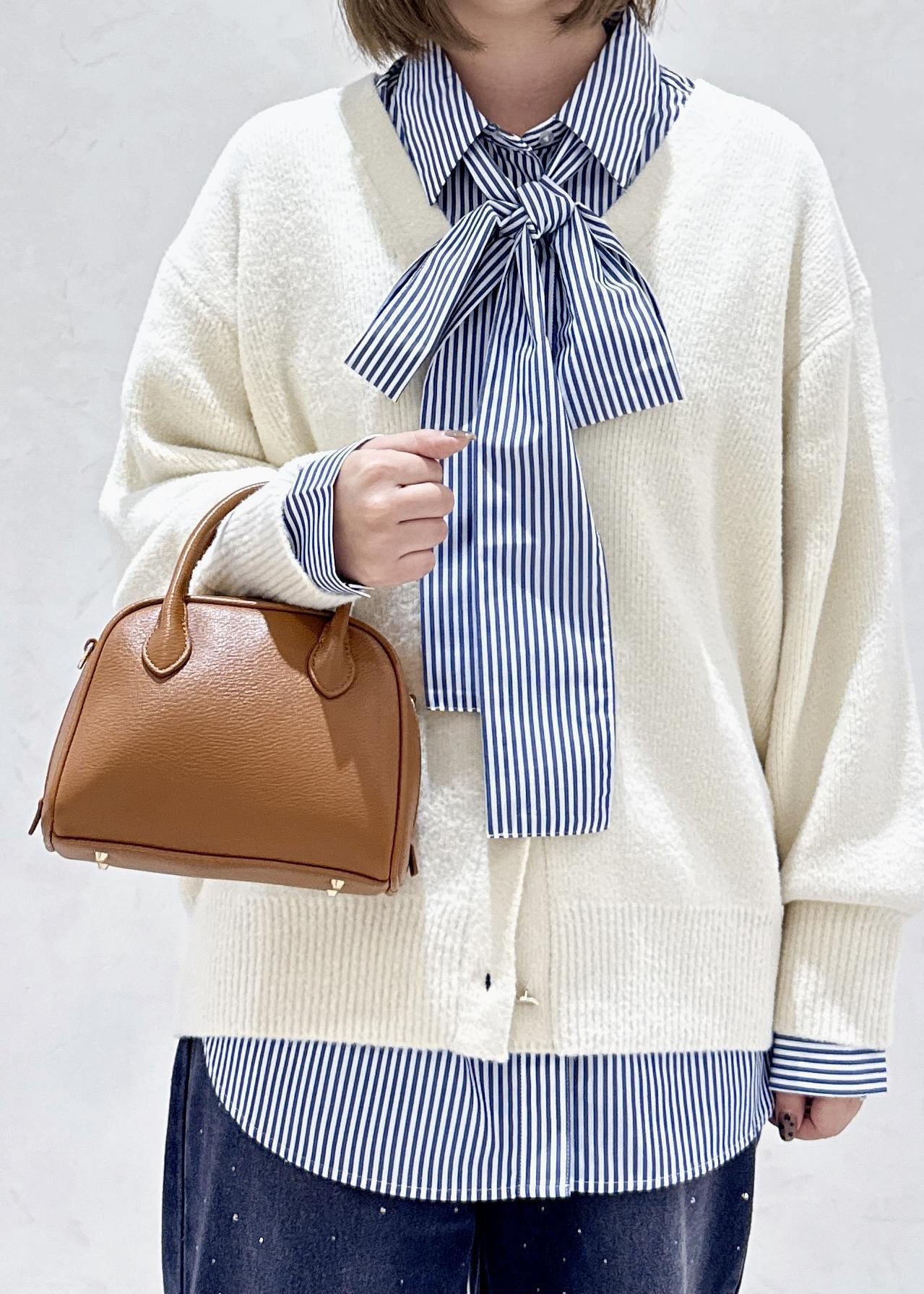 シンプルなVネックカーディガンにリボンシャツを合わせて、シンプルになりすぎないコーデに◎