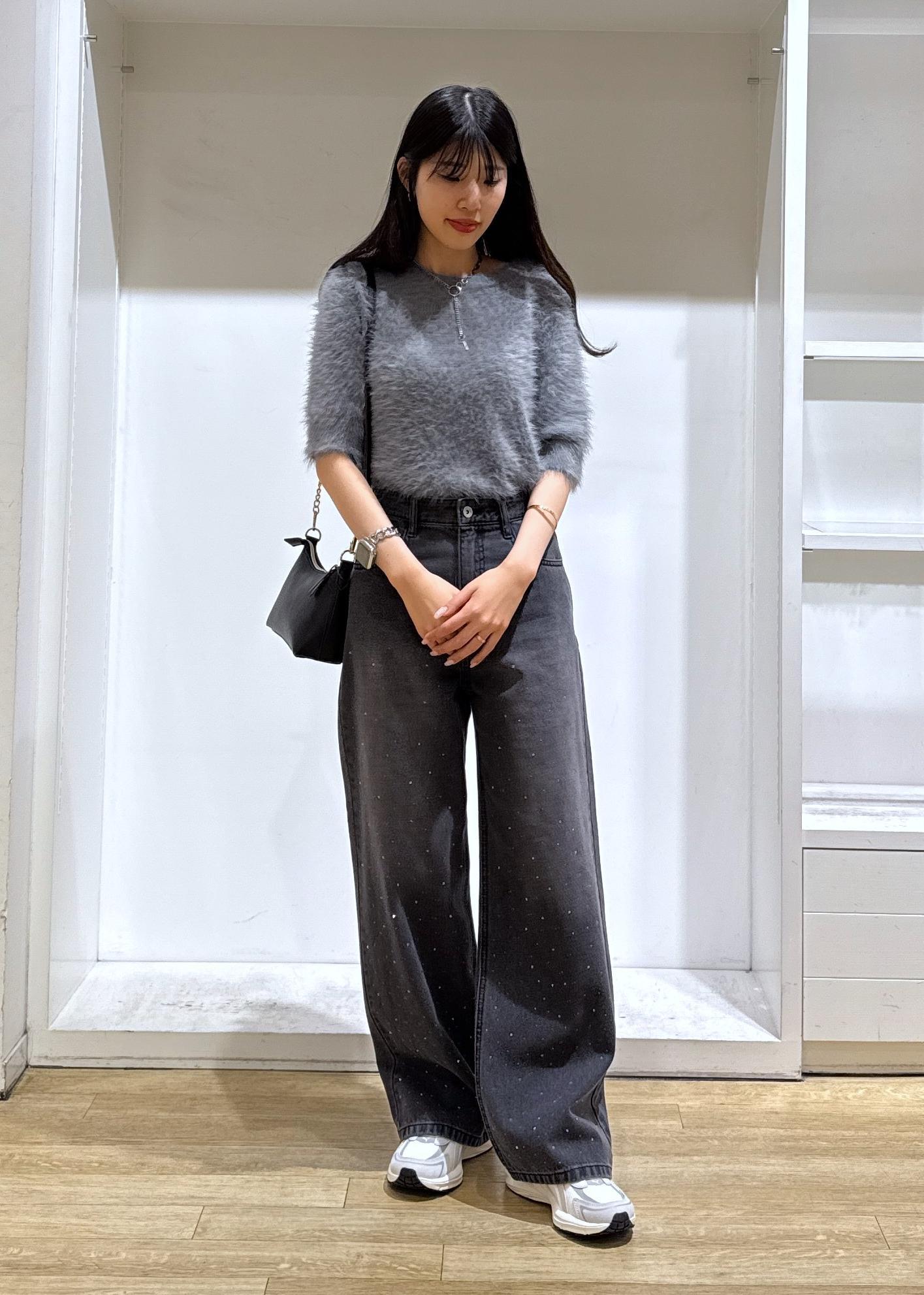 トップスはシンプルですが、フェザー素材が寂しくなりにくく